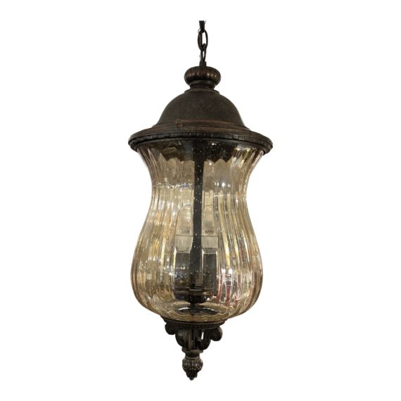 Design Plus Gallery presents a Traditional Metal + Glass Two-Light Pendant. The body is constructed with dark rustic finish. It has a four-way spiral accent on the bottom. The two bulb sockets are surrounded by a seeded glass shade with a ripple texture. Uses two candelabra bulbs. Minor wear consistent with age + use; pendant is in good condition.