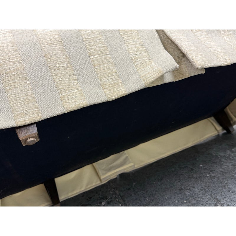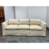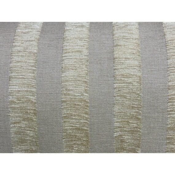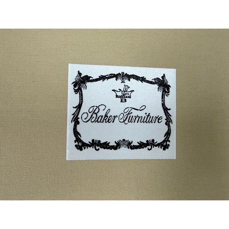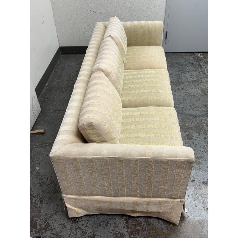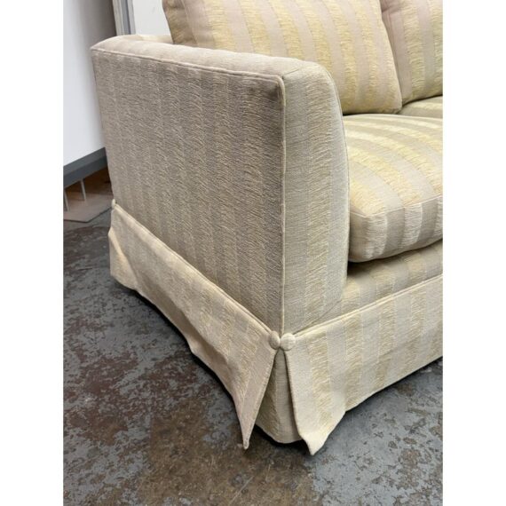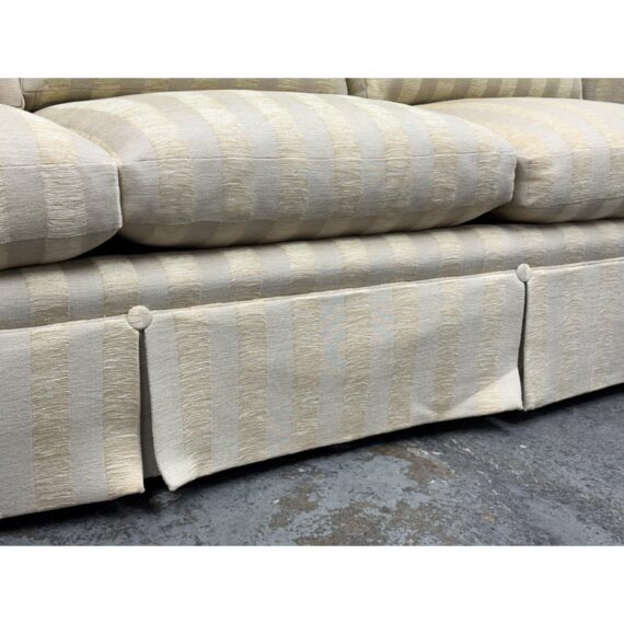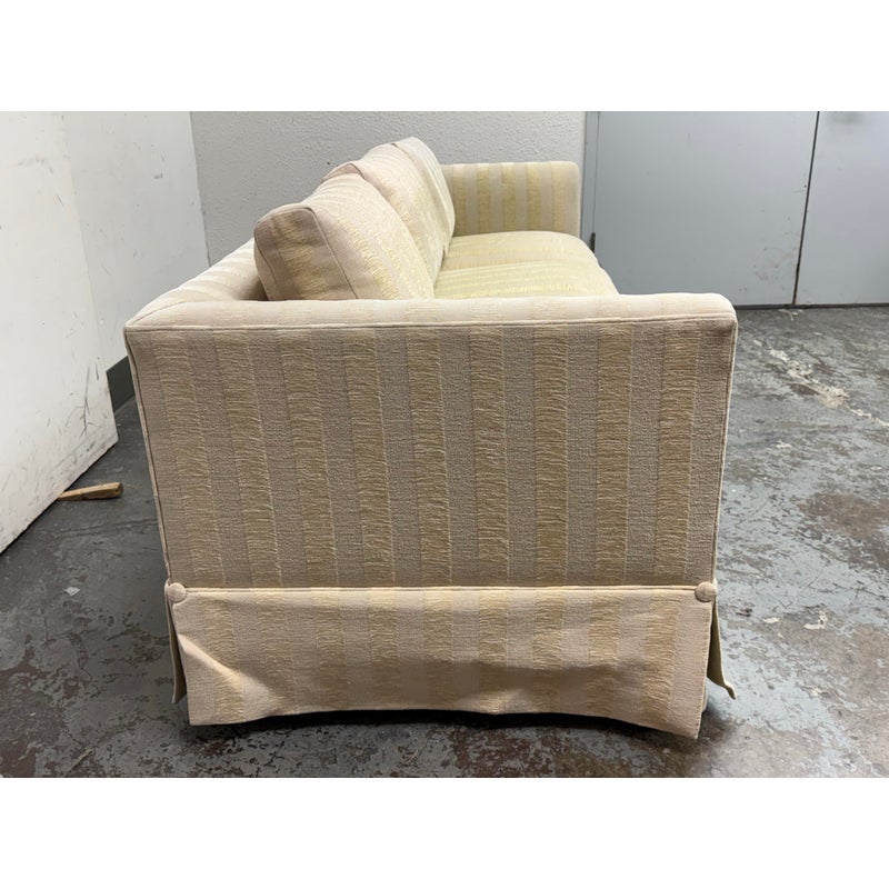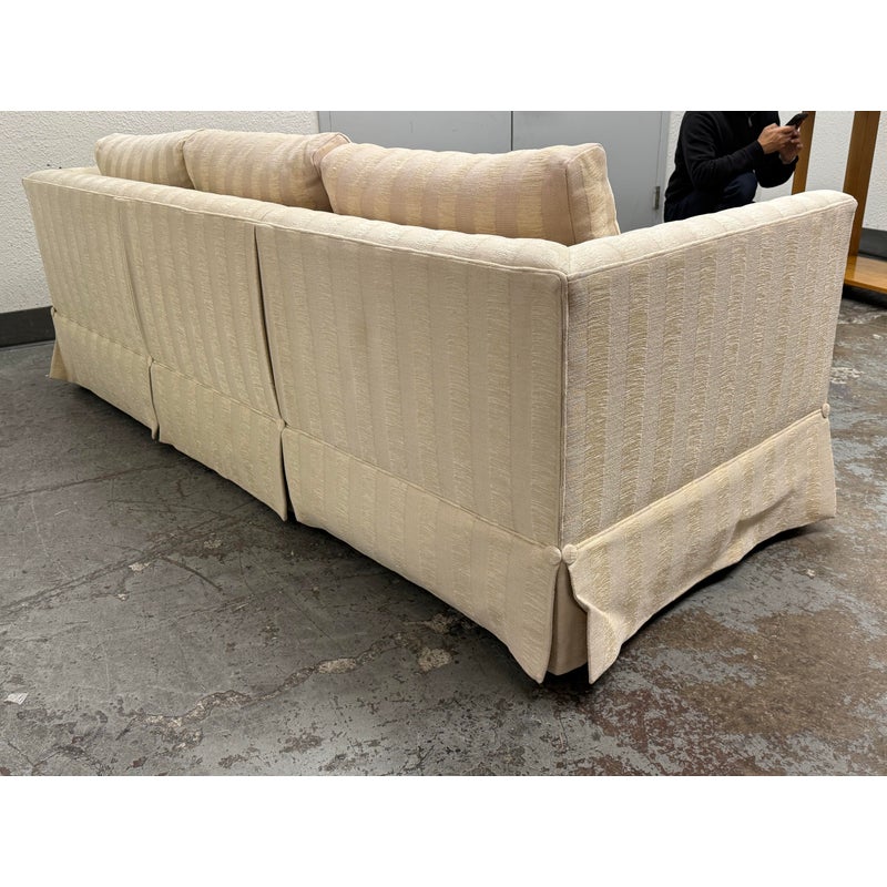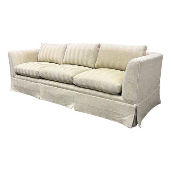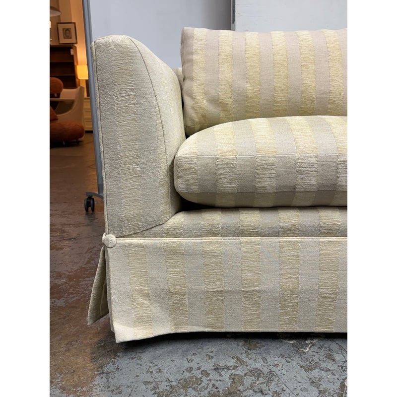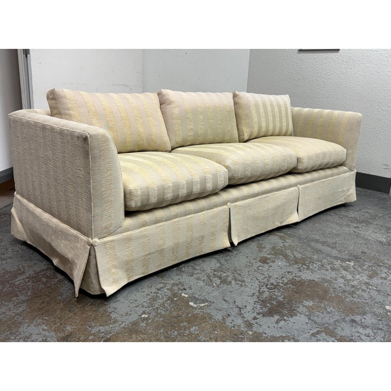 Design Plus Gallery presents a Silk Shantung Striped Sofa from Baker Furniture. The sofa will blend into any conservative home with great presence and comfort. The easy going piece has neutral striping of off white with a champagne even spaced on the entirety of the sofa and its loose pillows. There are three seat cushions, with three back cushions, and a skirt all matching with the becoming sheen of its stripes. There is surface wear such as sun fade that is consistent with its usage.
