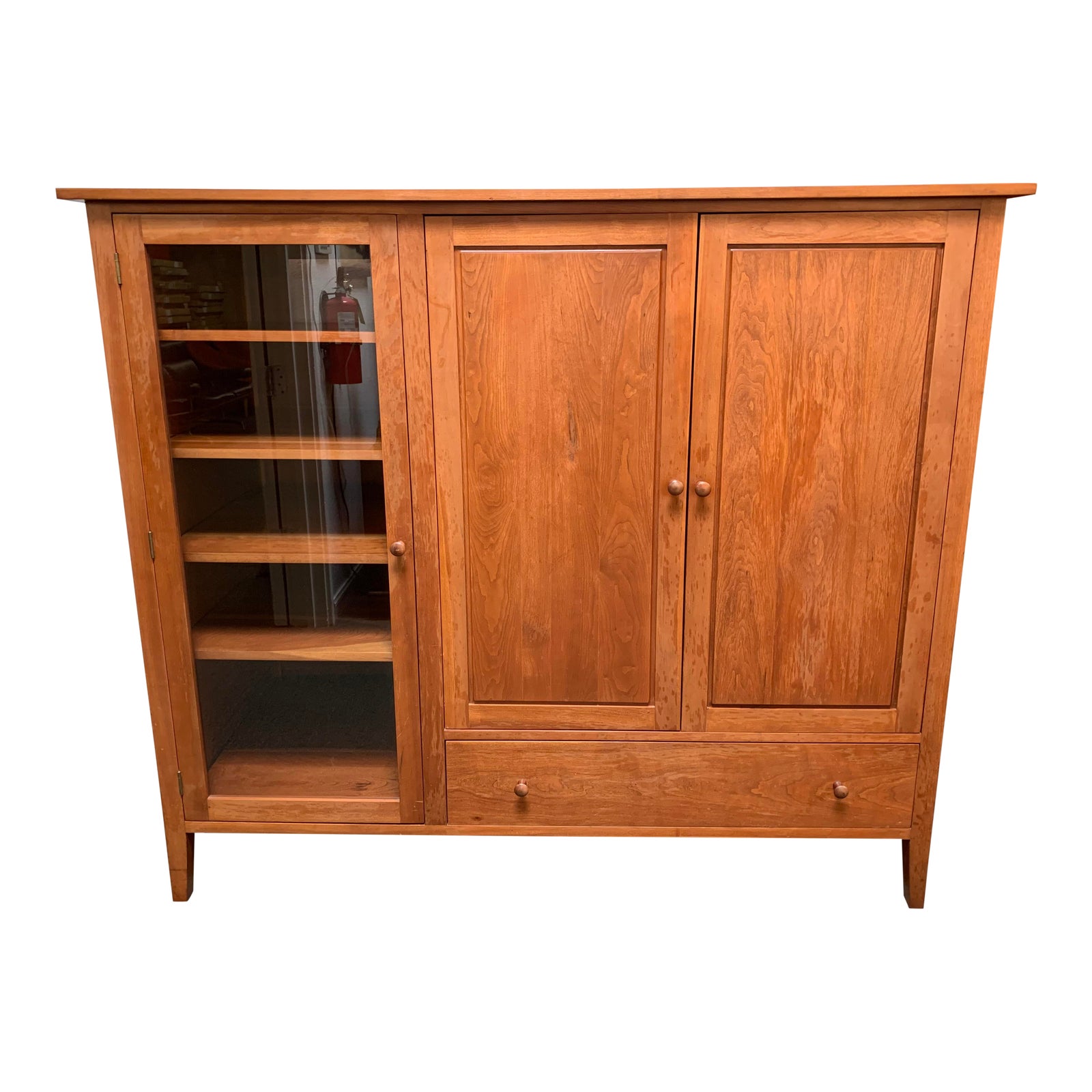 Design Plus Gallery presents a Large Media Cabinet by Ethan Allen. Beautiful solid cherry wood makes up this roomy cabinet. Five adjustable/removable shelves behind the glass door, a fixed platform behind the solid doors for television or bar. Large drawer at base, cord access. Finish is less than perfect.