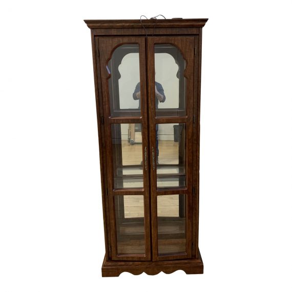 Design Plus Gallery presents a Traditional Wood + Glass Display Cabinet. Black splatter textured walnut stained oak framing surrounds glass panels. Single display light inside top of unit with mirrored back add brightness and depth. Nicely narrow and shallow scale makes for easy fitting in a variety of spaces. Comes with two fixed shelves however one is missing a glass panel. Brass hardware on doors.