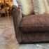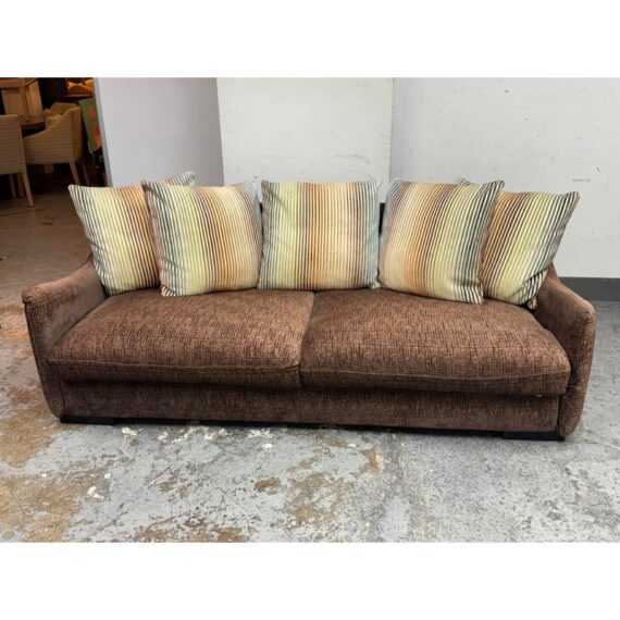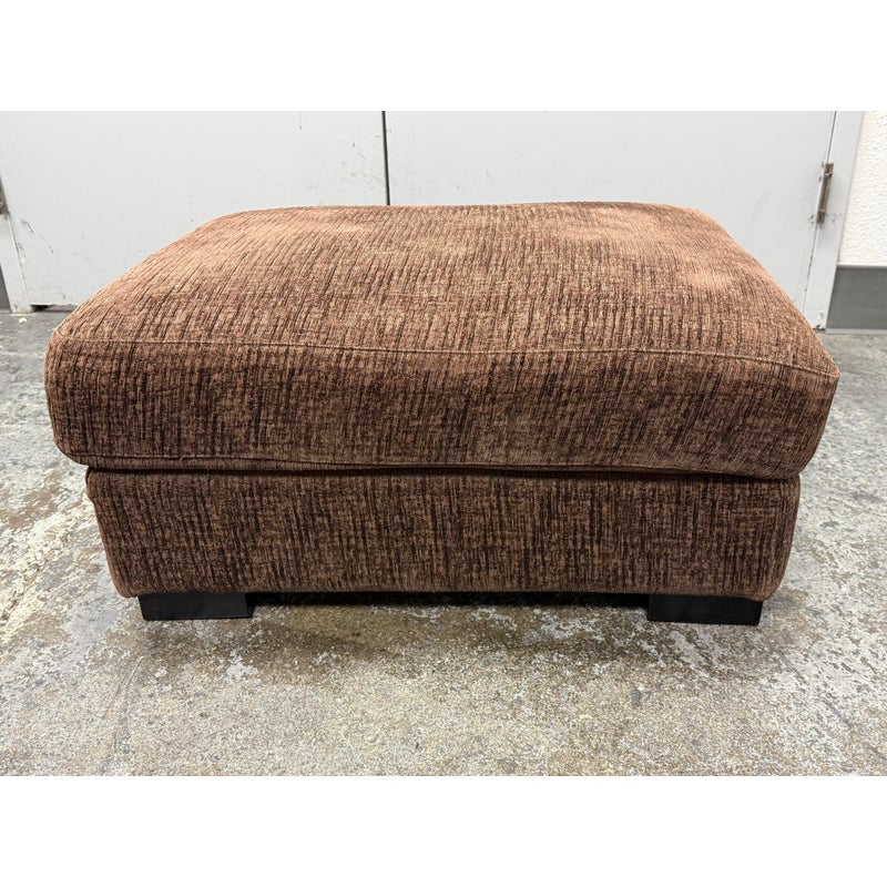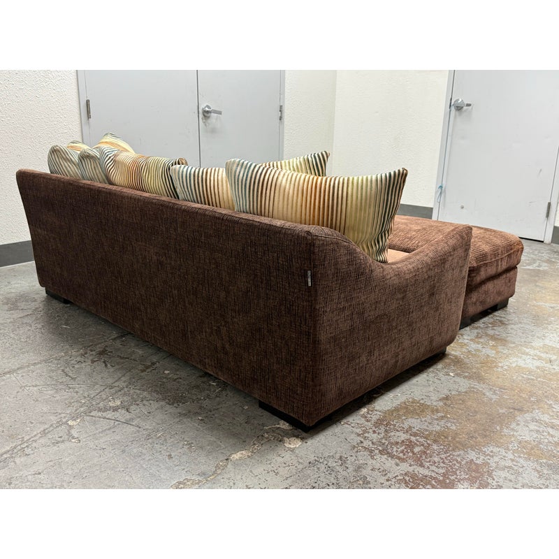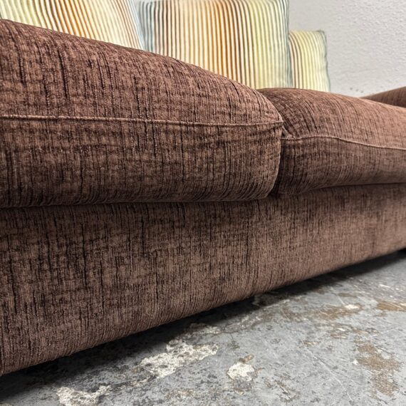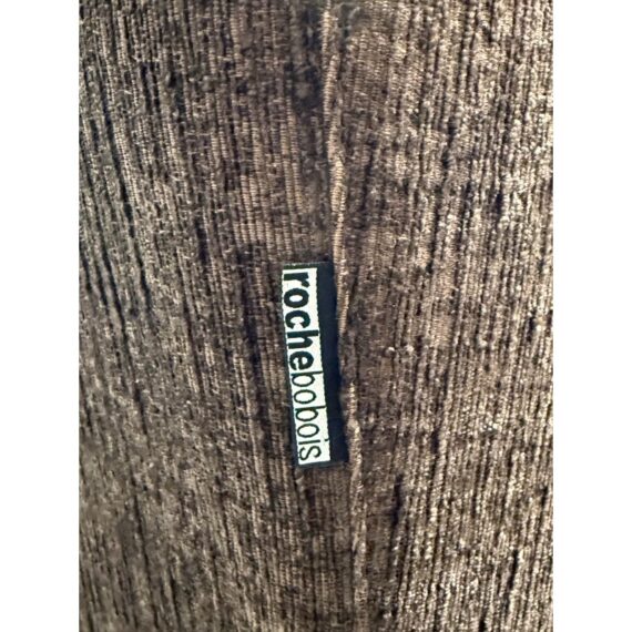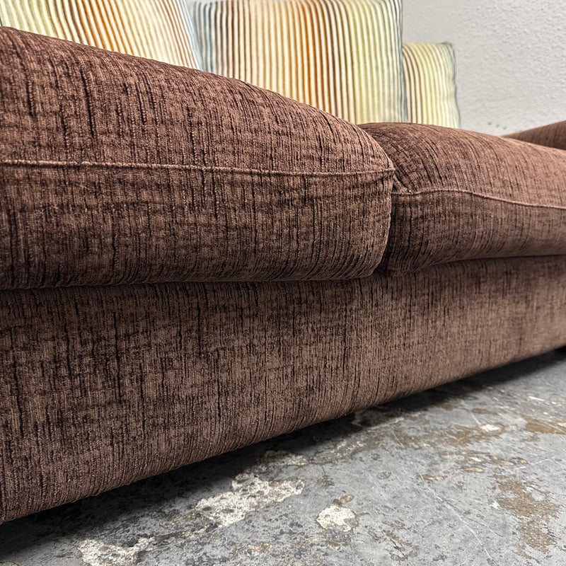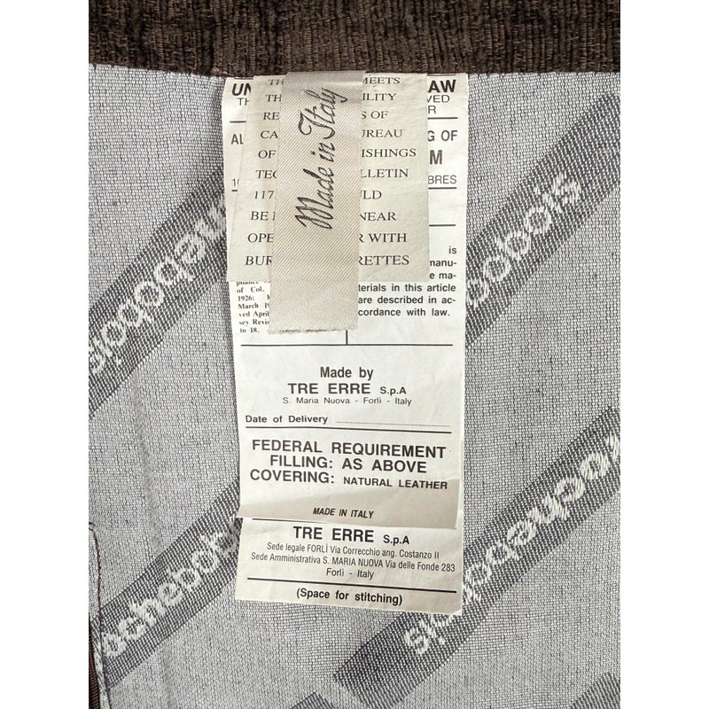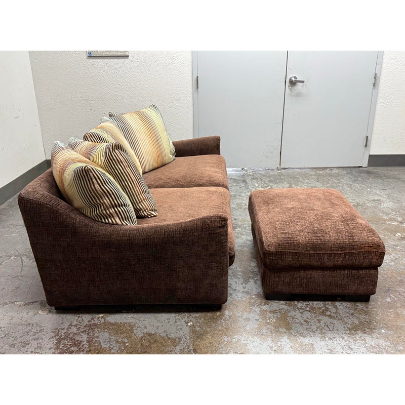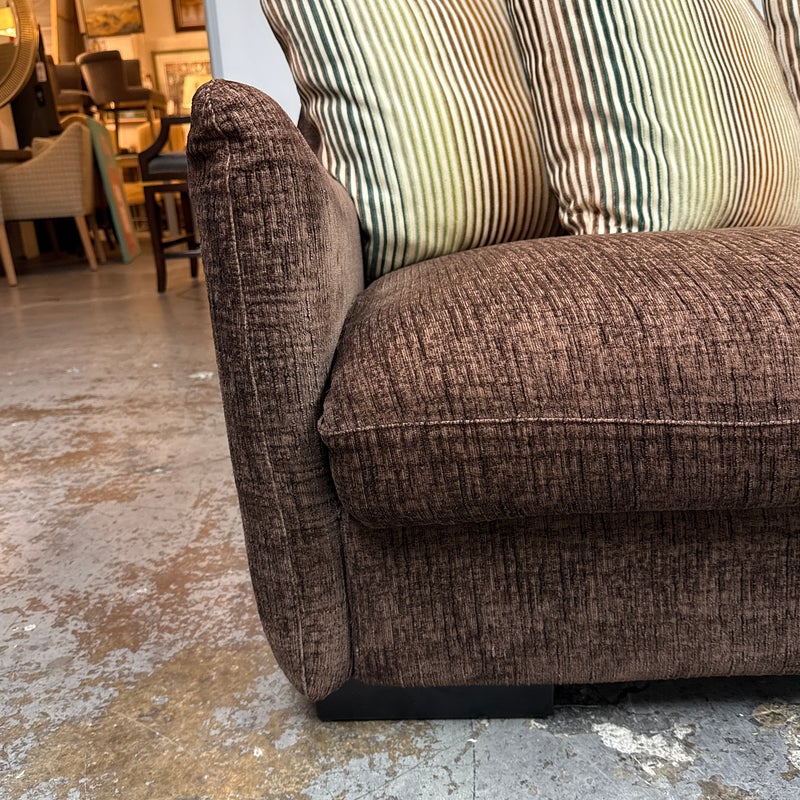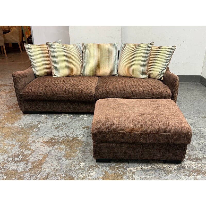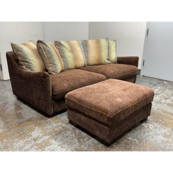 Design Plus Gallery presents a Corded Chenille Sofa + Ottoman Set from Roche Bobois. Manufactured by Tre Erre. The roomy sofa has a cocoon effect with its high + deeply padded arms, like getting wrapped up into a couch hug if we do say so. Ottoman + 5 striped throw pillows round out this handsome grouping. These two styles have been discontinued by the brand. Overall is in good condition surface wear to the upholstery that is consistent with usage. Slight discoloration from sun exposure. Made in Italy.