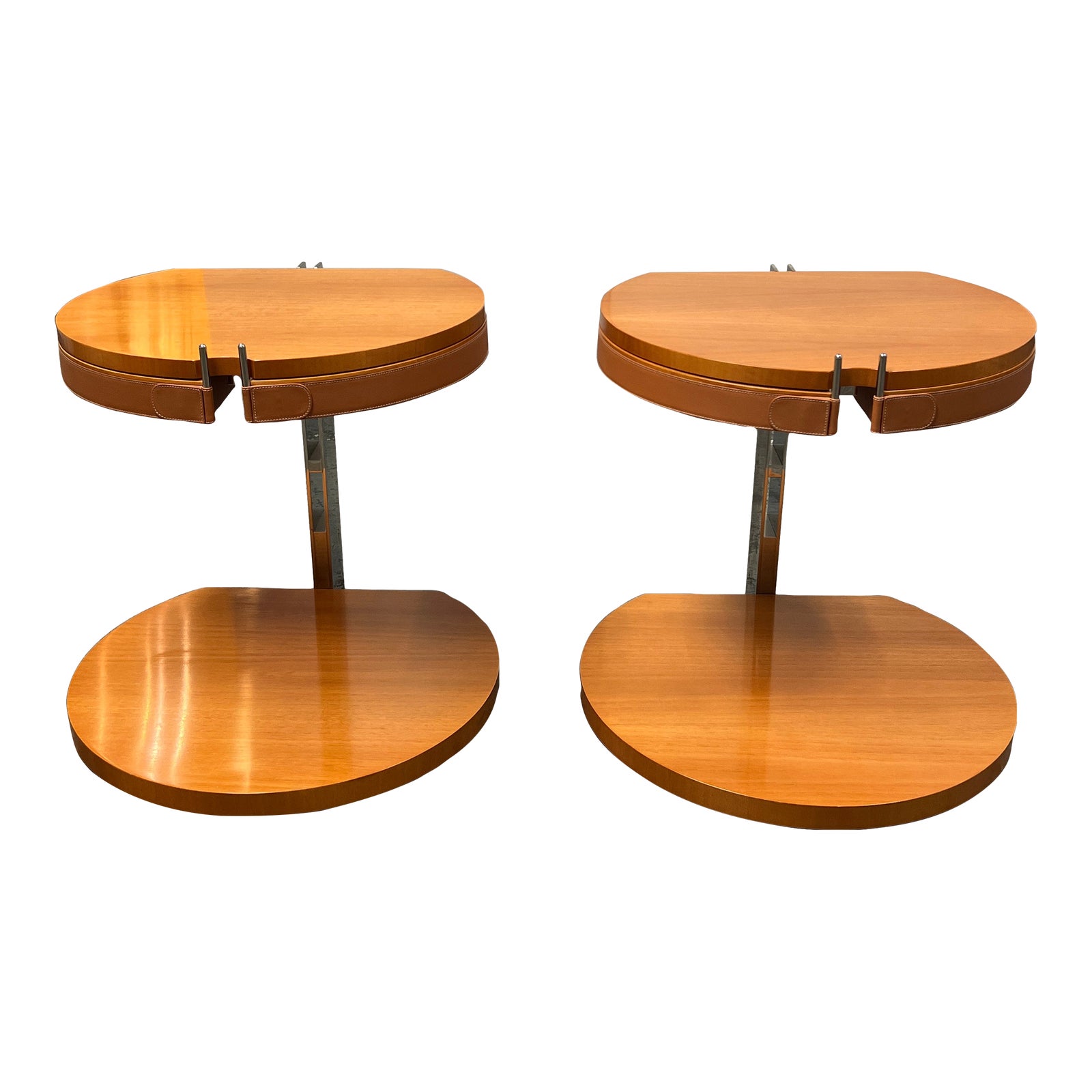 Design Plus Gallery presents a Pair of Imagine Side Tables by Tresserra Collection. Designed by Jaime Tresserra Clapés in 1995. A auxiliary table with a structure in stainless steel. The top and base is in a light finish walnut. Two pivoting side drawers in a hazelnut vaquetilla leather. Visible and minor wear from usage + age. Made in Barcelona, Spain.