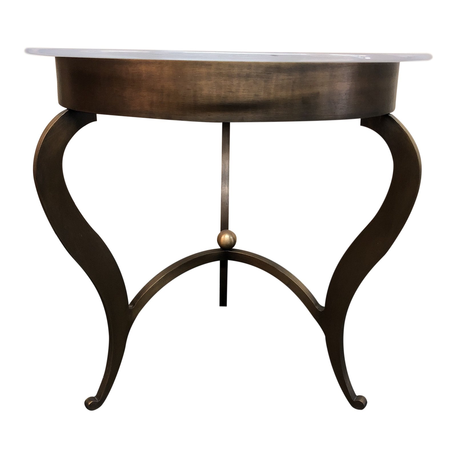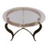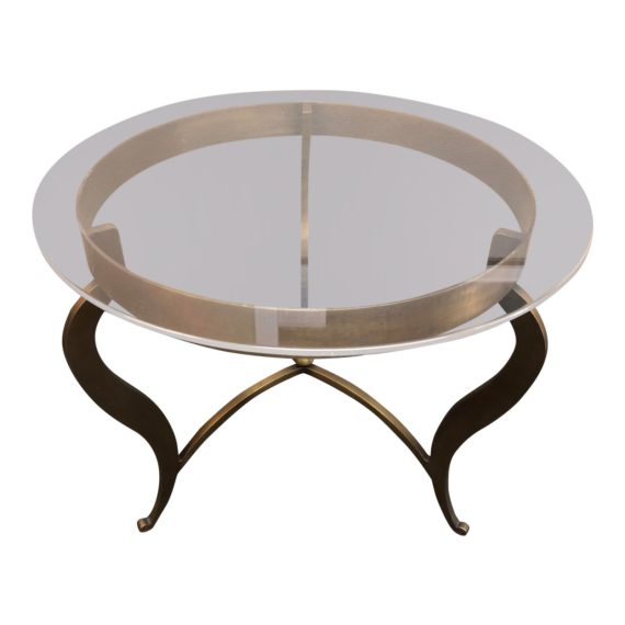 This is a tripod side table with a brushed brass finish on the base, and clear acrylic top. The acrylic or plexiglass top although scratched from wear is thick, sturdy and functional. The unique tripod base boasts cabriole tripod legs joined together in a playful triple-arched Y frame. A singular brass sphere completes the piece, echoing the circular shape of the tabletop frame.