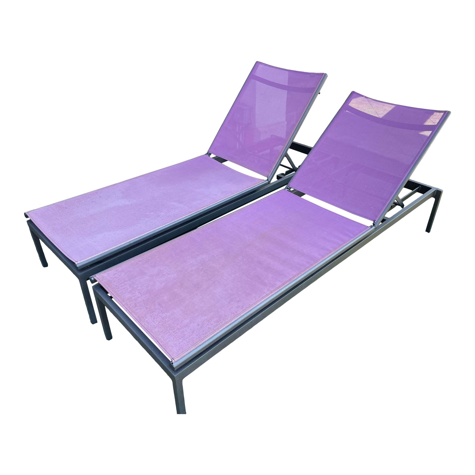 Design Plus Gallery presents a Pair of Tropitone of Cabana Sling Chaises. Customized with an electric purple all weather upholstery, the sleek aluminum frames are coated with a weather resistant finish. The mesh fabric shows light wear, otherwise pair is in good condition.