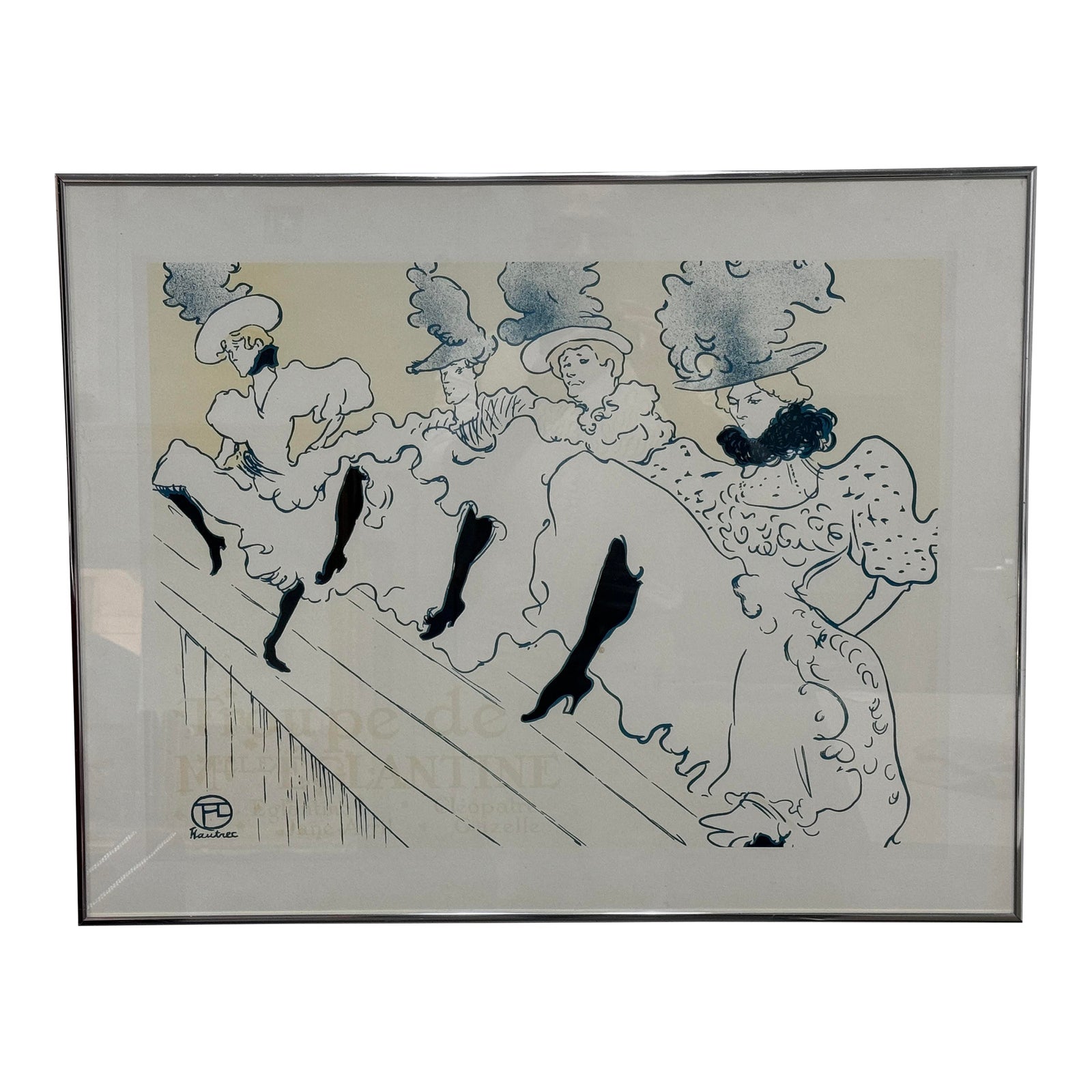 Design Plus Gallery presents a French Poster by Henri de Toulouse-Lautrec Famously Known as Troupe De Mademoiselle Eglantine. This vintage Parisian cabaret poster shows cancan dancers in graphic color. The dynamic nature of their movement is typical of the images produced by Toulouse-Lautrec. In this poster, the dancers form a diagonal line. They swing their dresses while their large plume hats enliven the spectacle. It is in good condition with minimal signs of wear to the silver finish frame.