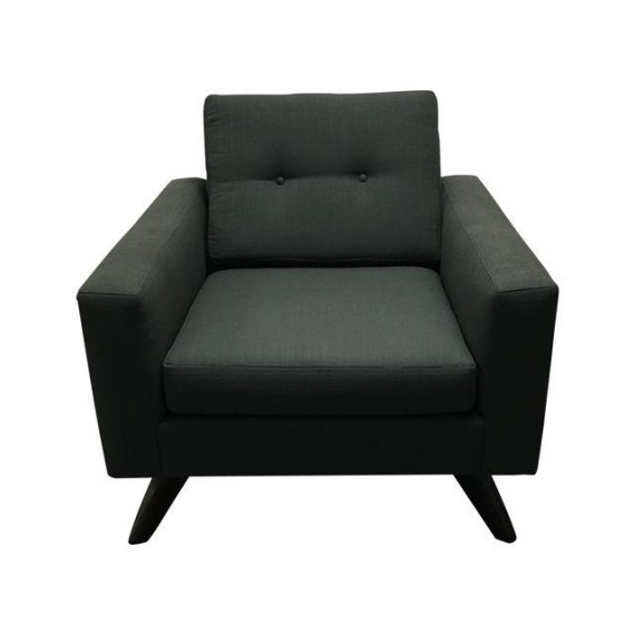 Design Plus Consignment Gallery has a Luna Arm chair from True Modern. The double button tufting on the back is simple, clean and classic. The back and bottom cushions are removable. The seat is deep with wide arms for ultimate comfort. The solid wooden legs keep it sturdy and strong. Upholstered in a charcoal fabric. The legs are a espresso.