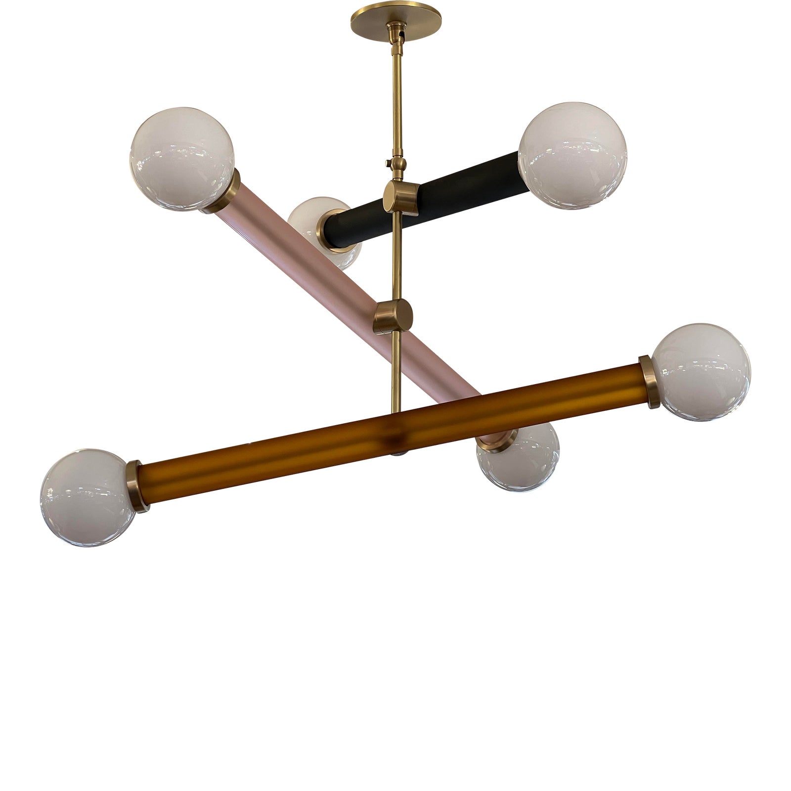 Design Plus Gallery presents the Elma Triple Chandelier by Trueing. A modern study in balance and composition that offers different views from anywhere in your room. The three multihued glass tubes, suspended on brushed brass, criss-cross each other as they reach out forming a dynamic and colorful light play. Little evidence of wear; condition is consistent with age and use.