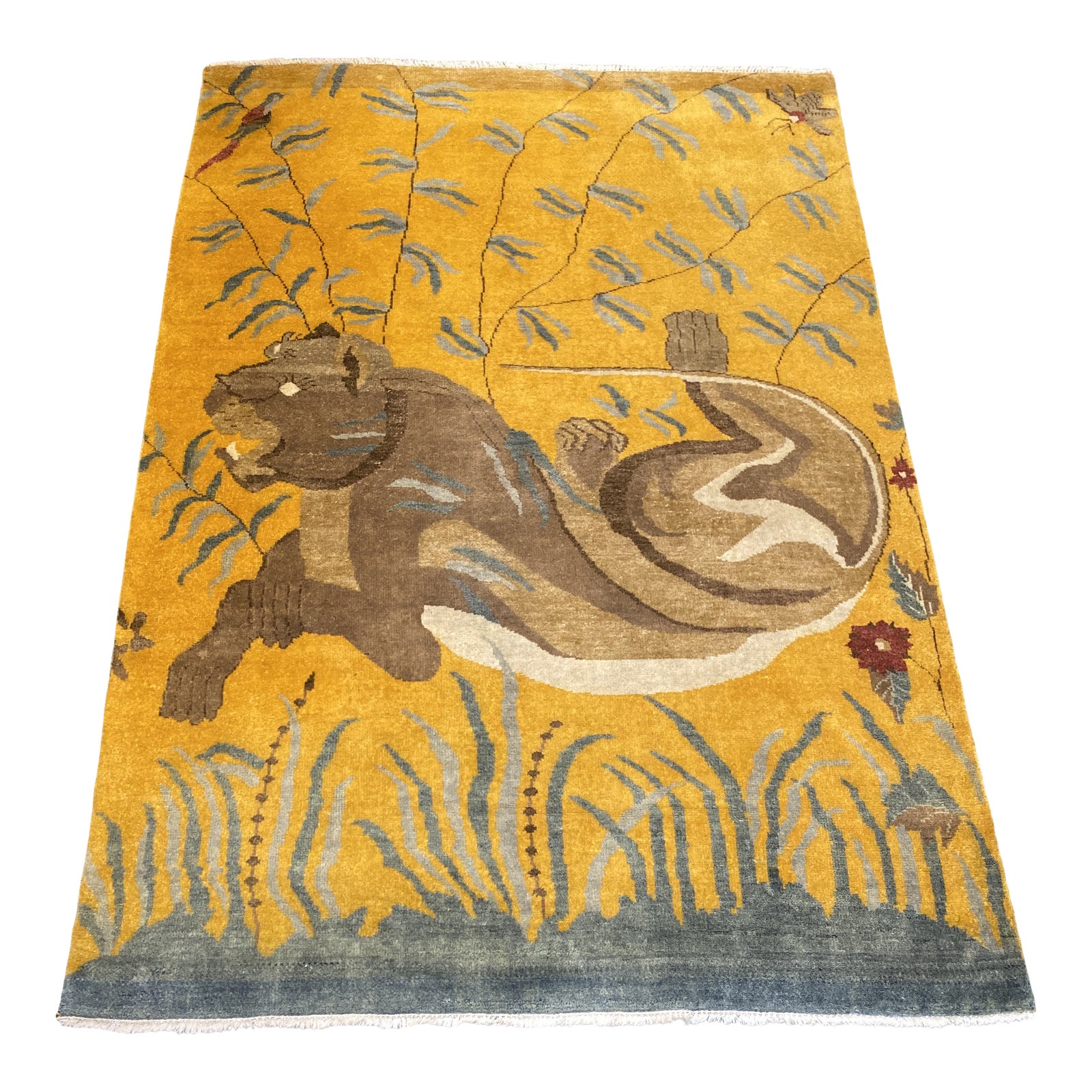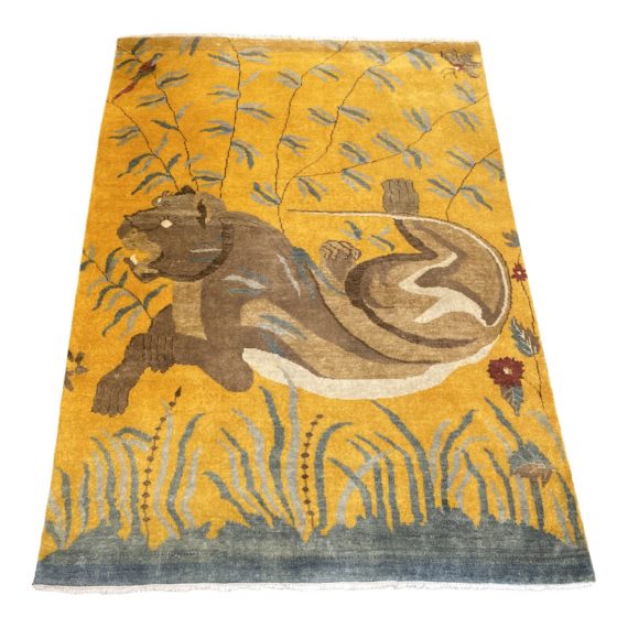 Design Plus Gallery presents a 5′-6″ x 7′ ‘Handknotted Lioness Wool + Mohair Area Rug. Vibrant wool and mohair fibers are hand knotted to form a charming scene of a Lioness reclining within a landscape. Backing is a striking mustard with neutrals and earth tones on top. Ends are fringed with the cotton backing. There is some visible wear and fading. A bird, insect and flowers are accented in the corners with burgundy.