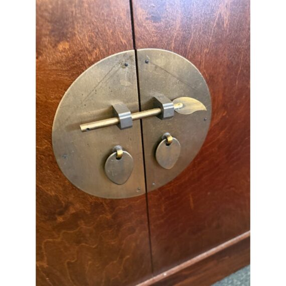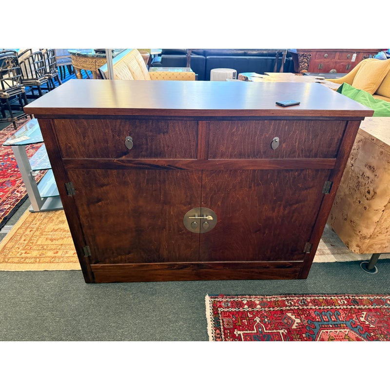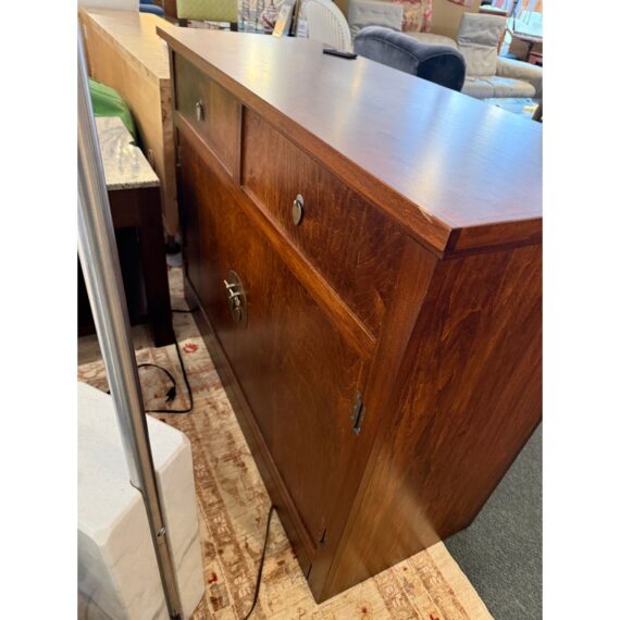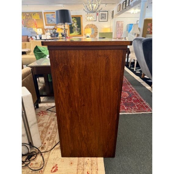 Design Plus Gallery presents the Adagio Media Console from TV Lift Cabinet. The canine is constructed from solid hardwood with hand-applied stains and paints. It features solid-brass, hand-stamped hardware that stylishly compliments the tones of the wood grain. This beautiful and unique piece of furniture is handcrafted by Amish Artisans and is finished on all sides, so it can be set-up anywhere in the room that is convenient for furniture placement and television viewing. Whether you want to place it at the end of the bed or against a wall, the unit will look great. The center rack and pinion lift unit houses and lifts the TV display, as well as having the capacity to store two other pieces of electronics. Tuck your tv away when it’s not in use, and create a space free of clutter. A hidden television unit creates a tranquil space, and provides extra storage to hide away unsightly cords and cables. When you’re ready to kick back and relax, you can utilize remote control technology or our convenient app to lift your tv to its optimal height. The motorized mechanism is virtually silent, so your tv ascends smoothly and quietly. This unit can accommodate LED, LCD, OLED, and plasma flat screen tvs up to 45.5” wide. Wire management and ventilation throughout the unit allow for safe storage for your electronic devices, so they won’t overheat. Cables are hidden from view, so all you and your guests see is an elegant piece of furniture! The style of cabinet is no longer in production with the brand and it is in good overall condition for its usage. Made in the USA.