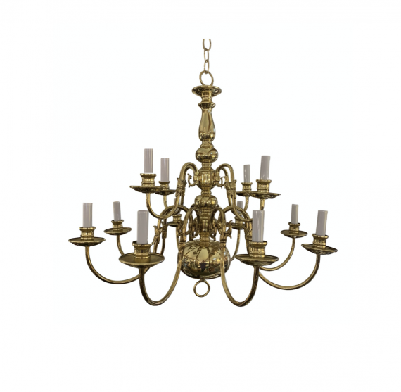 Design Plus Gallery presents a Twelve Light Polished Brass Chandelier. Sloped arms are in two tiers. Reflective finish on bottom of chandelier creates convex. Original chain and canopy included.