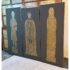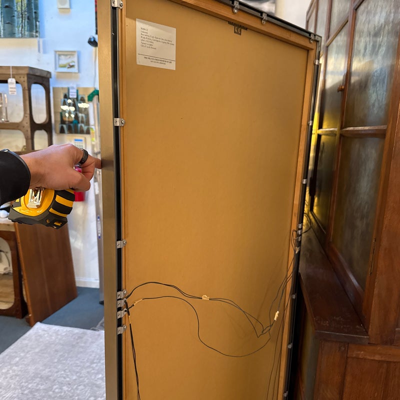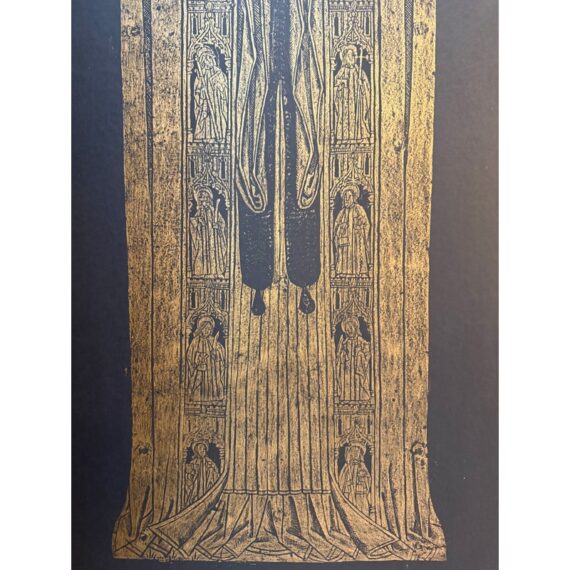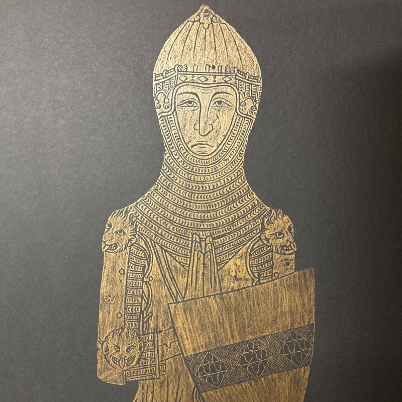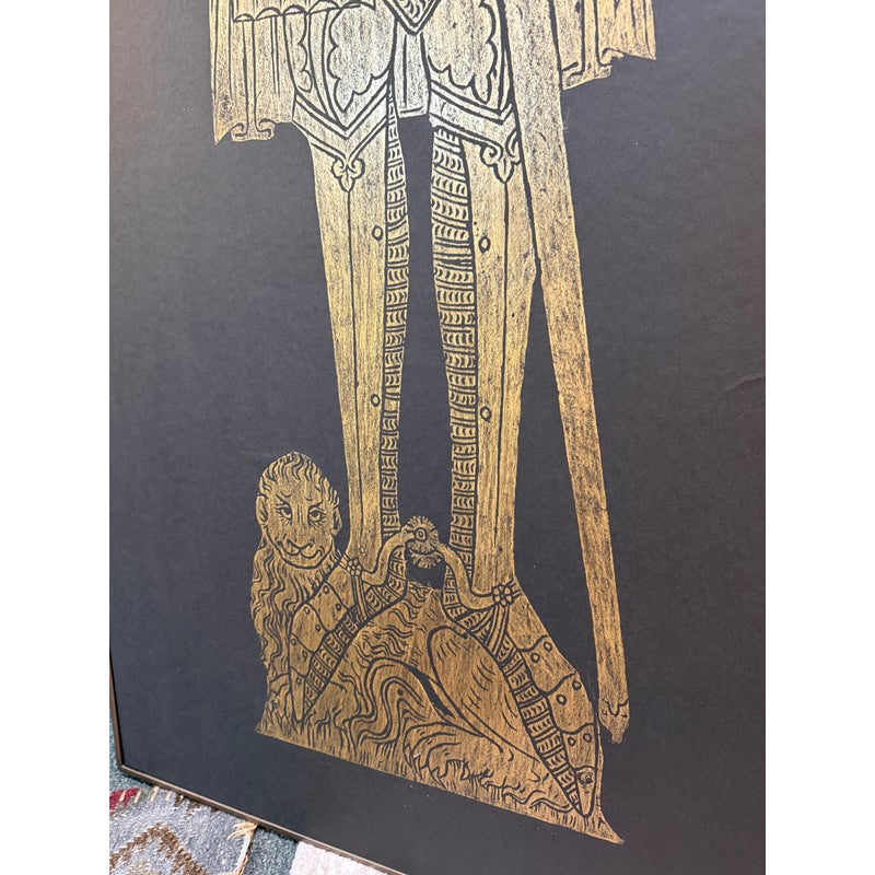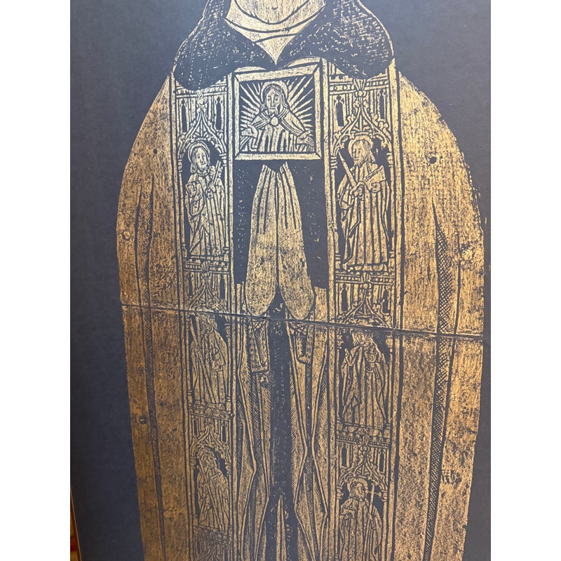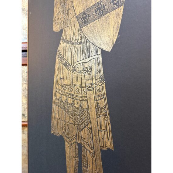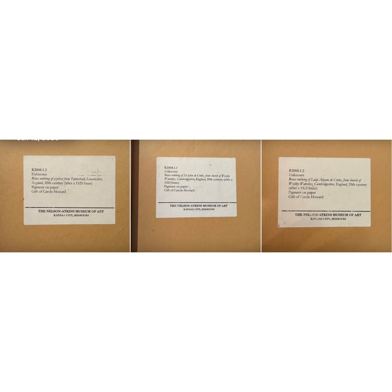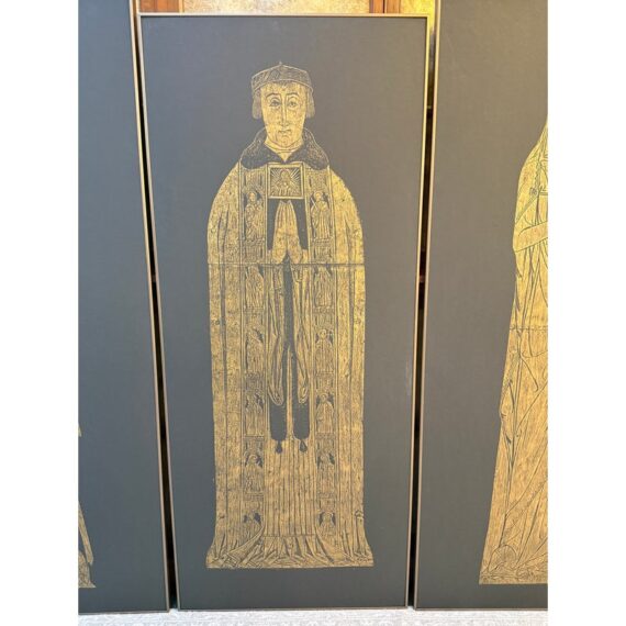 Design Plus Gallery presents a Triptych of Brass Rubbings from St. Mary the Less Church in Westley Waterless. This church is modest but historically rich parish church known for its medieval features, particularly brasses like those of Sir John and Lady de Creke. Two of the three brass rubbed images are of Sir John and Lady Ayelene of Creke and the other is of priest from Tattlershall, Lincolnshire, England. The trio draws from gothic + medieval iconography that was created in the 12th century for the church after Sir John was Knighted and the rubbing was from the 20th century. Each rubbing is set against a dark back ground that allow for intricate line work of the brass to stand out beautifully. Overall the triptych is in good condition with minimal signs of wear for their usage.