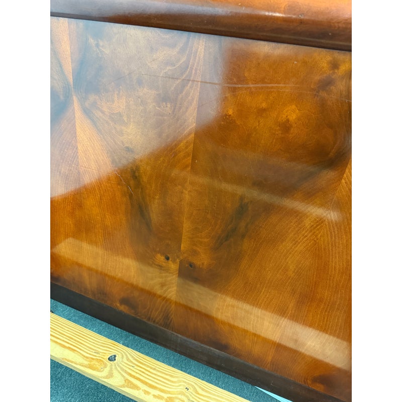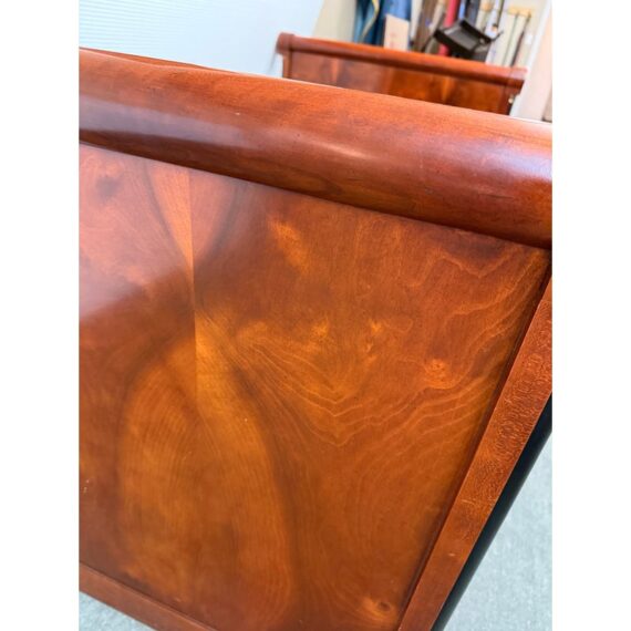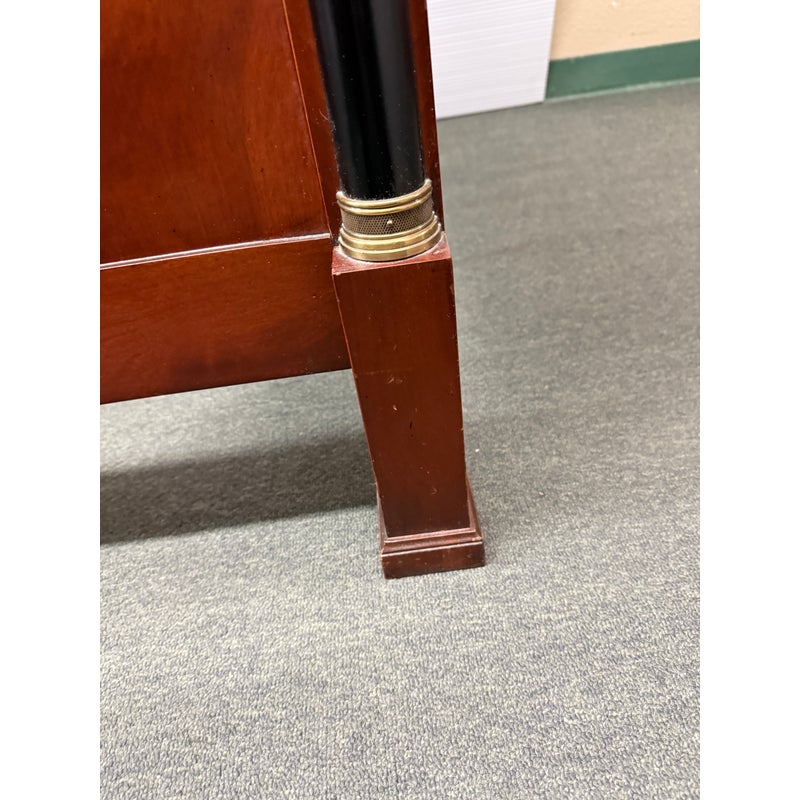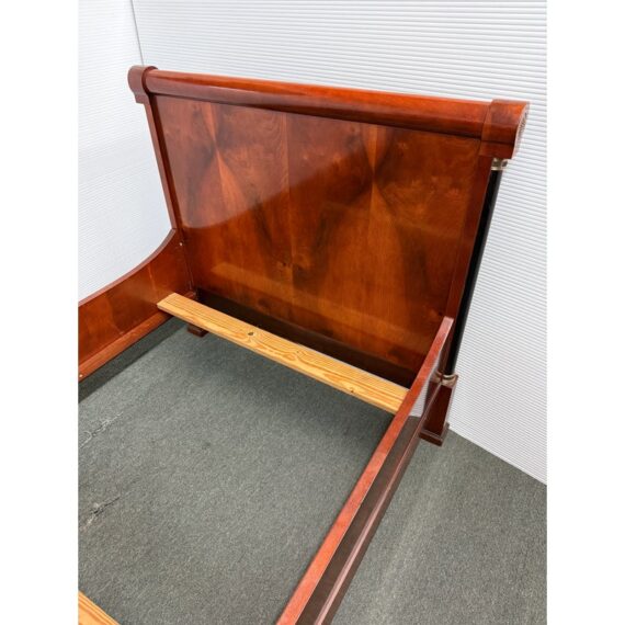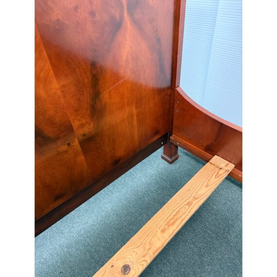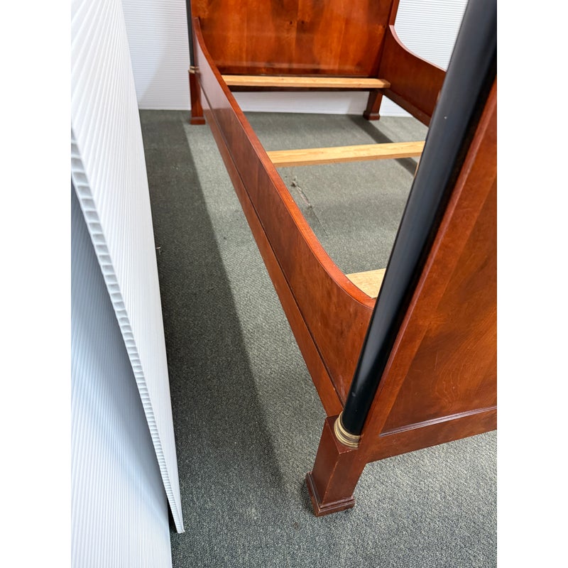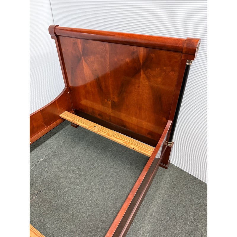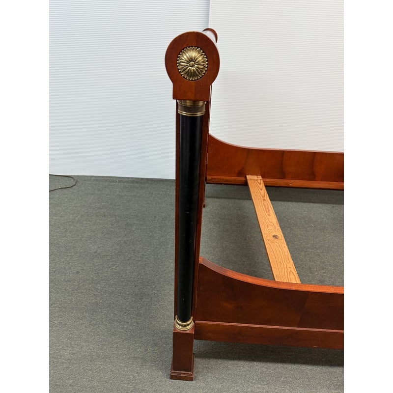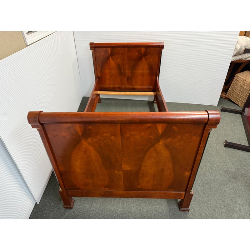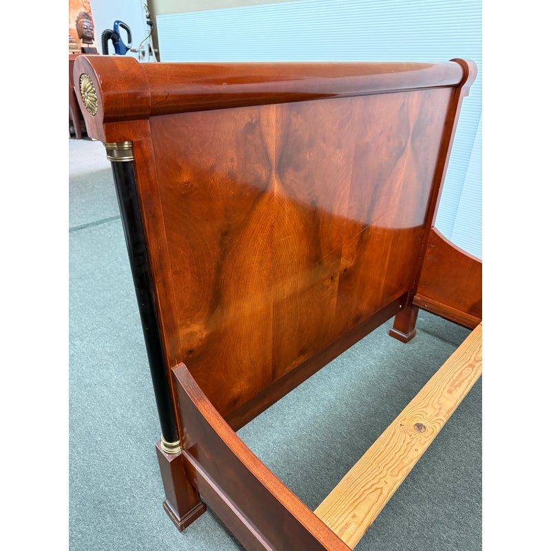 Design Plus Gallery presents an Antique Empire Twin Bedframe. Stunning Falmed Cuban Mahogany woodgrain is the star, the subtle curves, black columns, rosettes and gilt details embellish the whole. A unique and uniquely beautiful heirloom piece of furniture to enjoy for generations. Light surface scratches; condition is good for age and use.