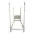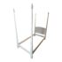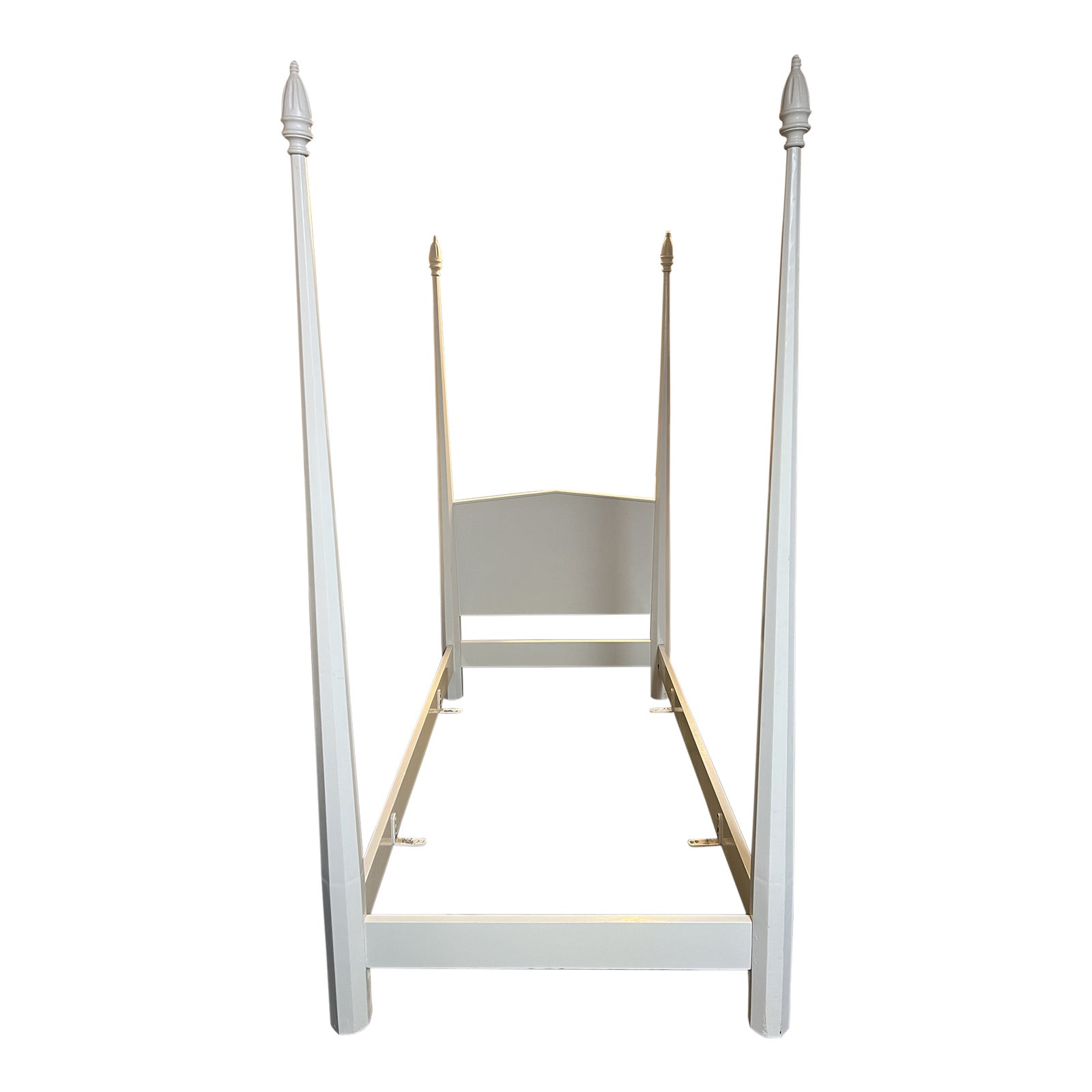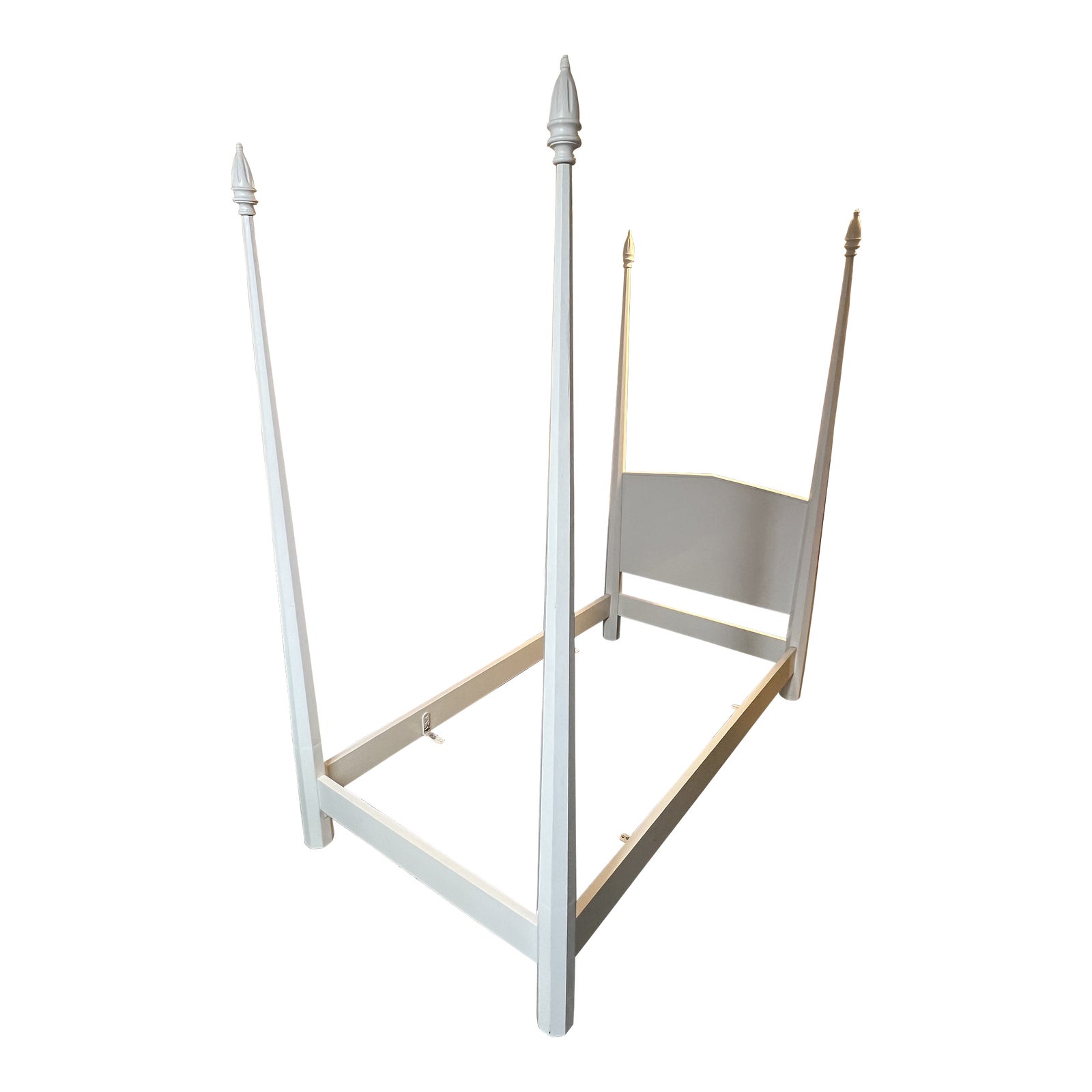 Design Plus Gallery presents a Twin Size Antique Bed Frame. A four poster bed frame crafted from solid woods with an antique white painted finish. Four metal brackets supports a twin size platform. Visible and minor wear from usage + age.