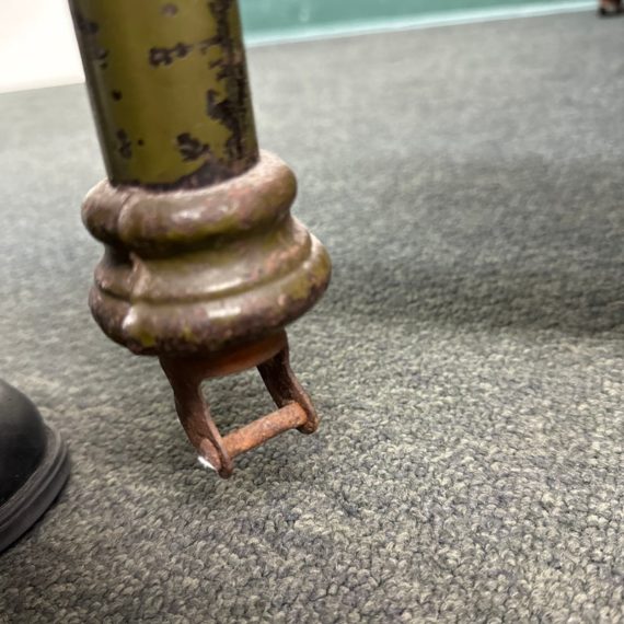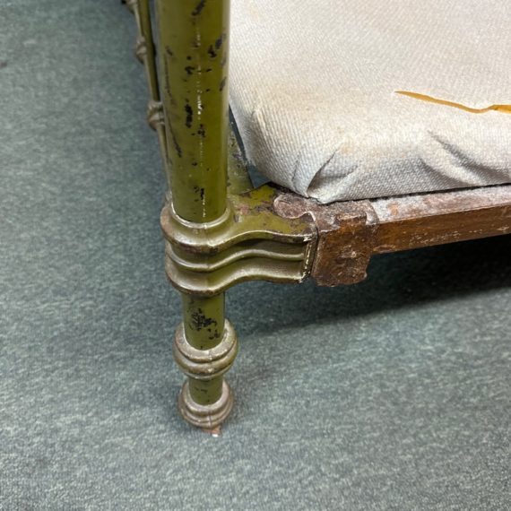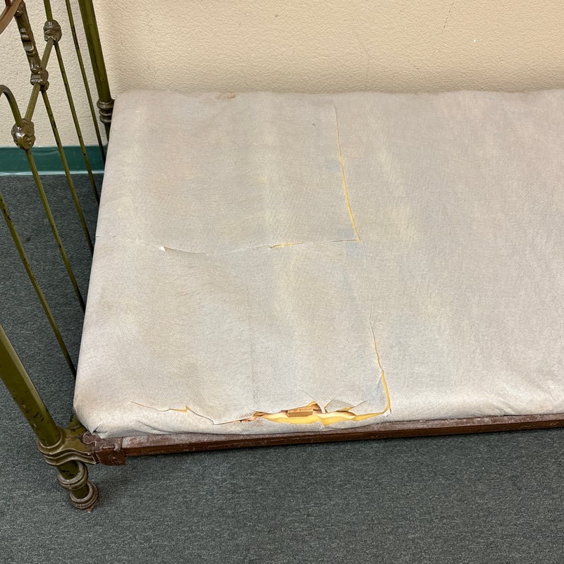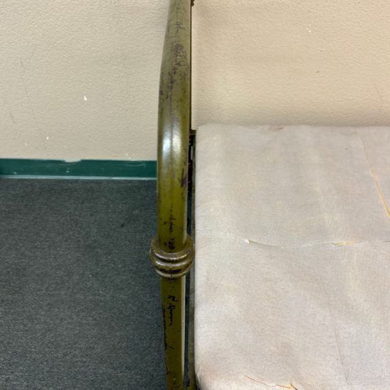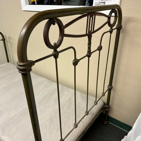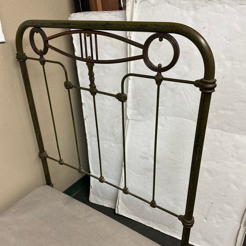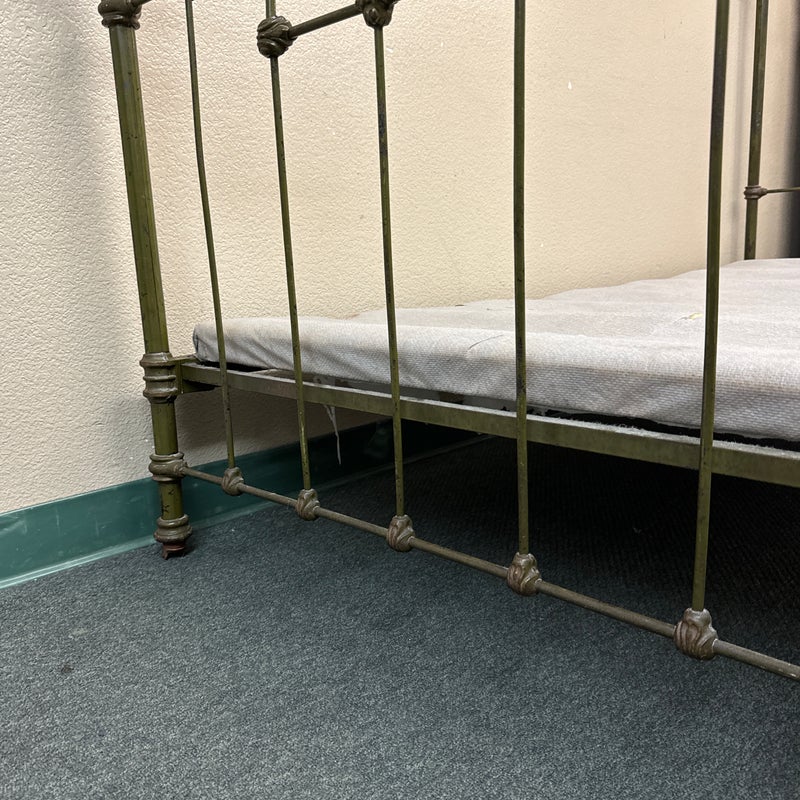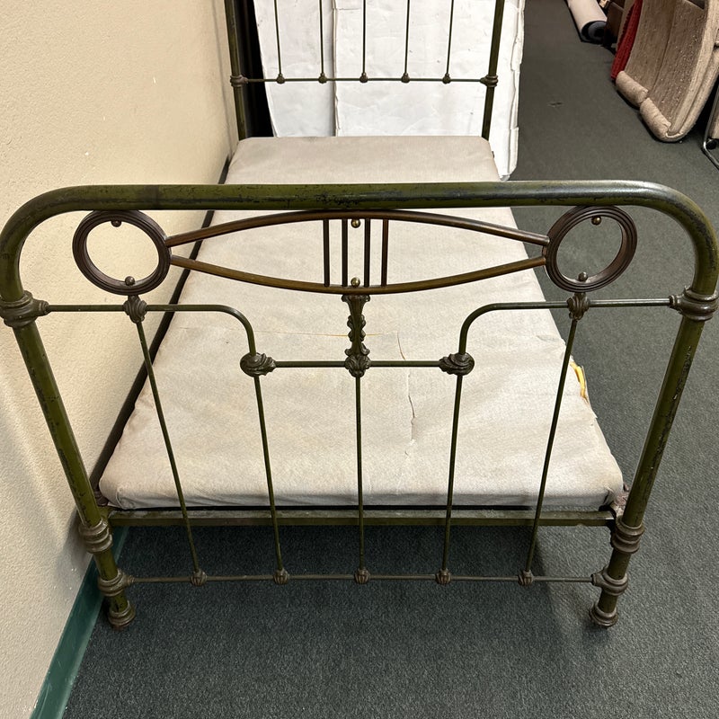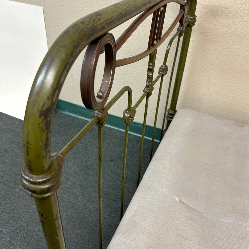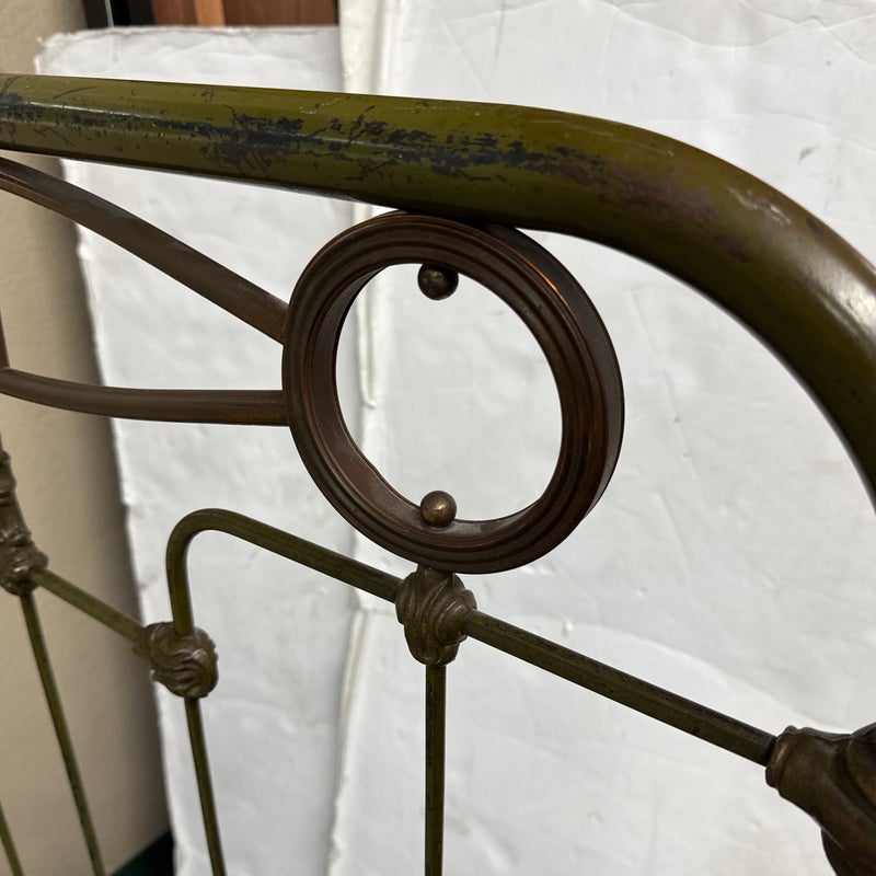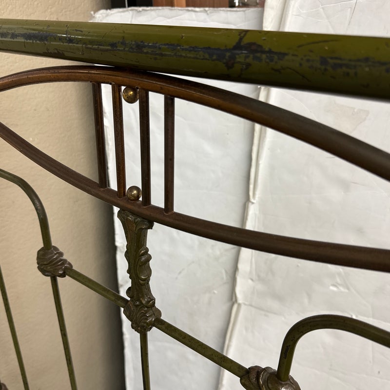 Design Plus Gallery presents an Antique Russian Iron Bed Frame. Soft curves and decorative copper details, the vintage twin bed is full of charm and touched with age. Worn green paint. Bedframe is missing casters, cambric wrapping platform has been cut. Condition is fair for age and use.