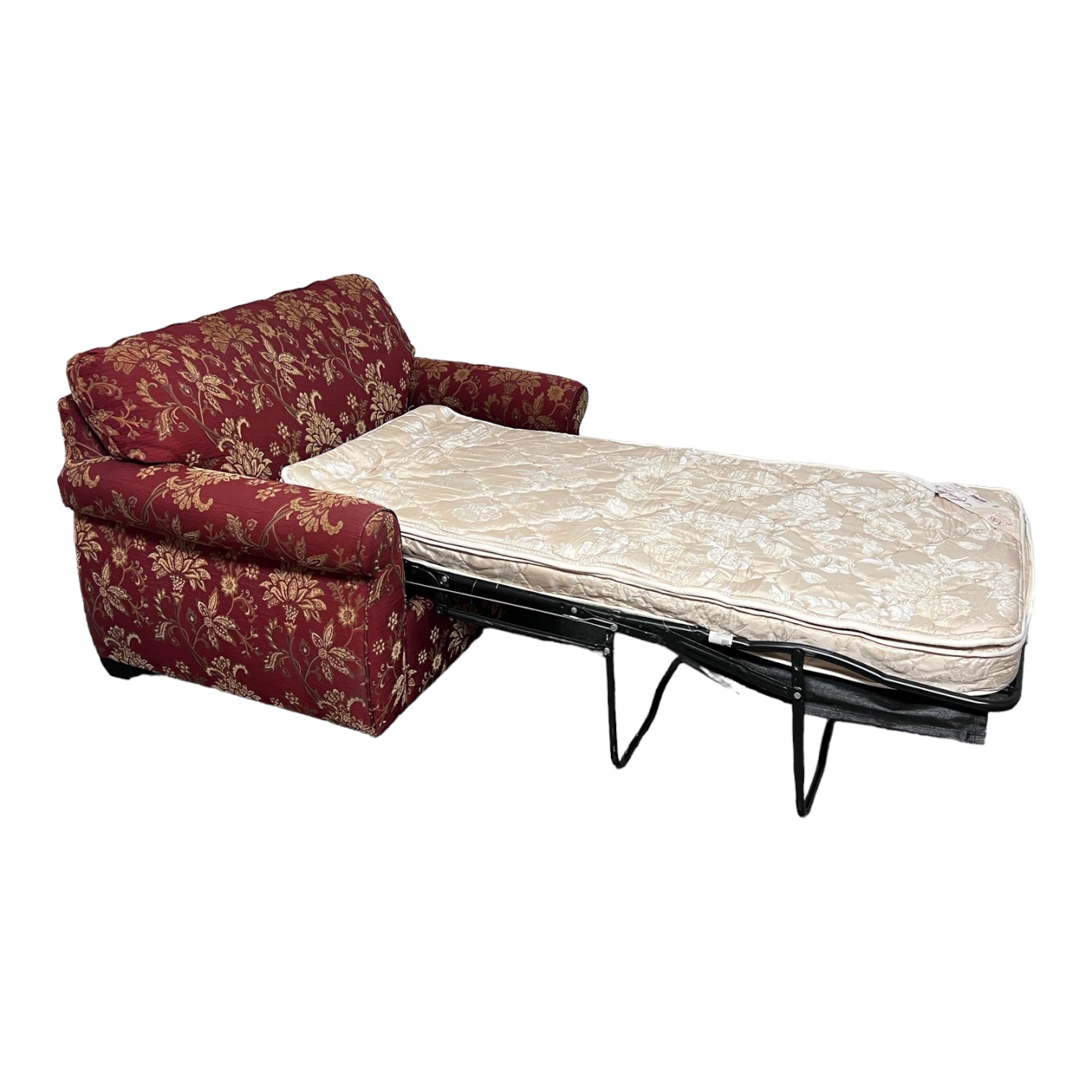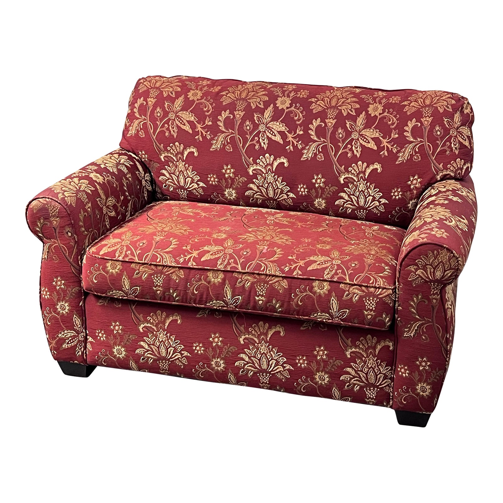 Design Plus Gallery presents a Twin Size Steephaven Sleeper Sofa by Flexsteel. A stylish and versatile piece of furniture that can enhance any living space. Its rolled arms provide a classic touch, adding elegance and sophistication to the design. With a fixed back cushion, this sofa offers comfort and support for lounging or sitting. A pullout twin size hideaway bed under the loose seat cushion. This makes it the perfect option for those who often host guests or need an extra sleeping space. The bed can be easily pulled out and set up, providing a comfortable and convenient solution for overnight visitors. Upholstered in a vibrant red background with a charming multi goldfish floral print. This unique pattern adds a pop of color and personality to the overall design, making it a focal point in any room. Supported by wood feet that are tapered blocks in a dark finish. Visible and min or wear from usage + age. visible markings, would benefit with a professional celling. Made in the USA.