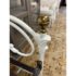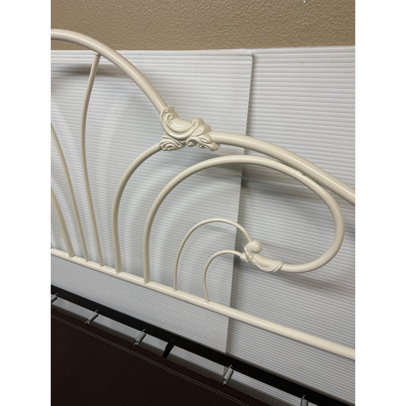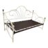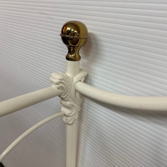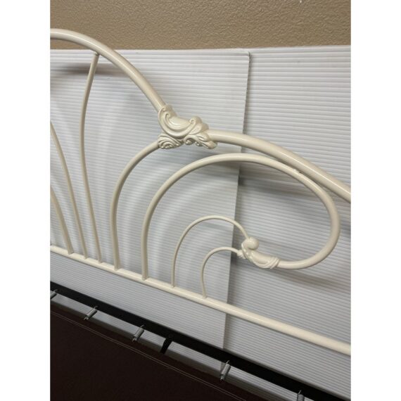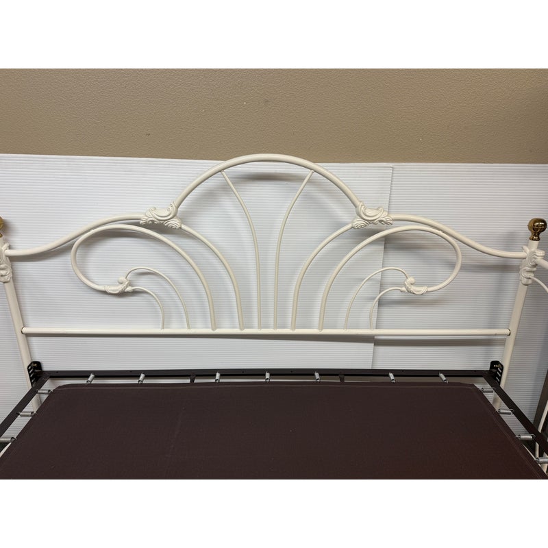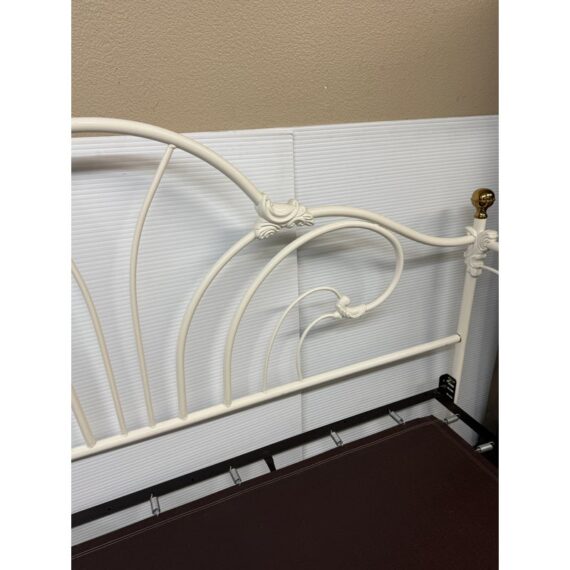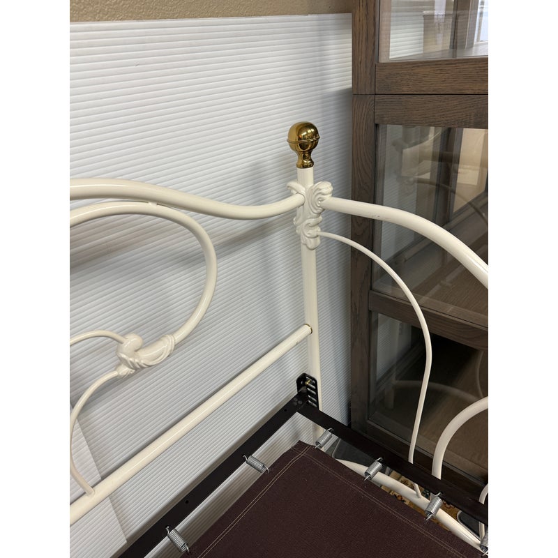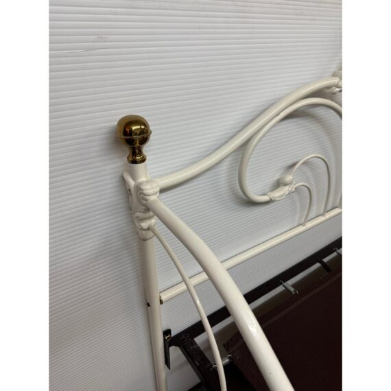 Design Plus Gallery presents a Twin Size Vintage Style Metal Daybed. The bed is made from metal with a white finish and brass finials for two tone appeal. It is romantic with open scrolled framework and good for a sweet, shabby chic feel. It has a trundle pad to rest the mattress on for a springy and comfortable rest. It is in good condition for its usage.