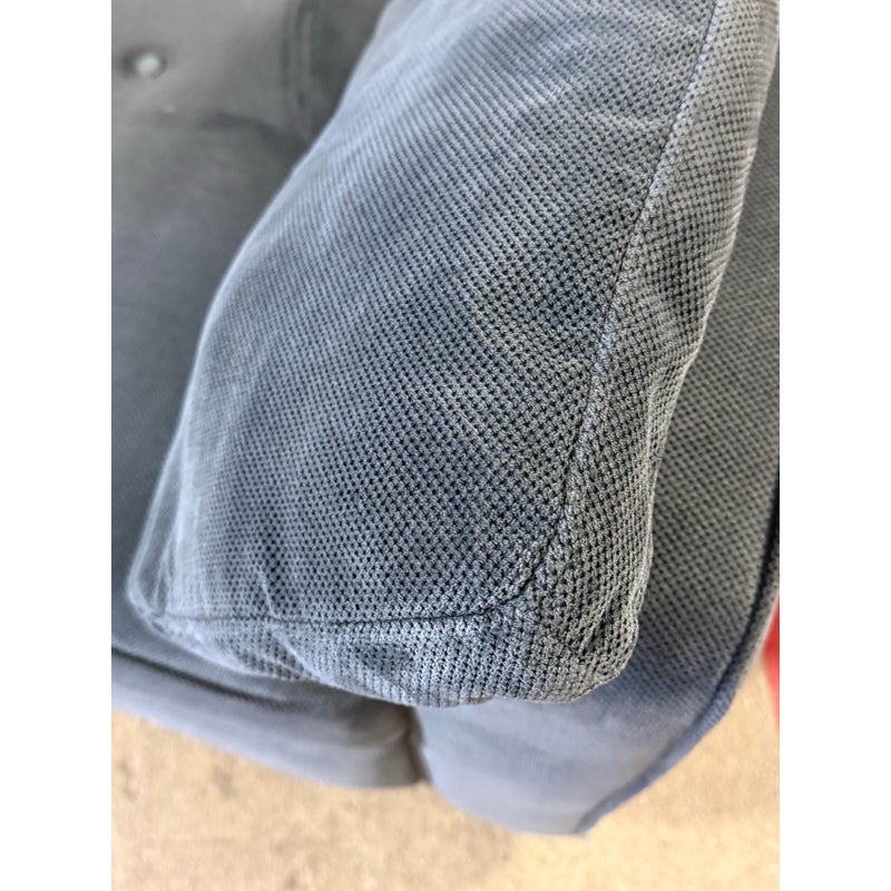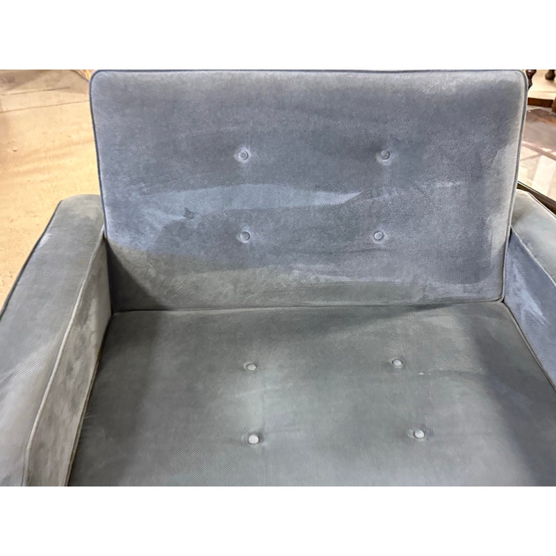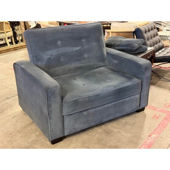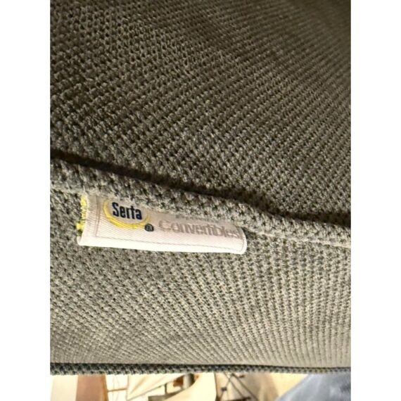 Design Plus Gallery presents a Twin Convertible Chair by Serta. The multi-functional chair works beautifully as a lounger, and extra bed when needed. Throw pillows for lumbar or additional arm comfort. The durability of this chair’s solid hardwood frame and legs as well as its high-quality woven fabric upholstery will stand up to years of everyday use. Detailed with self welting and shallow tufted buttons. Visible surface wear; condition is consistent with age and use.