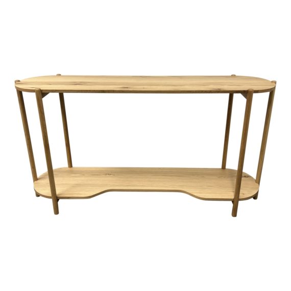 Design Plus Gallery presents a Tyler Oak Wood Console Table. This is a natural, unfinished raw table that can will be a great hallway or behind your couch addition. Practically brand new with minor wear, with three straight legs on each side and curved over shelf. Minor wear.