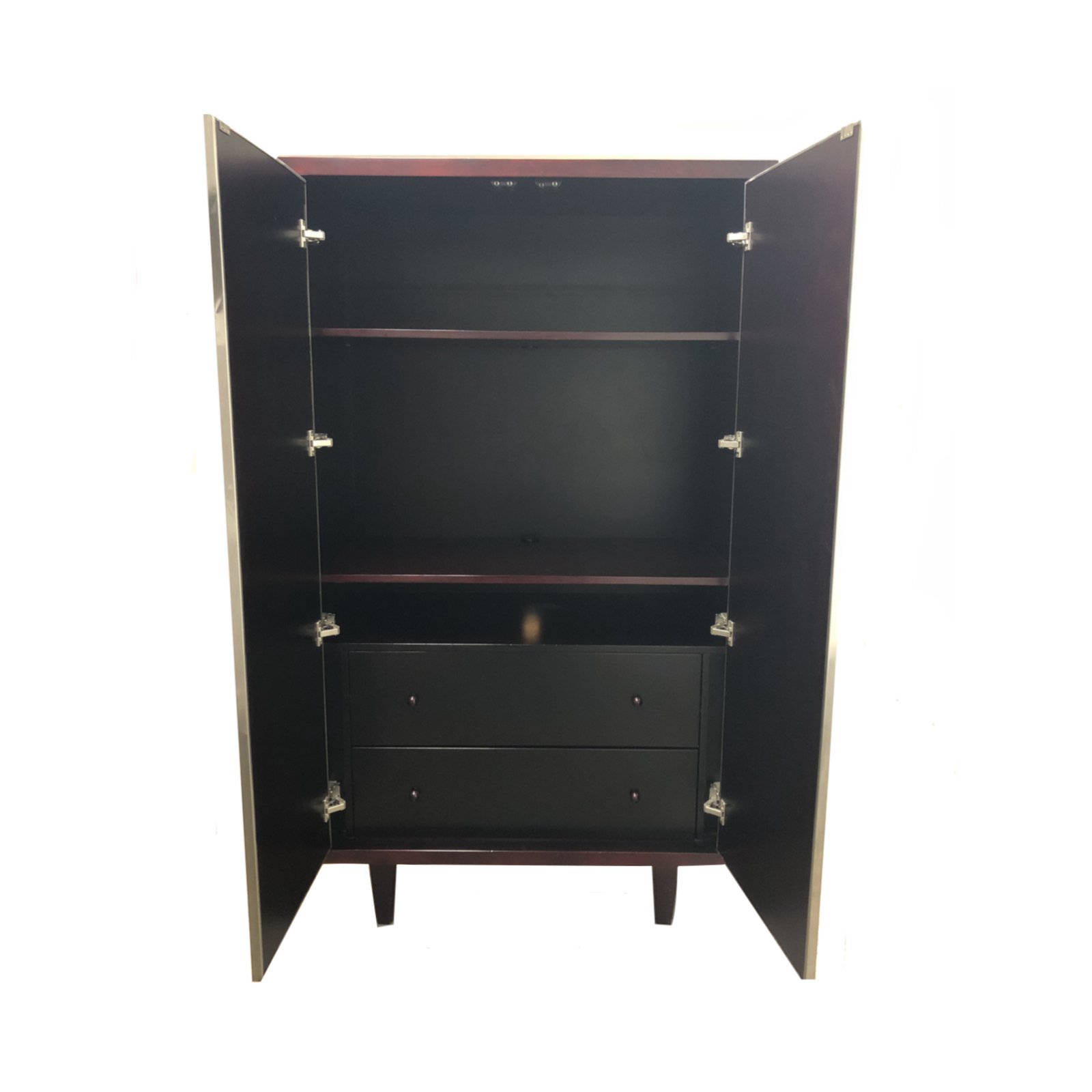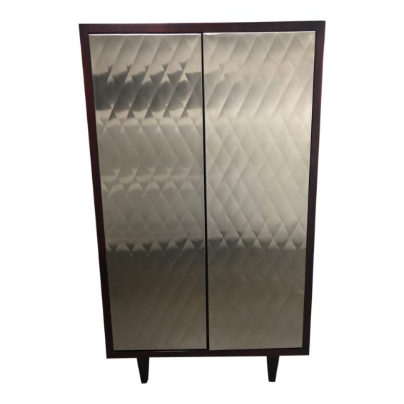Design Plus Gallery presents a ‘Tyles’ Cabinet by Monique & Sergio Savarese for Dialogica. Diamond plate stainless steel swinging doors are held in place with magnet fasteners, with a light push-to-open function. The wood is made of mahogany in a dark ox blood finish. Two spacious shelves, a smaller cubby, two drawers, and two holes for media cords complete the interior of this now retired designer piece. Minor wear in the inside.