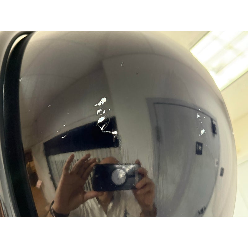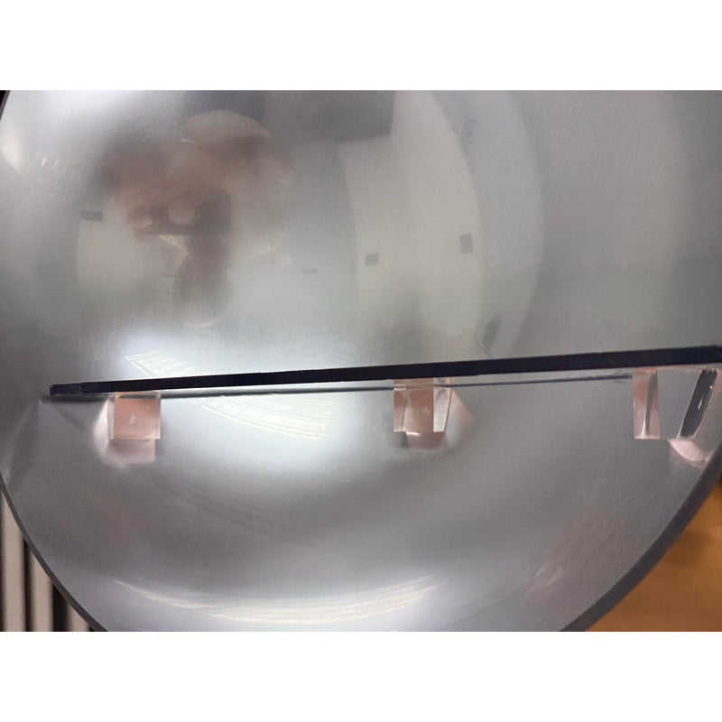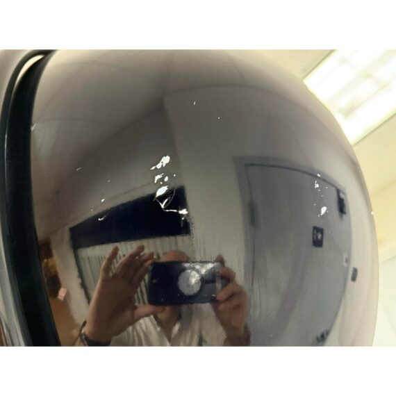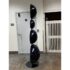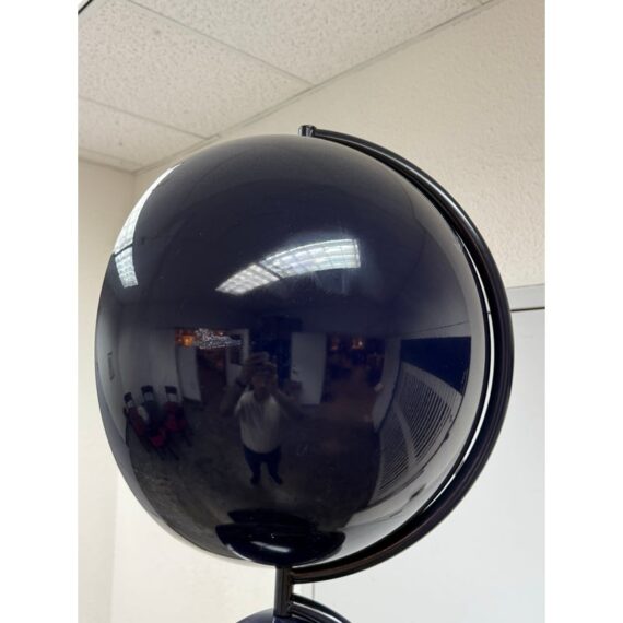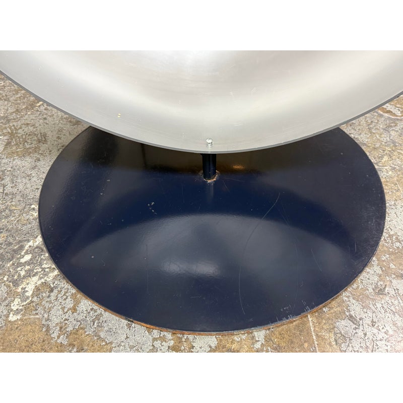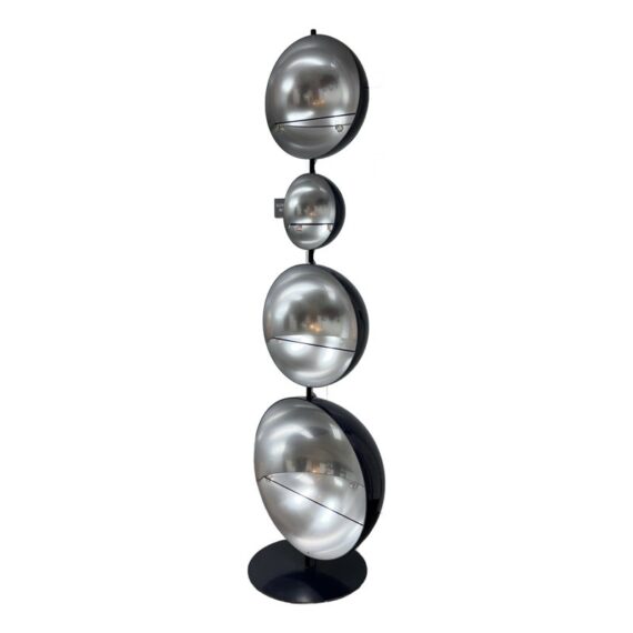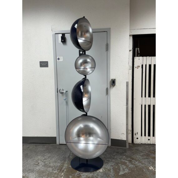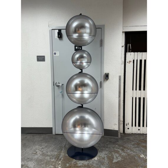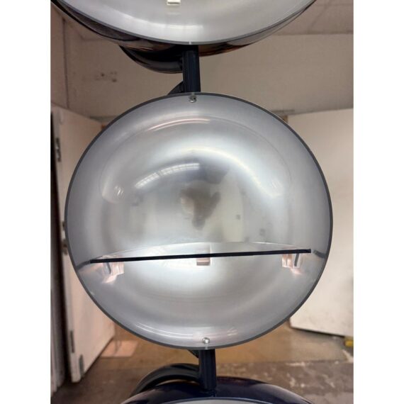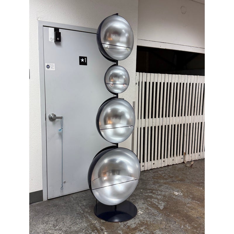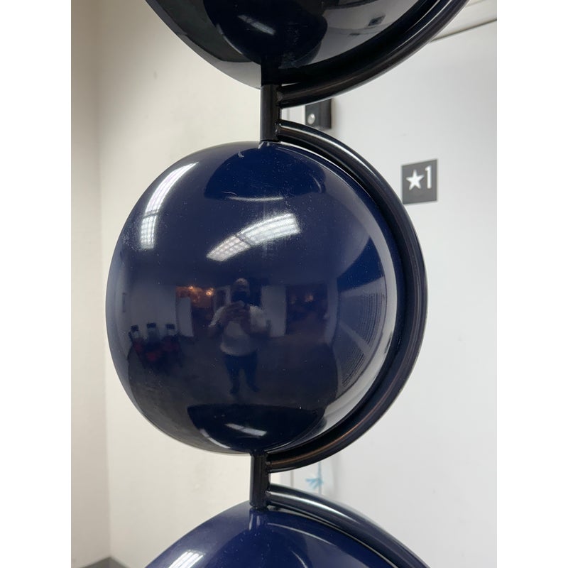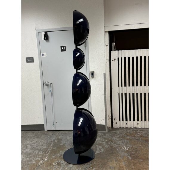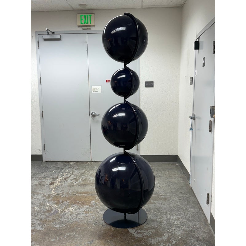 Design Plus Gallery presents a Navy Blue Enamel Ultra Modern Display Cabinet. The orbs are all rounded in the shapes of orbs with a silver inner lining and plexiglass shelf in each. The orbs are of differing sizes and a maneuverable, with their direction to display able to twist + turn.