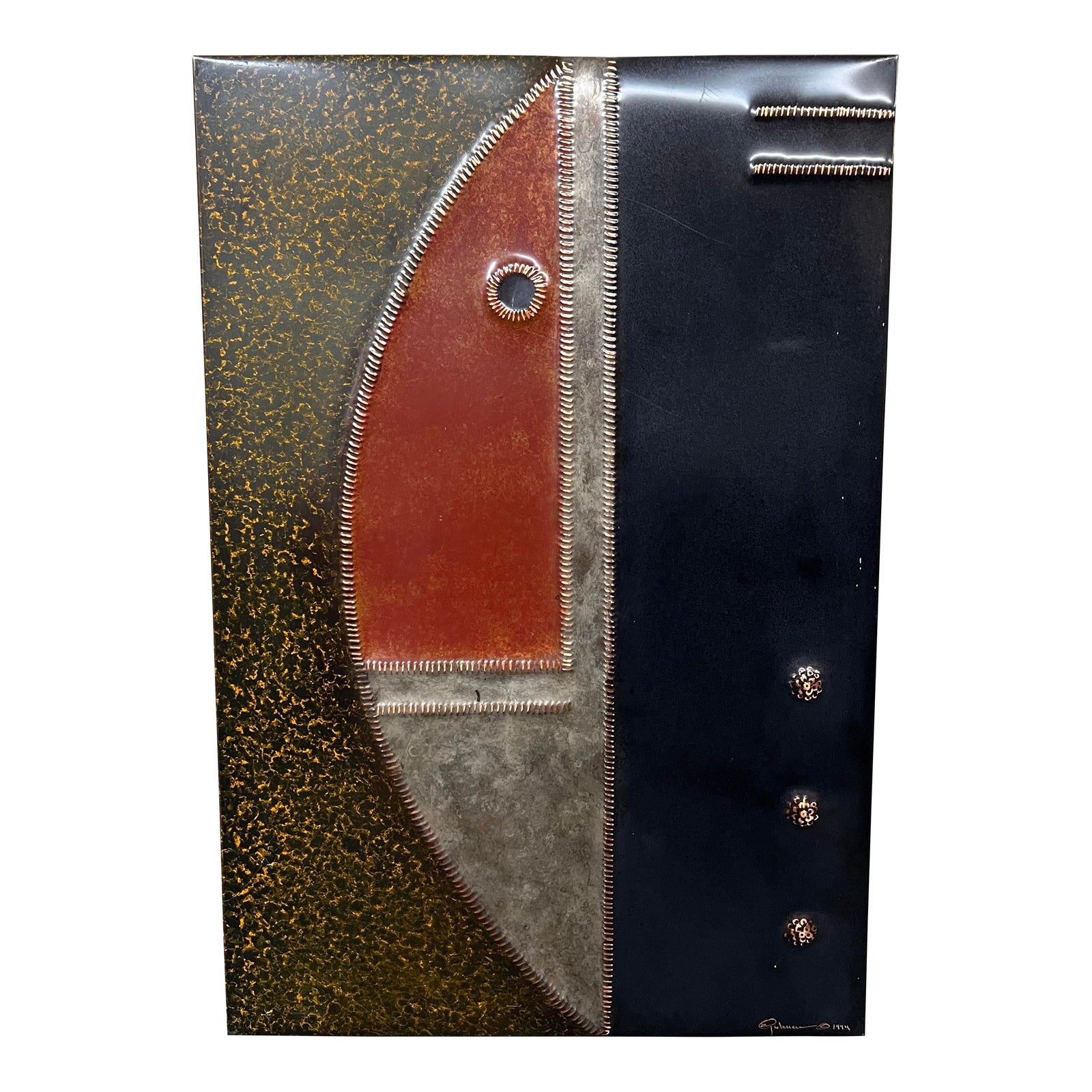 Design Plus Gallery presents an Uluru Abstract Copper Repousse. Copper is hammered from the back to produce a low relief design reflecting traditional Aboriginal art found in Australia. The natural colors are a yellow/black blend, red, gray, and solid black. Anangu art, from the Uluru National Park can be found inrock paintings, sand drawings. that were created for religious and ceremonial expression; teaching and storytelling. The back is reinforced with wood planks and has a hanging cord for mounting. Artist’s 1994 signature is on the bottom right. Minor wear from use; repousse is in good. condition.