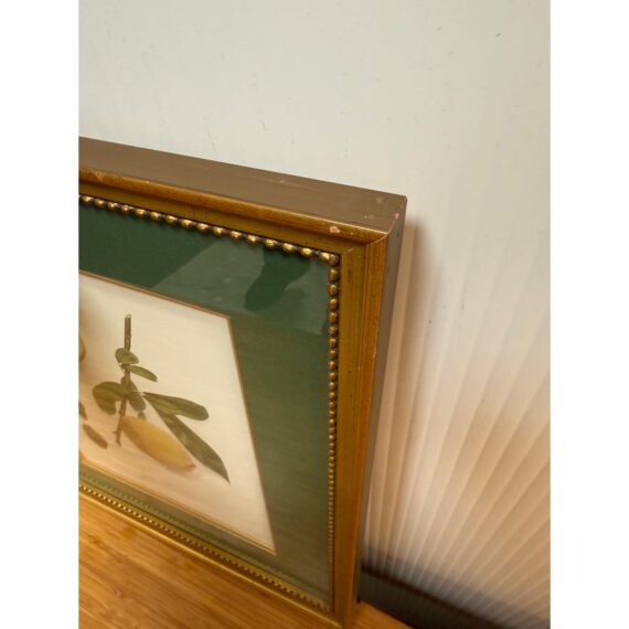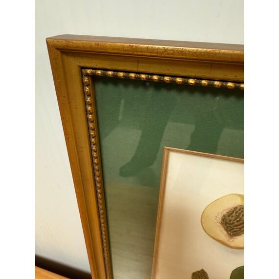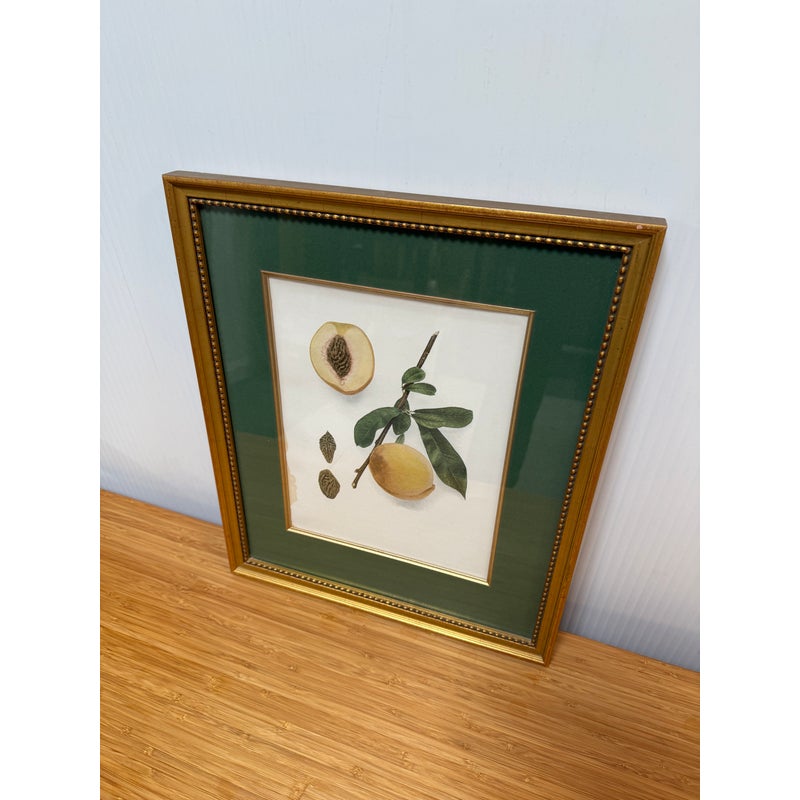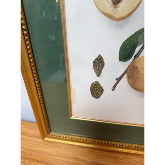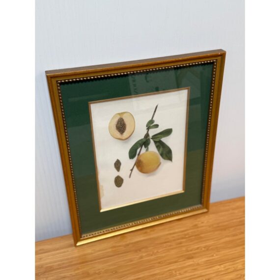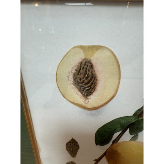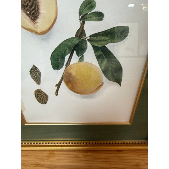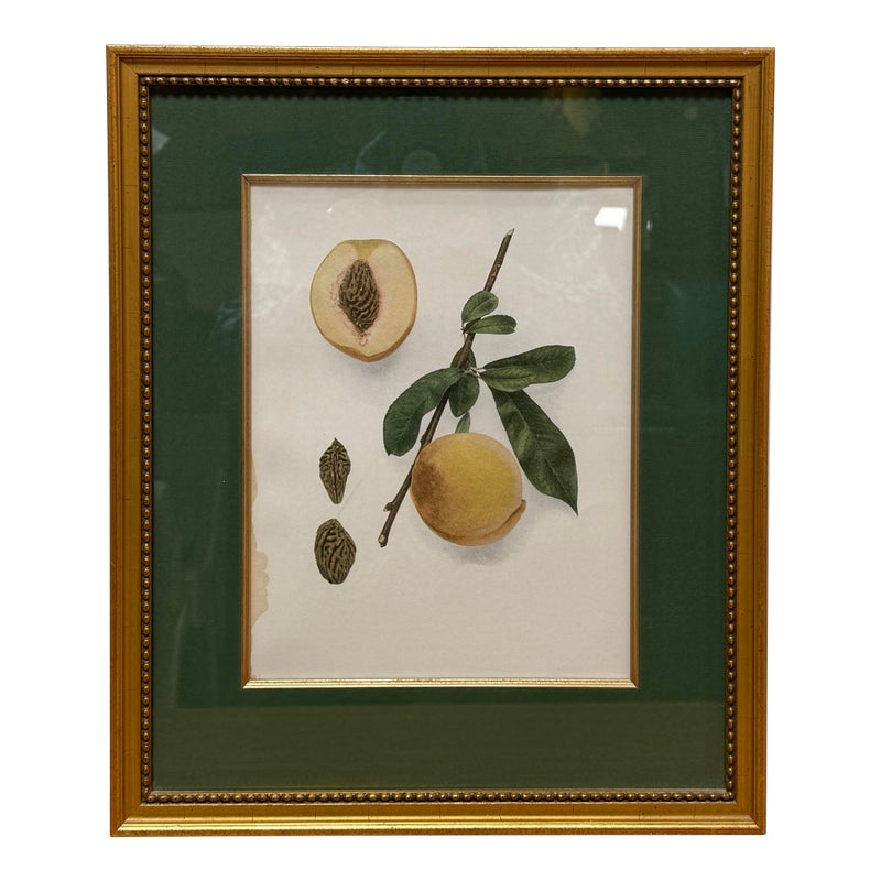 Design Plus Gallery presents a Lamont Peach Botanical Illustration from “The Peaches of New York” published in 1917. Originally a photogravure that renderes wonderful details of a whole peach, a halved peach and peach pits. Double framed and matted in gilt frame, to lovely effect. Light wear; water damage on lower right shown; condition is fair.