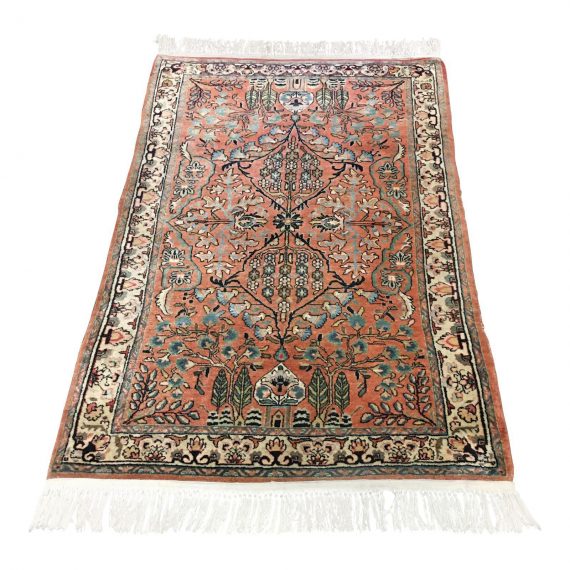 Design Plus Consignment Gallery presents a coral-rose ground hand knotted rug. The rug is intricately created with a multitude of traditional symbols and finished with a sewn-on border of fringe