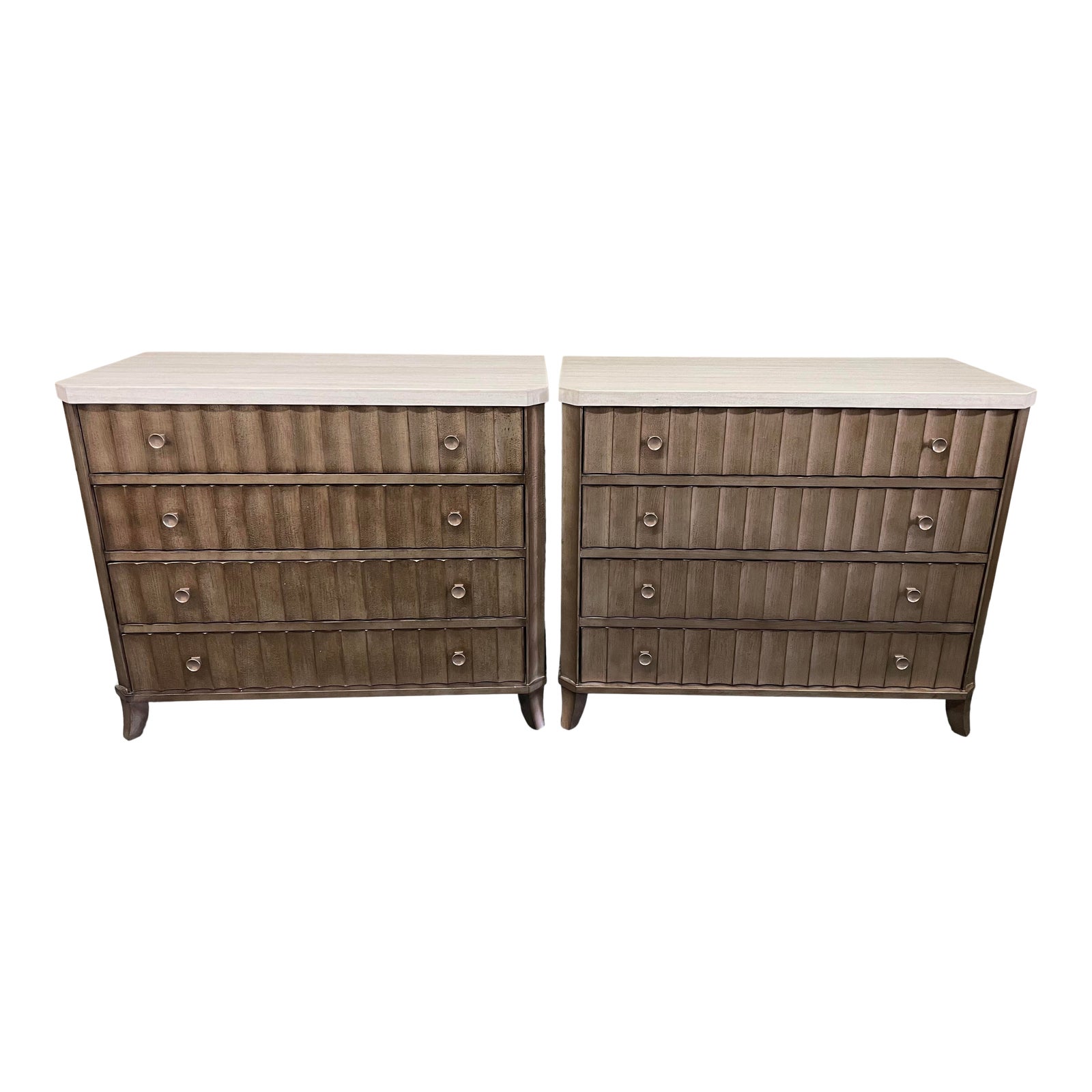 Design Plus Gallery presents a Pair of Custom Nightstands by Universal Furniture. Custom finished in a warm metallic, the fluted detail embellishes all four of these oversized nightstands. The bright travertine tops create a welcome design contrast while protecting the surface.