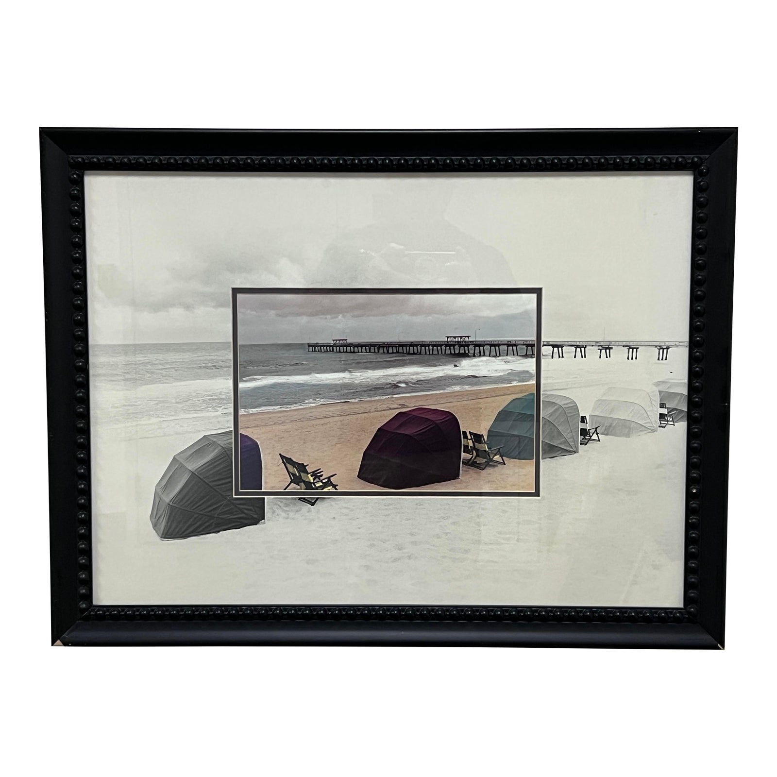 Design Plus Gallery presents a Unique Watercolor Painting of a Beach with Pier in Background. The unique look is that perfectly centered you find a postcard like area of the scene in color. Beyond that centered frame the rest of the image is black and white. Is in good condition with some wear to the frame.