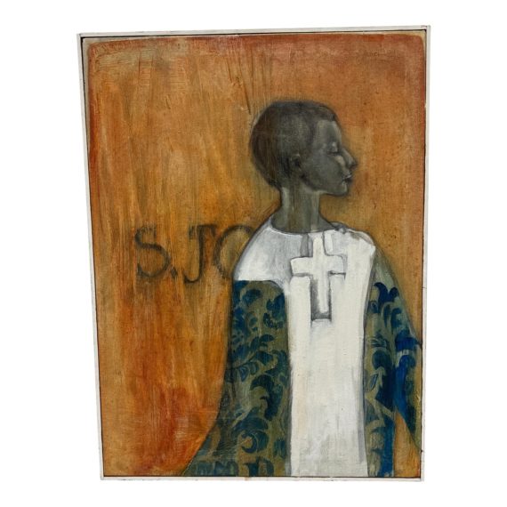 Design Plus Gallery presents a Painting by an Unknown Artist Showing a Young Boy with Christian Robe. The painting depicts a young boy standing tall in the center of the canvas, adorned in a flowing robe. The robe, which covers his body, is a vibrant amalgamation of blue and green tones, symbolizing the peace and renewal associated with Christianity. A crisp white cross is prominently displayed on the front of the robe, boldly representing the boy’s faith. The boy’s head is turned to the side, captivating the viewer’s attention, while the rest of his body remains facing forward. This subtle pose suggests a sense of contemplation or curiosity, as if the boy is engaged in deep thought or observing something with intrigue. Next to his torso, the letters “SJC” are inscribed. These initials likely hold significant meaning, perhaps symbolizing a saint’s name or a dedication to a specific religious figure. The background of the painting may represent the spiritual glow of faith, radiating and enveloping the boy in its embrace. The overall composition gives off a sense of reverence, with the young boy portrayed as a pure and devoted follower of Christianity. Through the painting’s colors and symbols, it invites contemplation and introspection, inviting viewers to reflect upon.