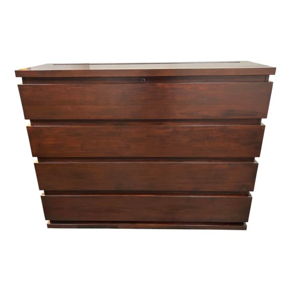 Design Plus Gallery presents a Uplift Custom Tv Console. A modern and sleek silhouette is clad with wood panels in a deep + rich chestnut stain. The lift inside comes with a 55″ screen. Lift comes with a remote. There is minor wear through out, console is in good condition.