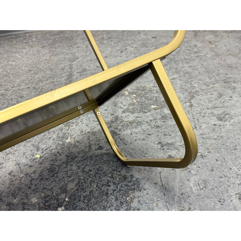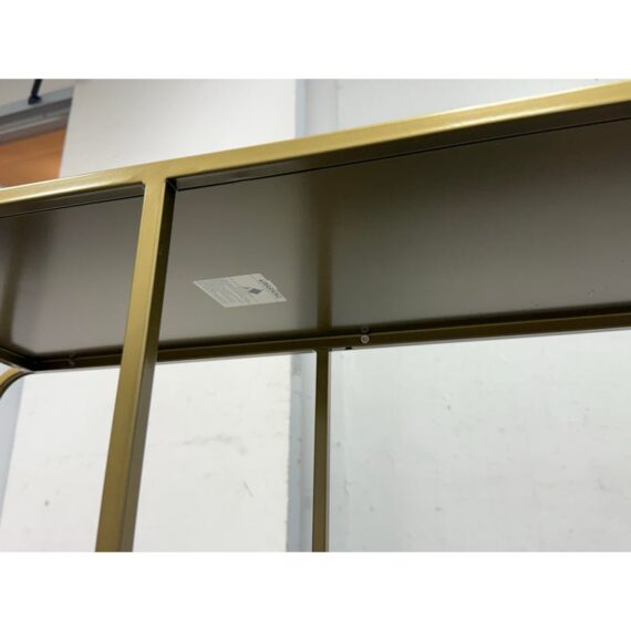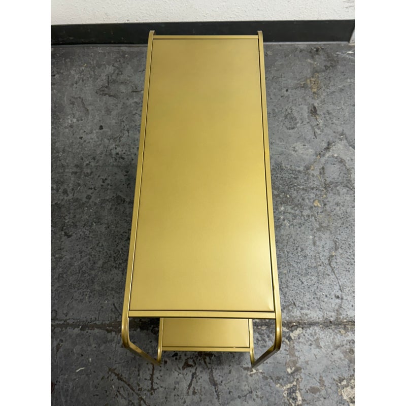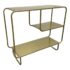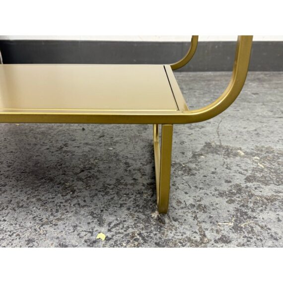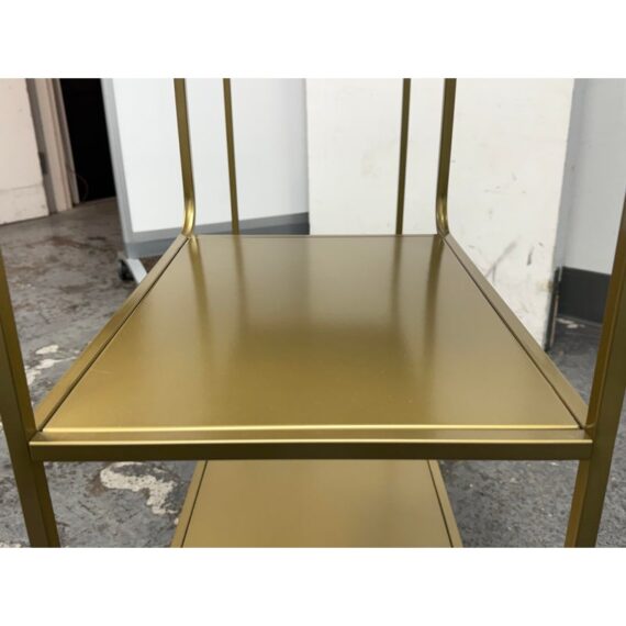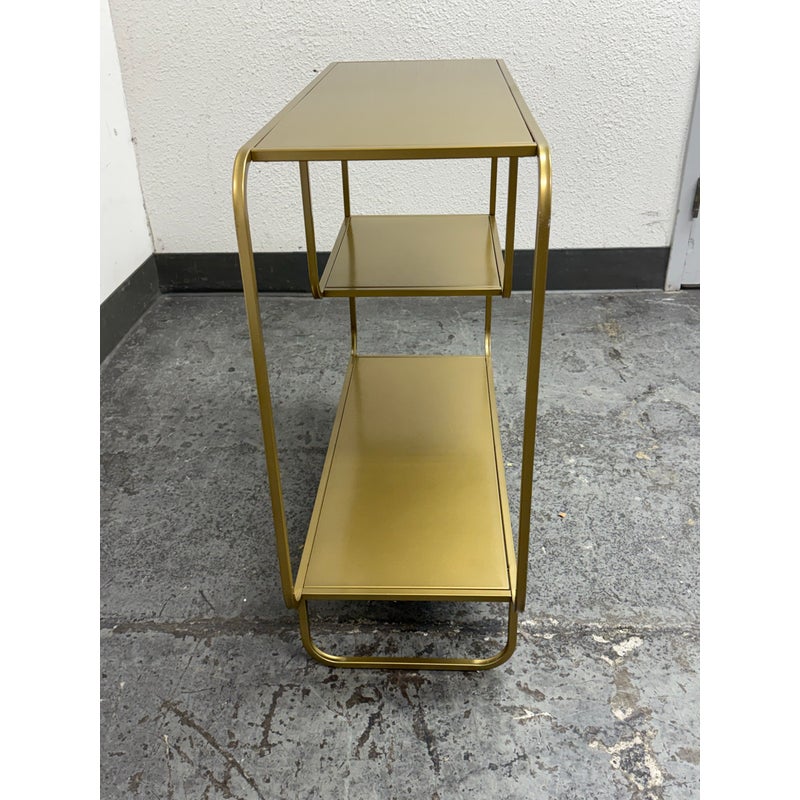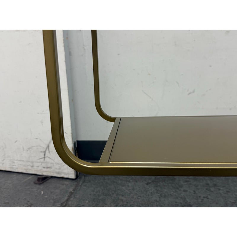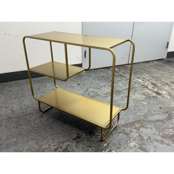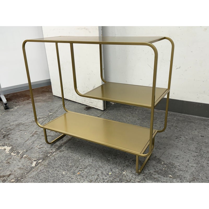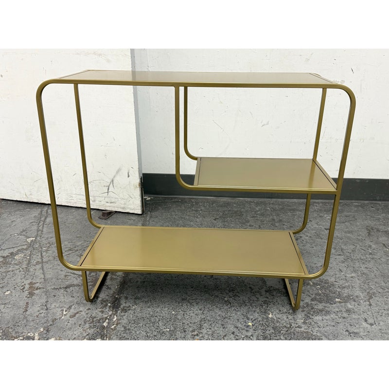 Design Plus Gallery presents Alana Gold Storage Console by Urban Outfitters. A sleek, 1960s-inspired piece that blends sculptural curves with everyday function. Its trending rounded edges and distinctive two looped legs create a modern, modular look, while multiple shelves give you plenty of room to style and store your favorite things. Crafted from powder-coated metal in a refined gold finish, the console brings a polished touch to living rooms, entryways, or dining spaces. A smaller, dedicated shelving section is perfect for records, books, or anything else you want within easy reach. In good condition, visible and minimal wear. Made in Taiwan.
