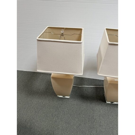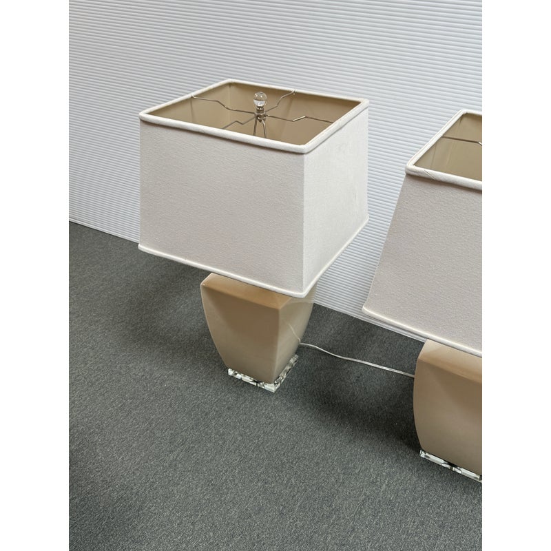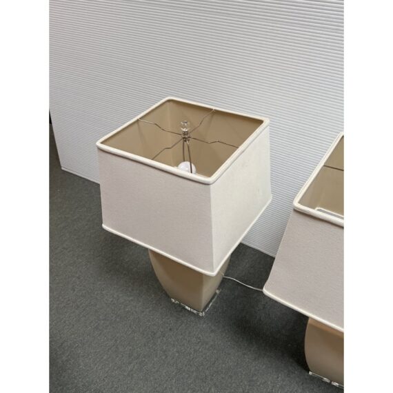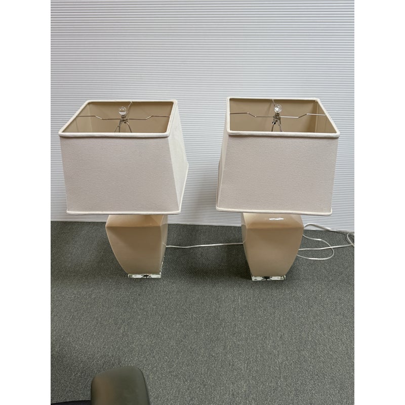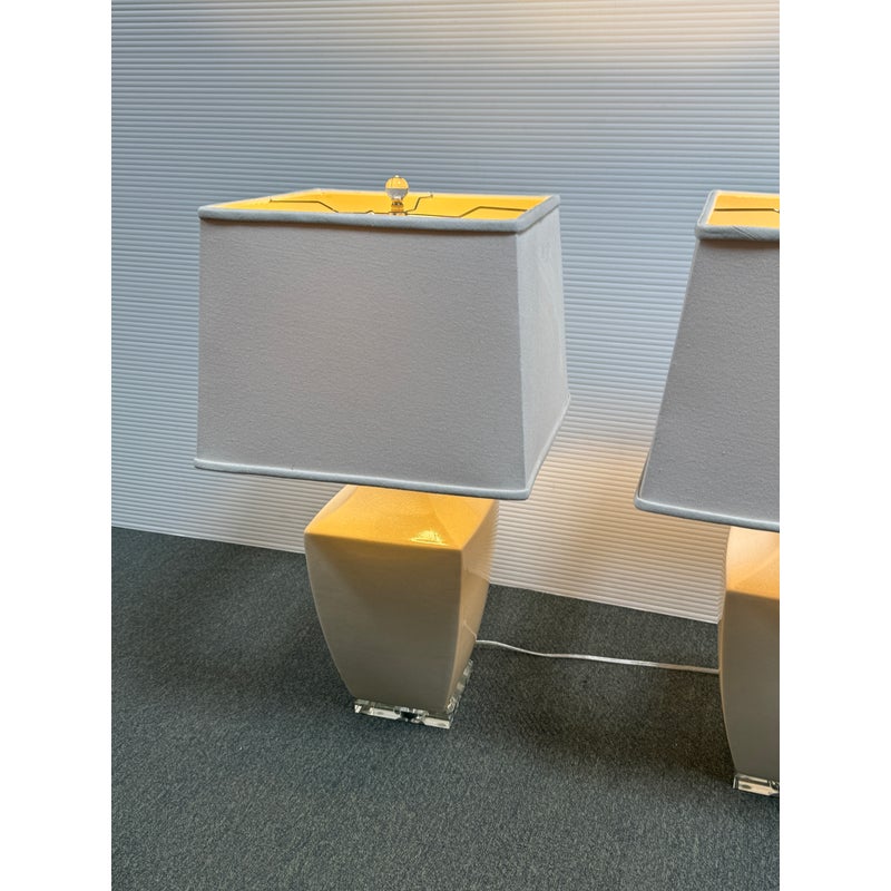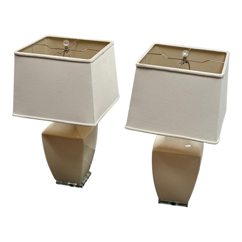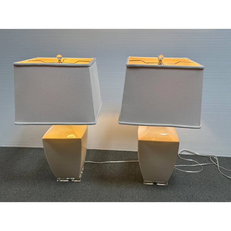 Design Plus Gallery presents a Pair of Crackle Finish Table Lamps from Uttermost. The duo offers a distressed ivory glaze on the ceramic base and is elevated on a beveled glass platform. There are polished nickel accents, a glass final atop each, and an off white fabric shade pull the lamps together. Light evidence of wear; their condition is consistent with age and use.