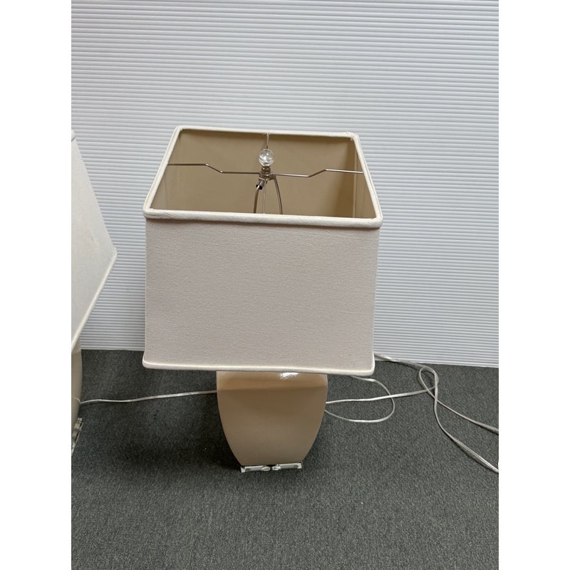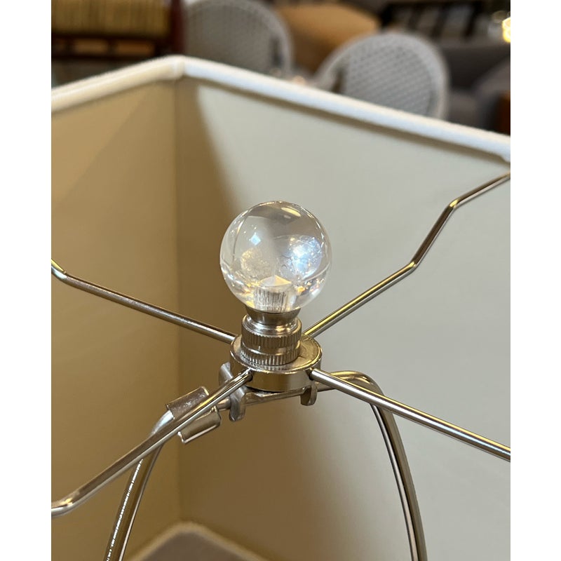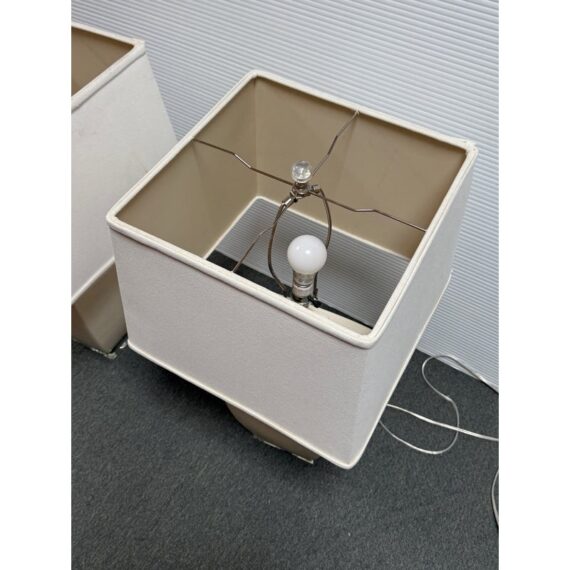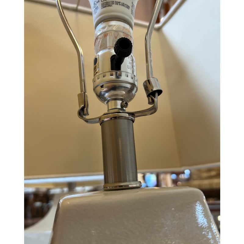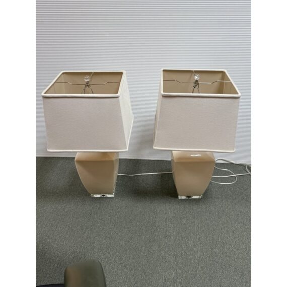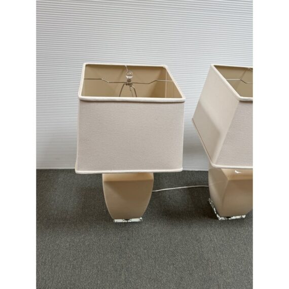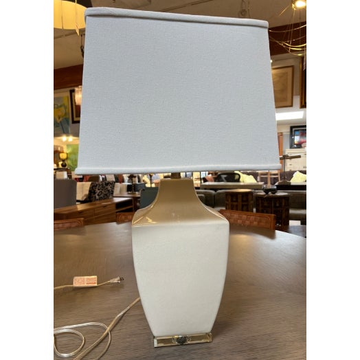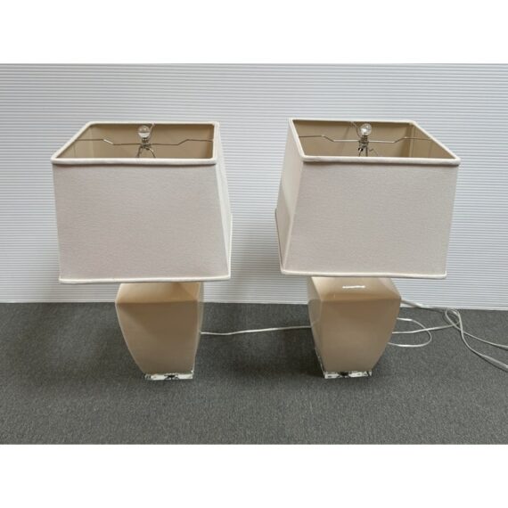 Design Plus Gallery presents a Pair of Crackle Finish Table Lamps from Uttermost. The duo offers a distressed ivory glaze on the ceramic base and is elevated on a beveled glass platform. There are polished nickel accents, a glass final atop each, and an off white fabric shade pull the lamps together. Light evidence of wear; their condition is consistent with age and use.