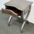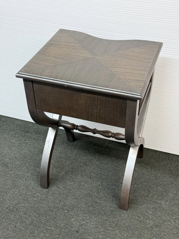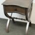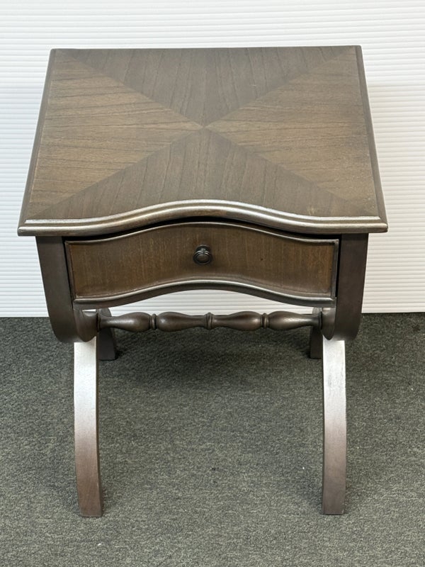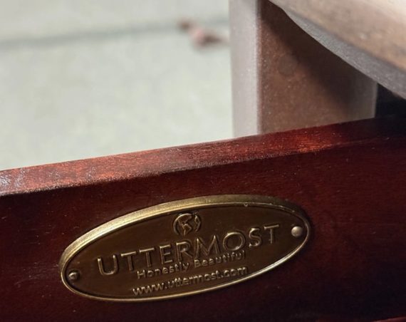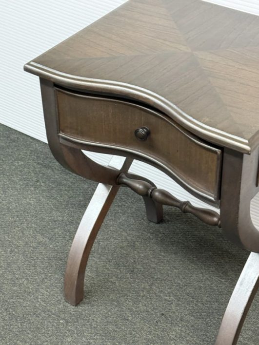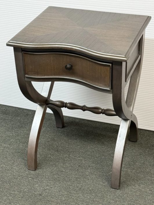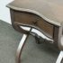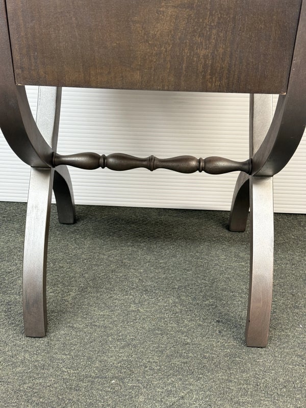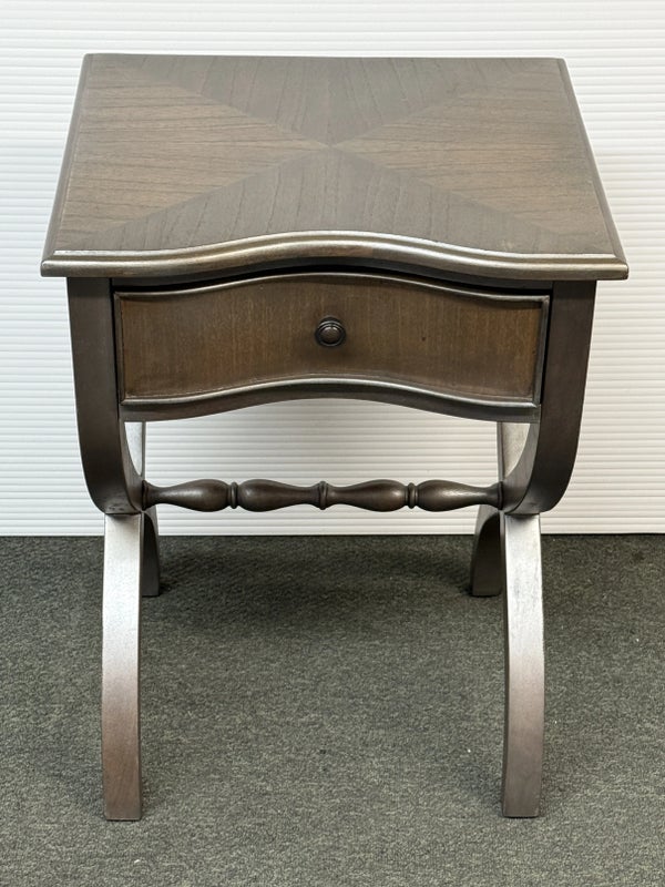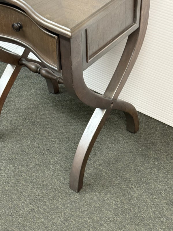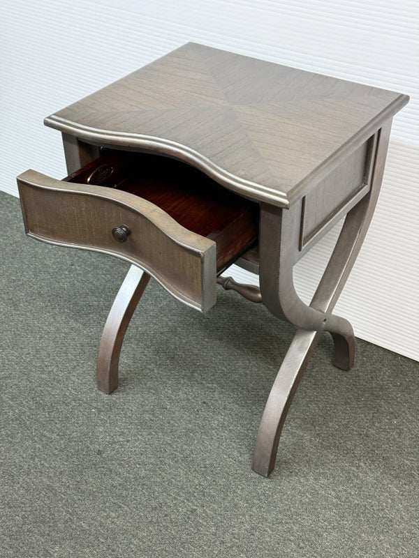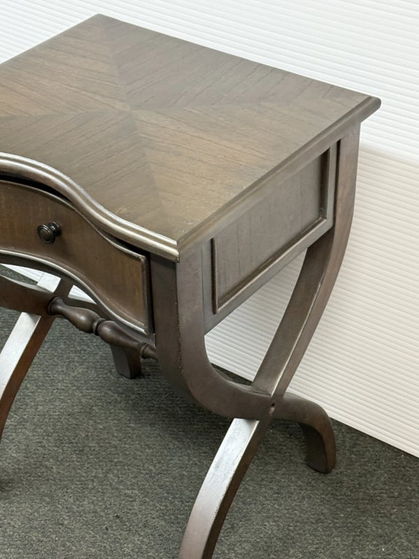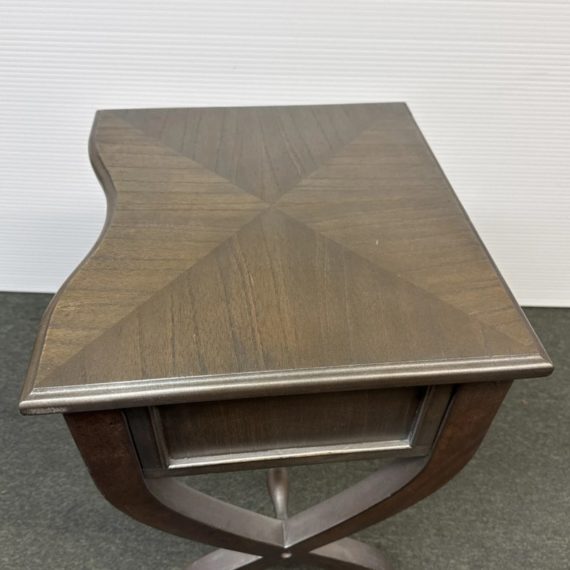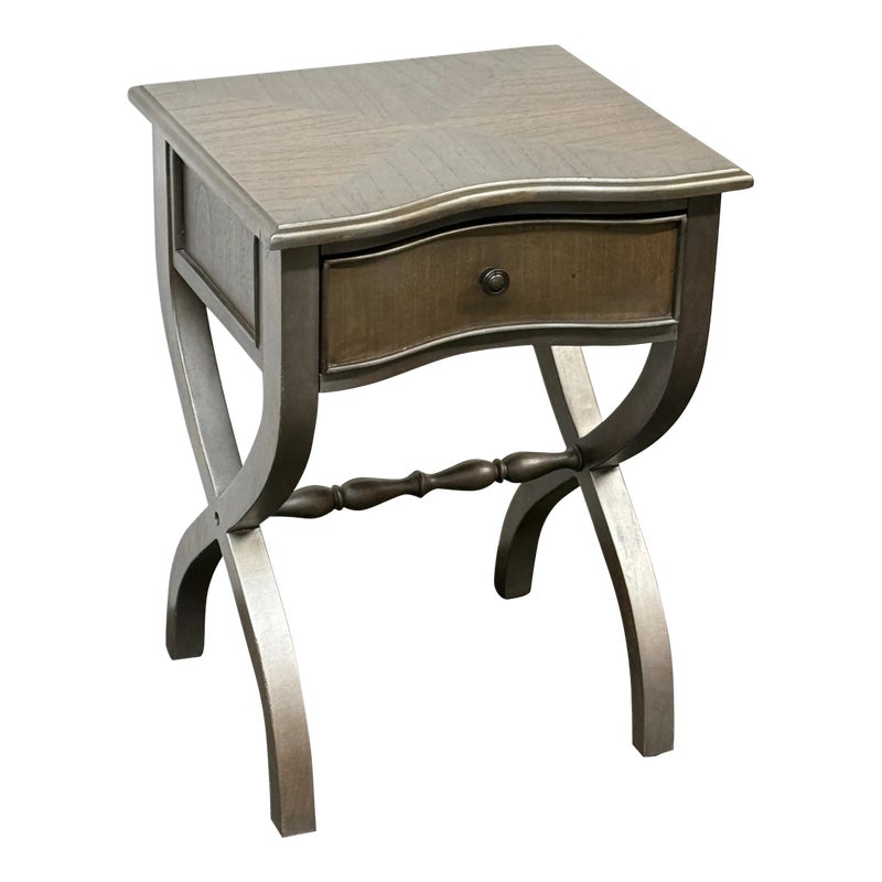 Design Plus Gallery presents the Nolea Accent Table from Uttermost. Single dove tailed drawer with twisted stretcher and x-framed legs take on campaign style with an artistic twist. The finish is a resembles hand applied silver leaf, antiqued in a way but definitely more modern in its era. The table is in good condition with minimal surface wear for its usage.