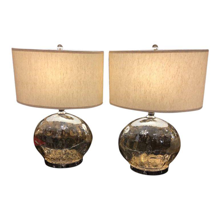 Design Plus Gallery has a brand new pair of Piadena Table Lamps by Uttermost. These lovely pair are a iridescent water glass accented with plated polished nickel details. The oval hardback drum shade is a light beige linen fabric with natural slubbing. Designed by David Frisch. Straight out of the box with original packaging wrap on shades.
