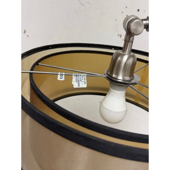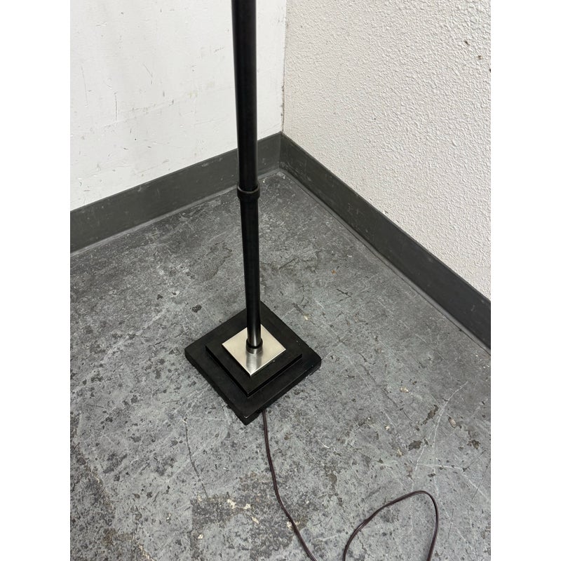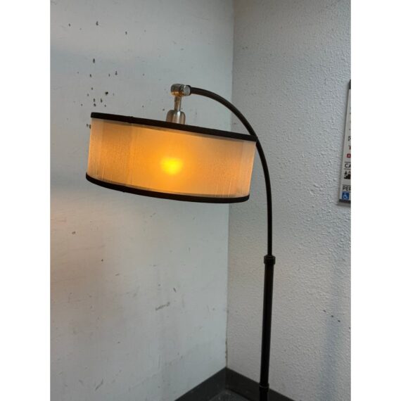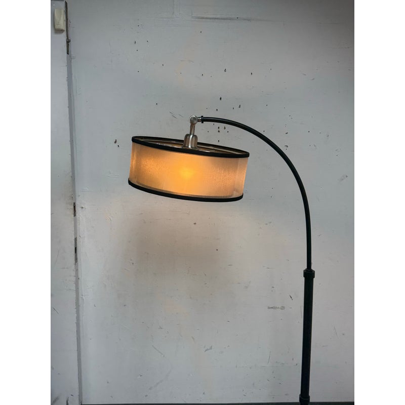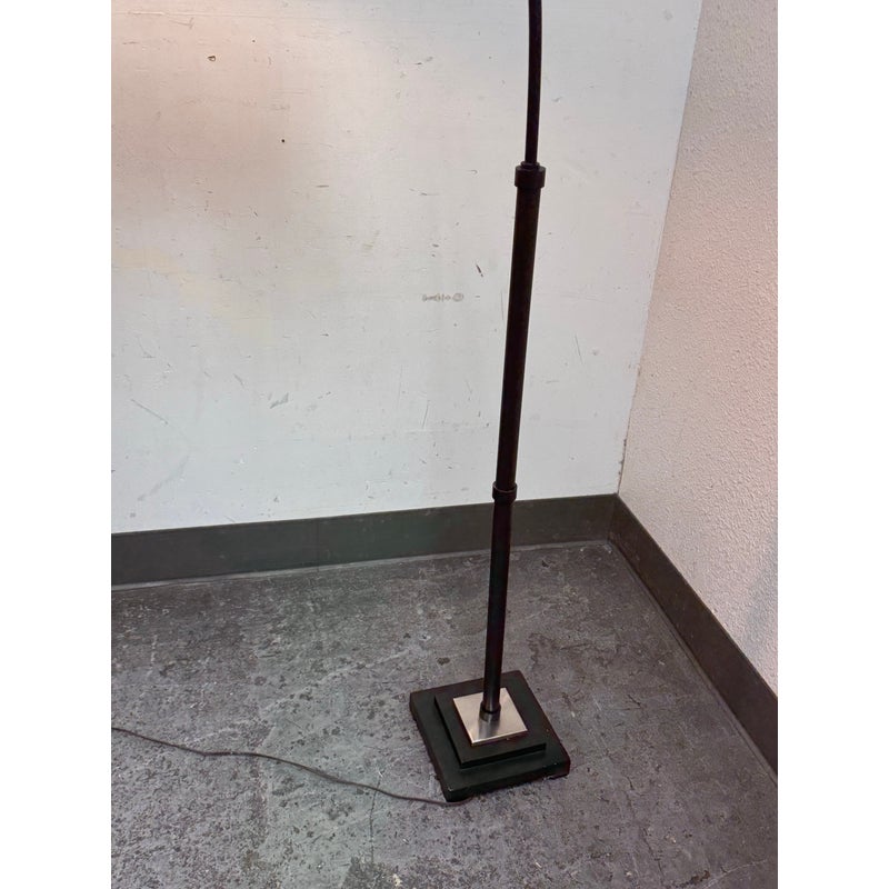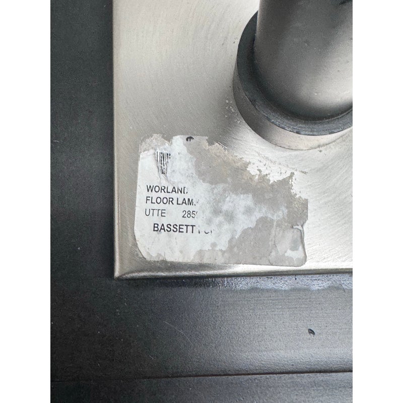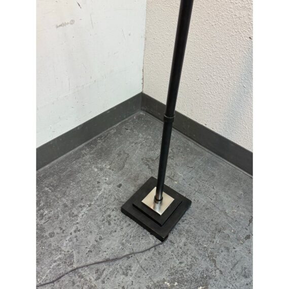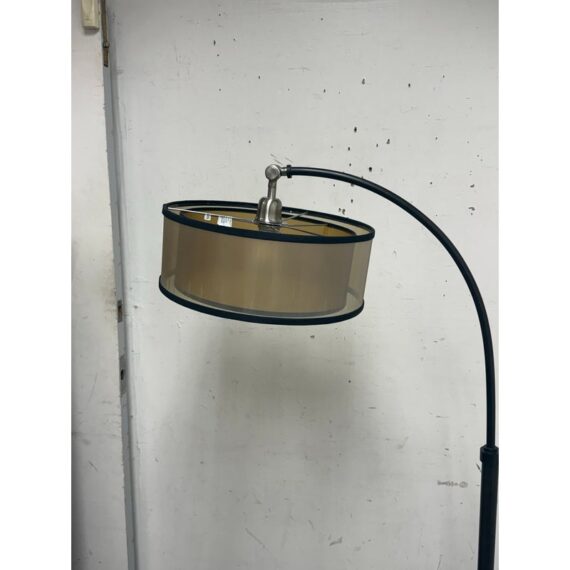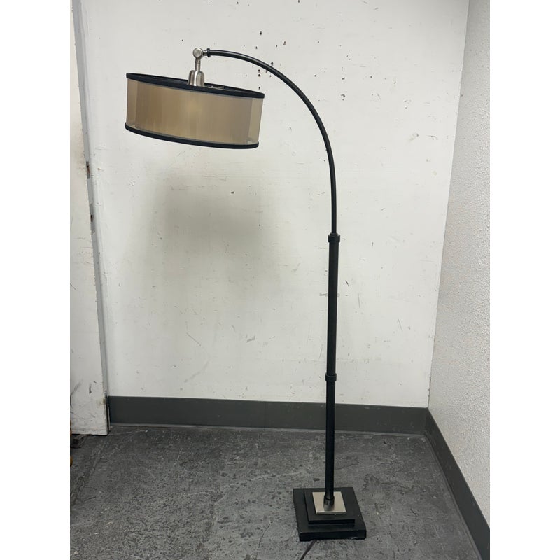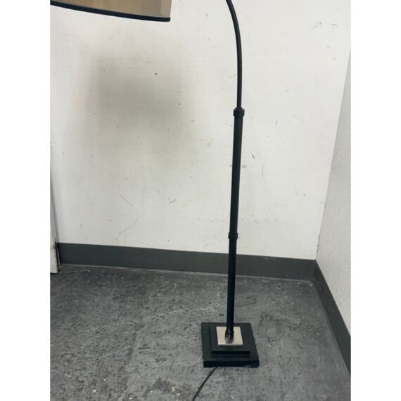 Design Plus Gallery presents a Worland Arc Floor Lamp from Uttermost. A dusty matte black finish with brushed aluminum details and pivoting shade. In good condition, visible and minimal wear from usage.