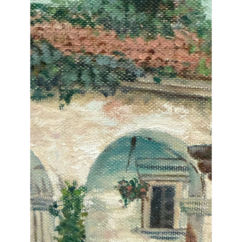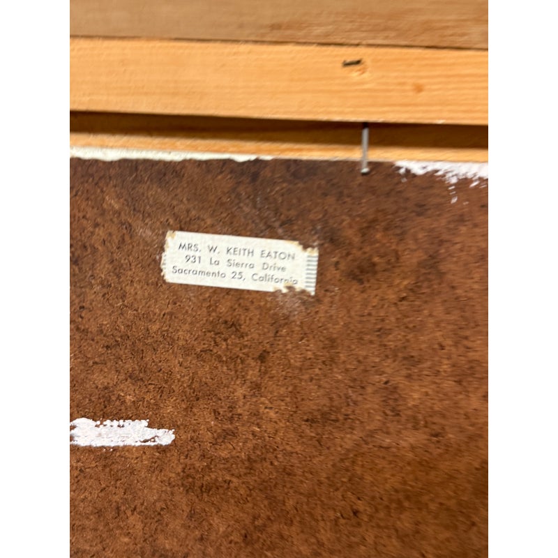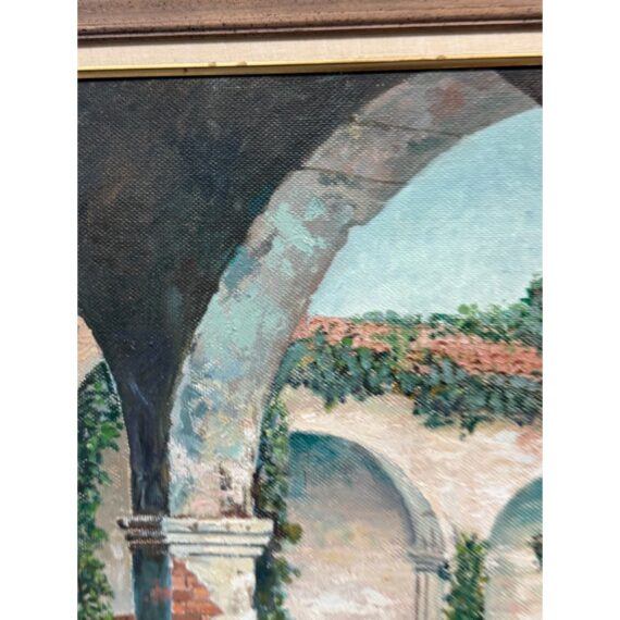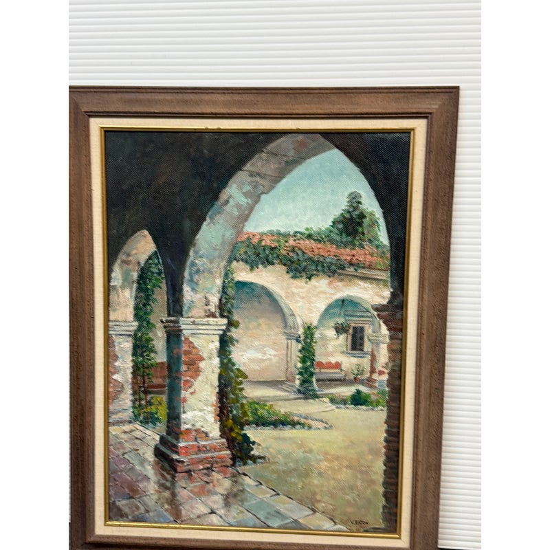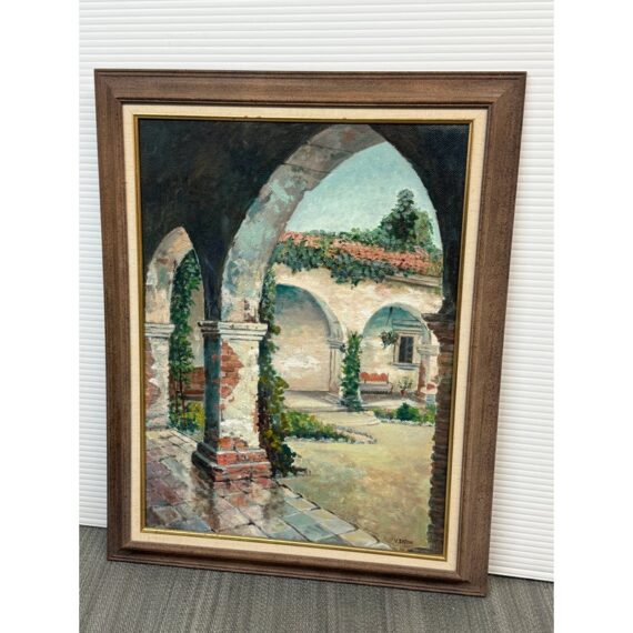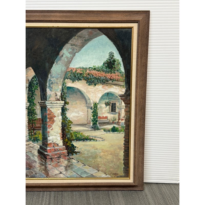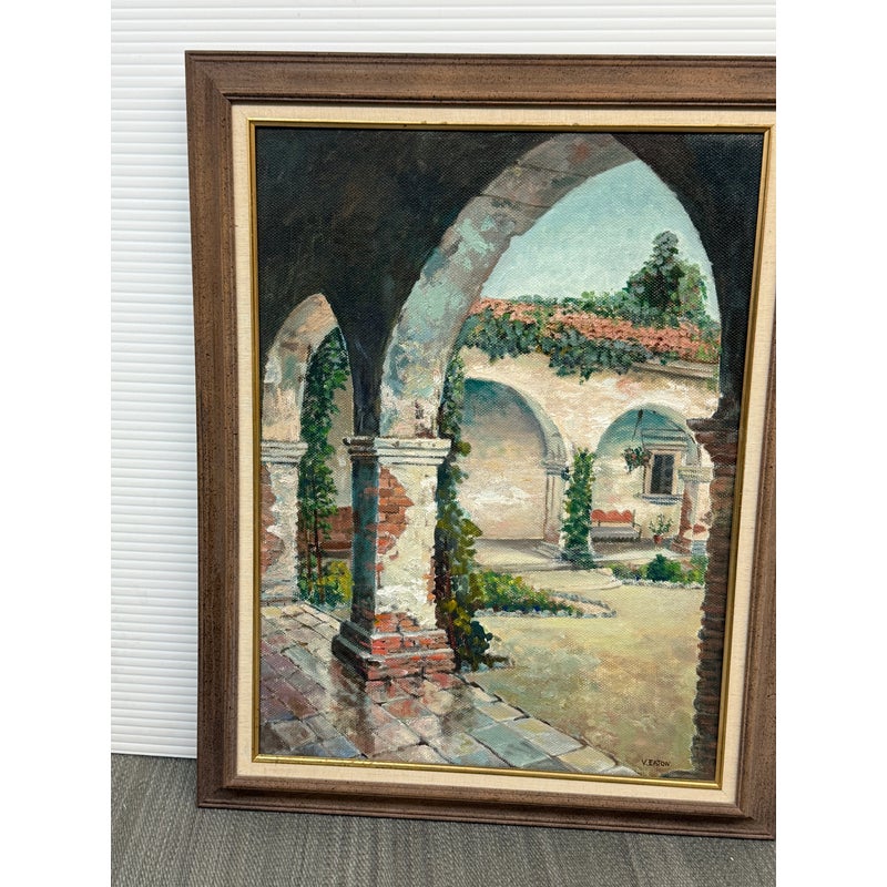 Design Plus Gallery presents “Mission at San Juan Capistrano”, an Original Painting by V. Eaton. The painting offers a perspective under the eaves of the iconic arches of the Mission, a historic landmark. Known as the “Jewel of California Missions” the distinctive architecture and its gardens are entwined with colorful details. Signed by artist on lower right corner; matted and framed for dramatic effect. Little surface wear, condition is good.