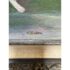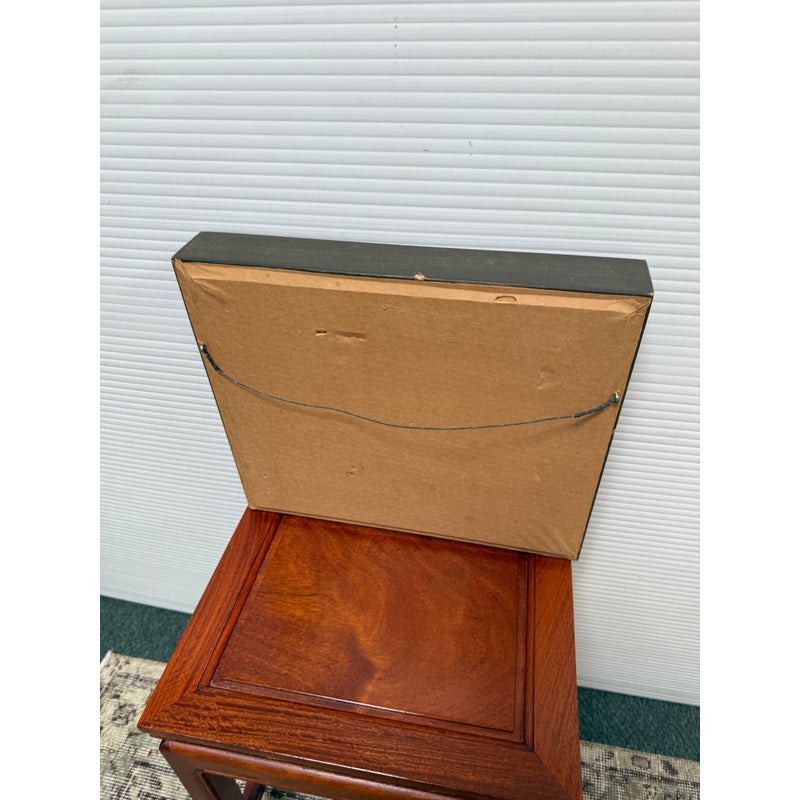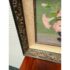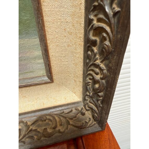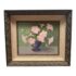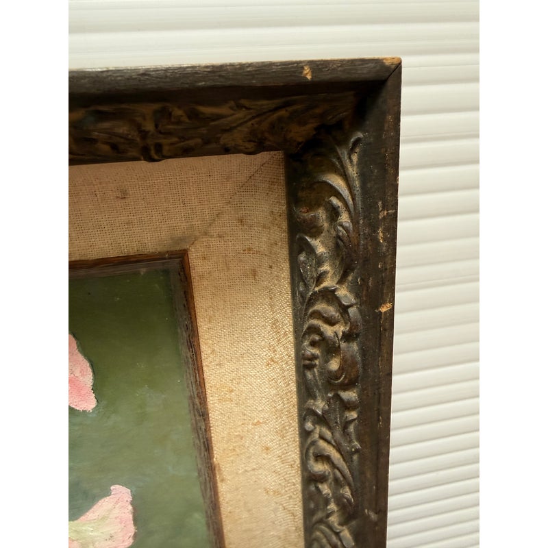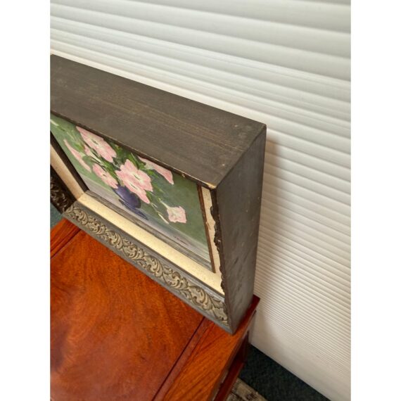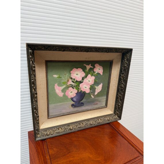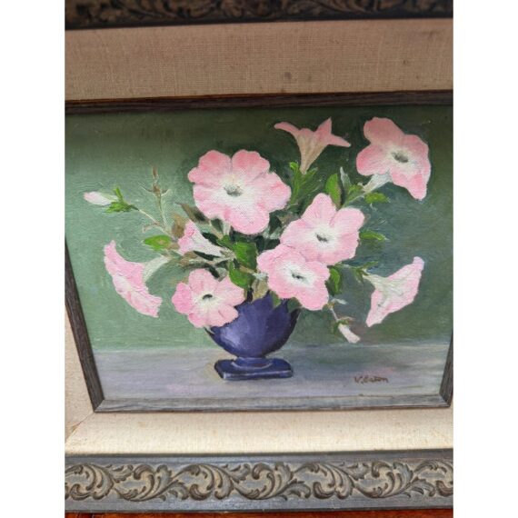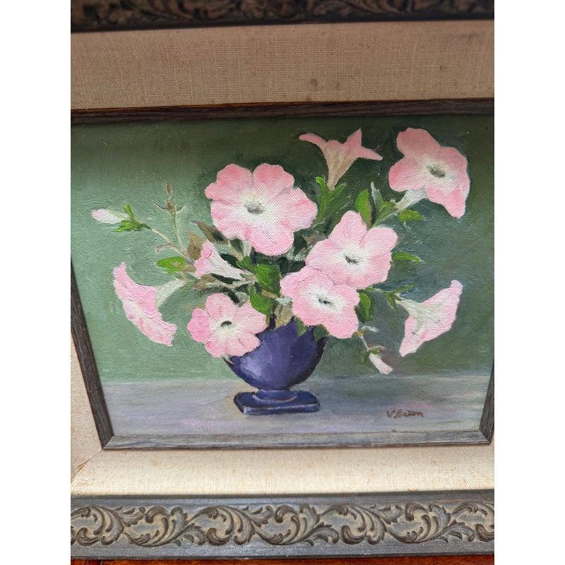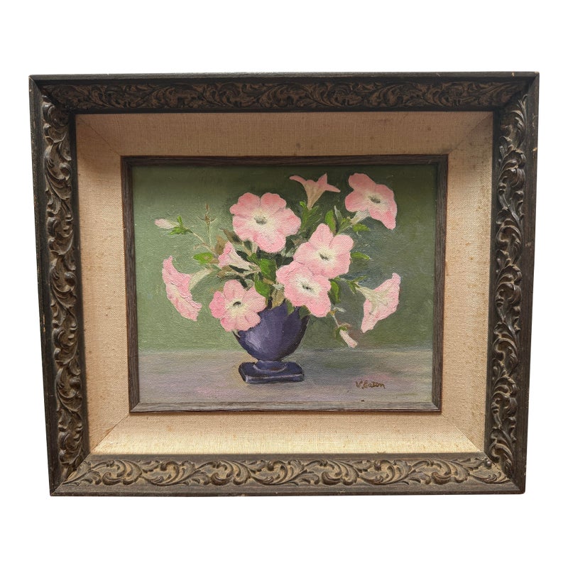 Design Plus Gallery presents a Still Life Artwork of Pink Petunias by V. Eaton. The artwork has a style of encasing that is central in mid 20th century works with a linen matte and slightly metallic gold carved frame. The artwork shows a muted background light green, a cement gray tabletop, and an urn shaped blue vase. Multiple pink petunia stems are jutting out from all angles of the pot, and the artists signature is present at the lower right side of the piece. It is in fair condition for its vintage usage.