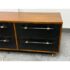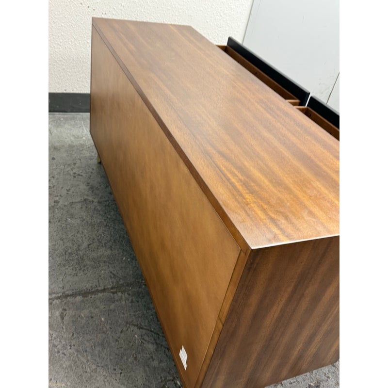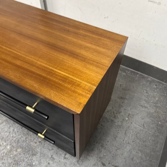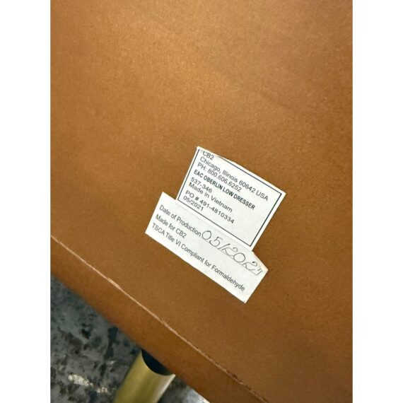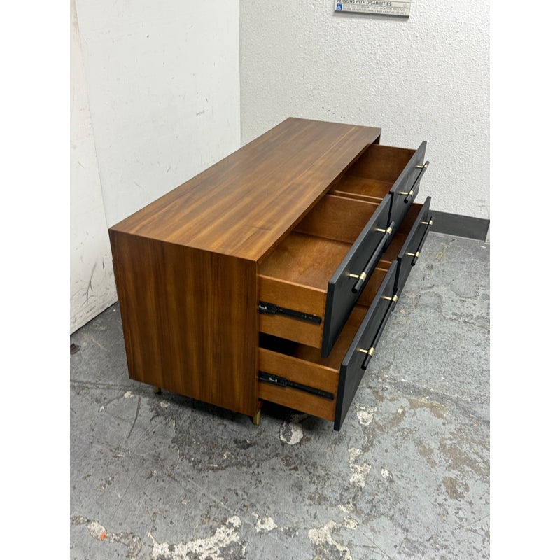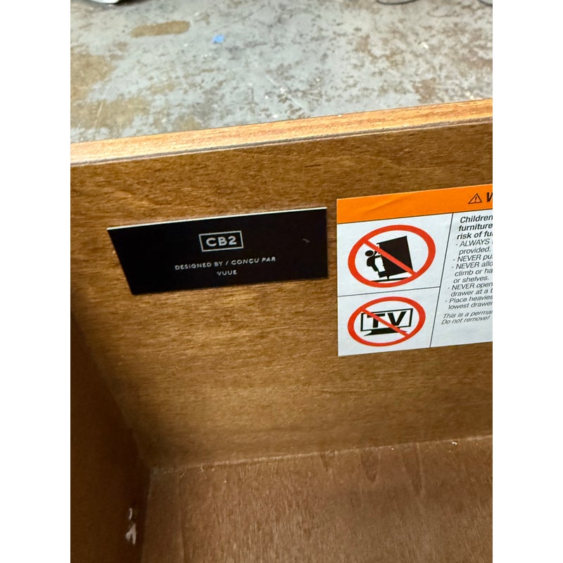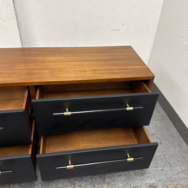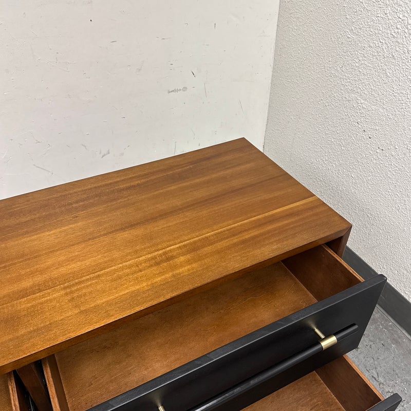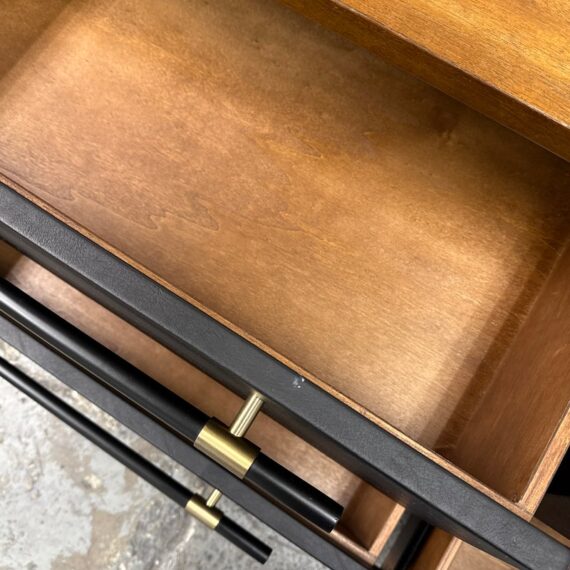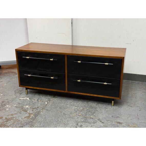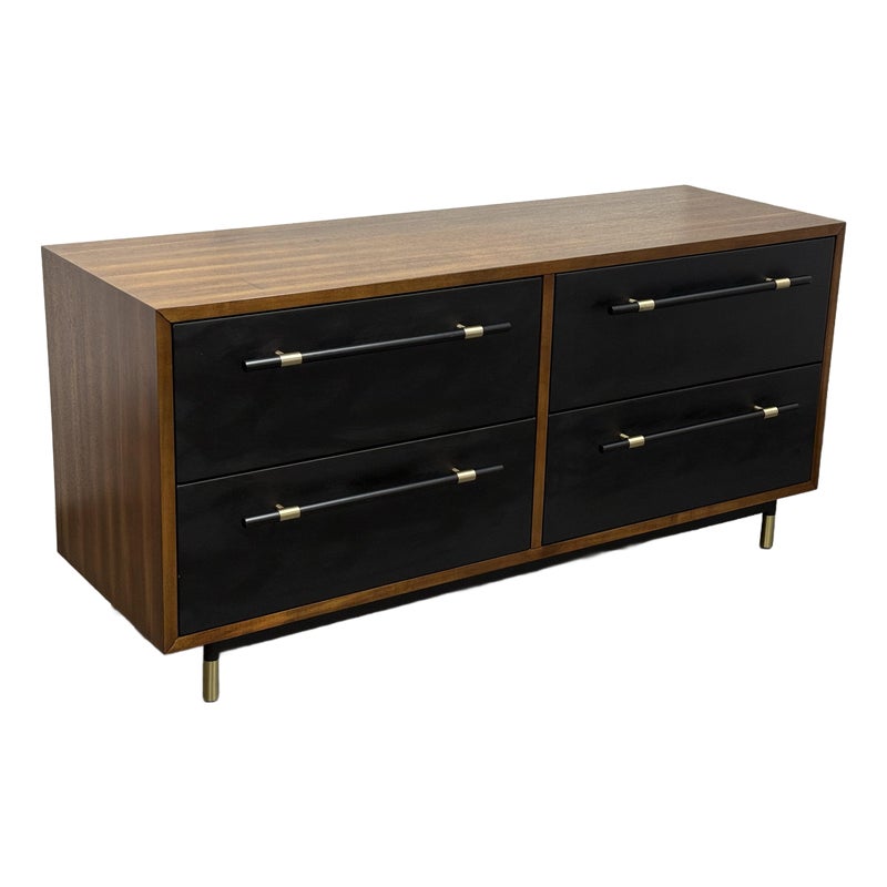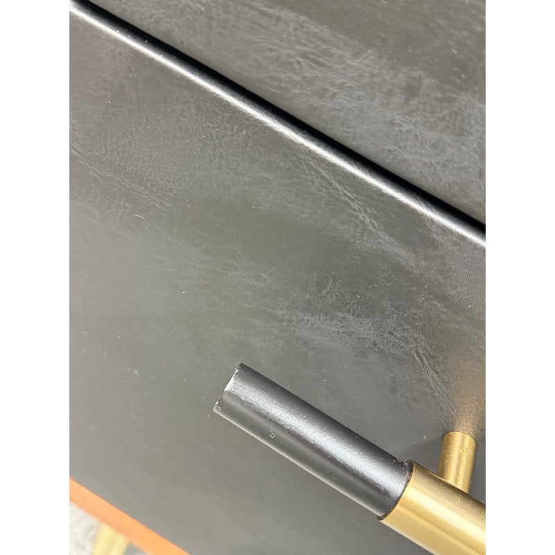 Design Plus Gallery presents the Oberlin Four Drawer Vegan Leather Dresser Designed by VUUE for CB2. Minimal wood frame holds four deep drawers fronted with beautiful black vegan leather. Slim black wood handles with brass detail stretch nearly the length of the drawers. Inset cylinder-like legs clad in brass create a clean, elegant line. Is in good condition for its usage with minimal surface wear.