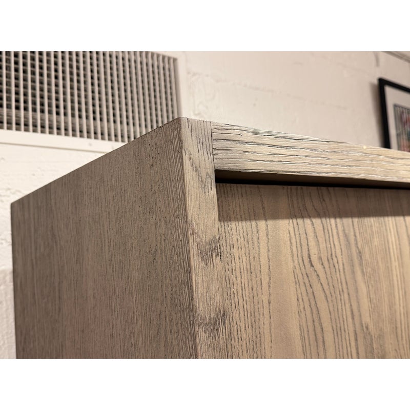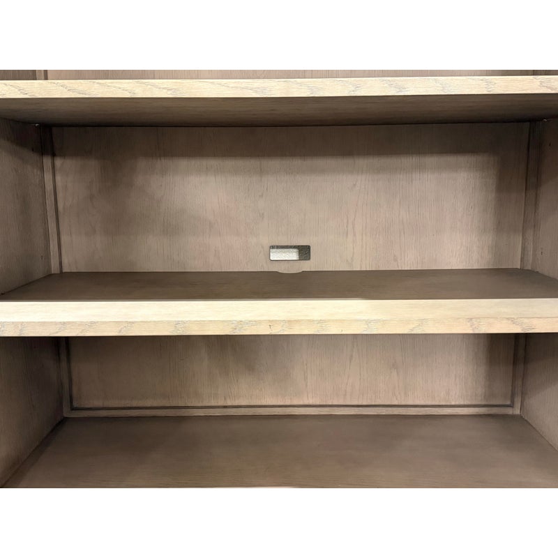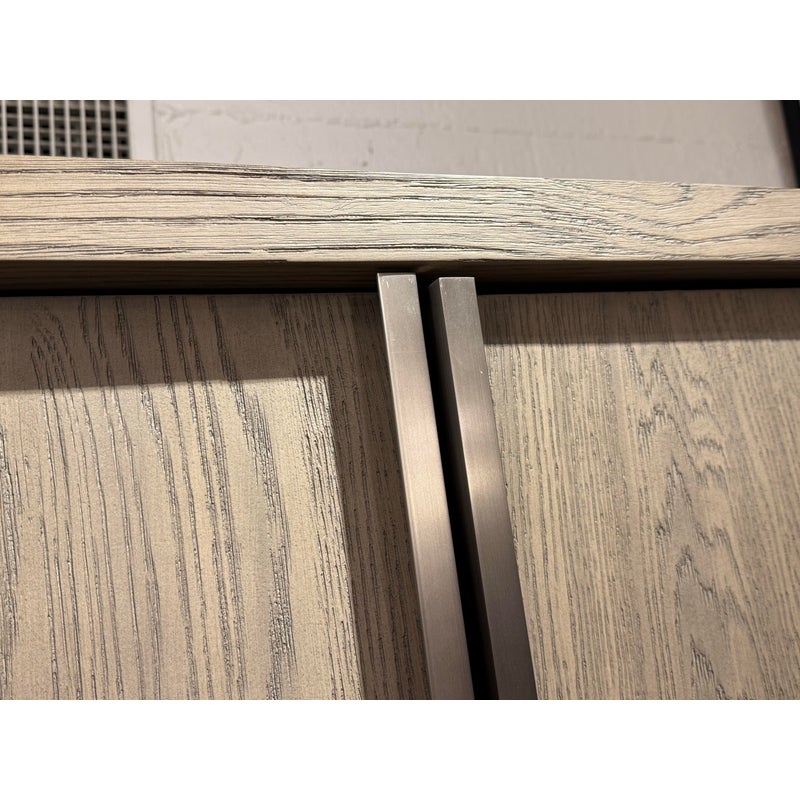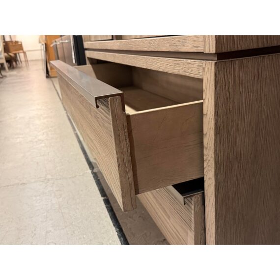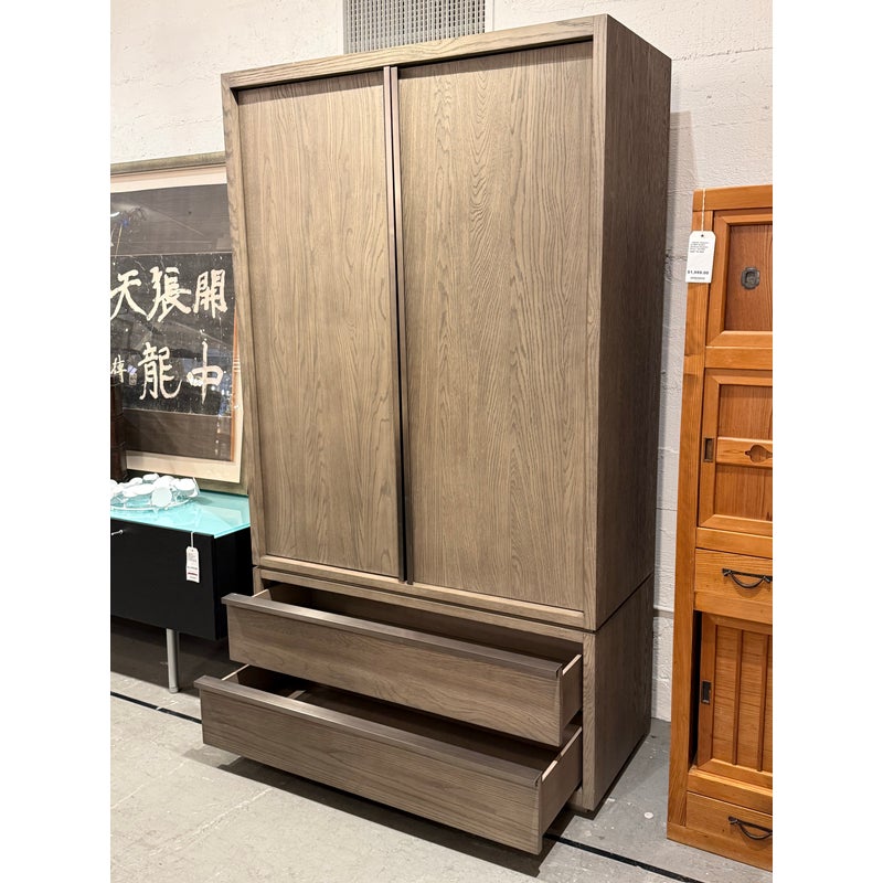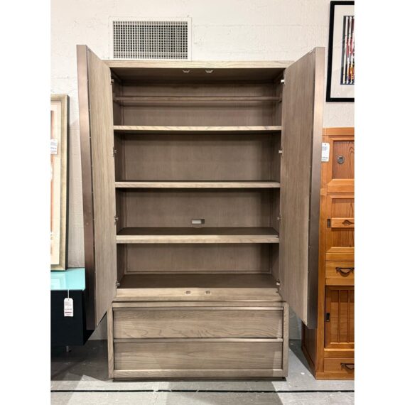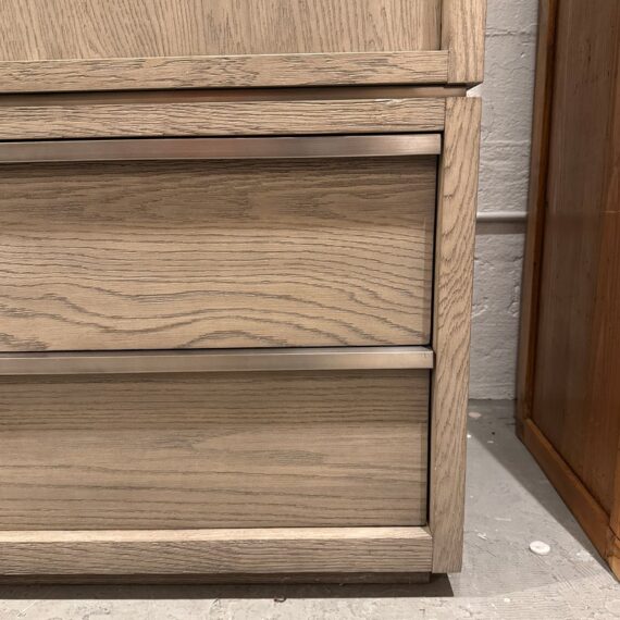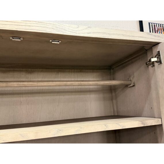 Design Plus Gallery presents the Bezier Armoire Designed by Van Thiels for Restoration Hardware. Inspired by 1970s postmodern design, the silhouette’s bold proportions and clean lines offer a style both rustic and refined. The collection’s offers slender metal accents are a striking counterpoint to the naturally rich grain of American white oak. The single piece cabinet has great storage potential with three adjustable shelves inside that cabinet doors, hanging rod bar, and two lower shelves. Can turn into a media cabinet with open back for cord management. Is in good condition with visible and minimal wear for its usage.