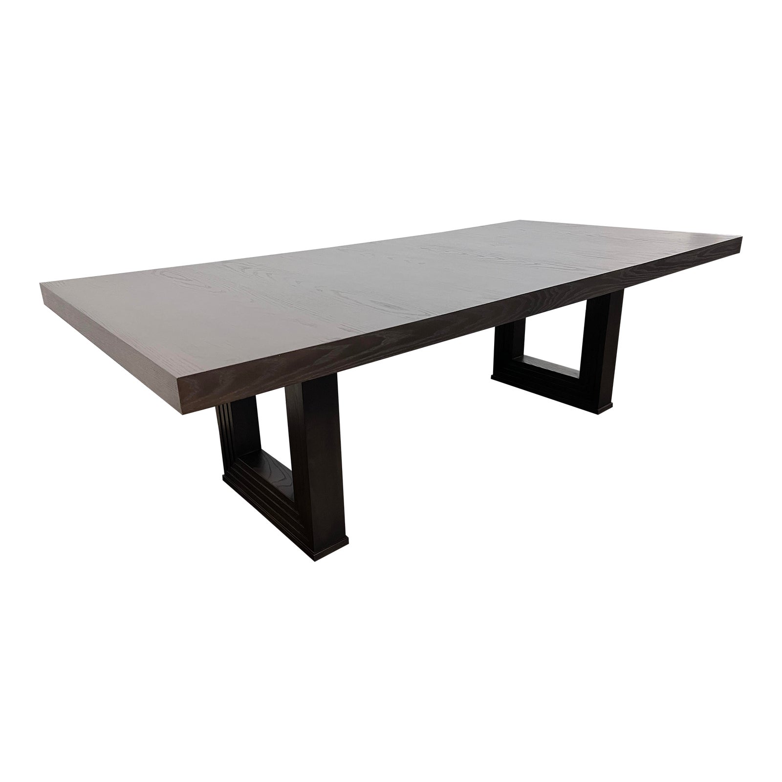 Design Plus Gallery presents a Winfield Table by Vanguard Furniture. Designed b Michael Weiss. The dining table is part of the Michael Weiss collection. This table features a double square cut-out pedestal base, giving it a modern and eye-catching look. The table is crafted from high-quality ash solid woods and veneers, ensuring its durability and longevity. The Coventry finish adds a touch of elegance and sophistication to the overall design. With its style, this dining table seamlessly blends with various design aesthetics, making it a versatile piece that can easily complement any home decor. Whether you prefer a minimalist, industrial, or traditional look, this dining table is the perfect addition to any dining room or eat-in kitchen area. Gather your family and friends around this gorgeous table and create unforgettable memories over delicious meals and engaging conversations. This is in a good condition.