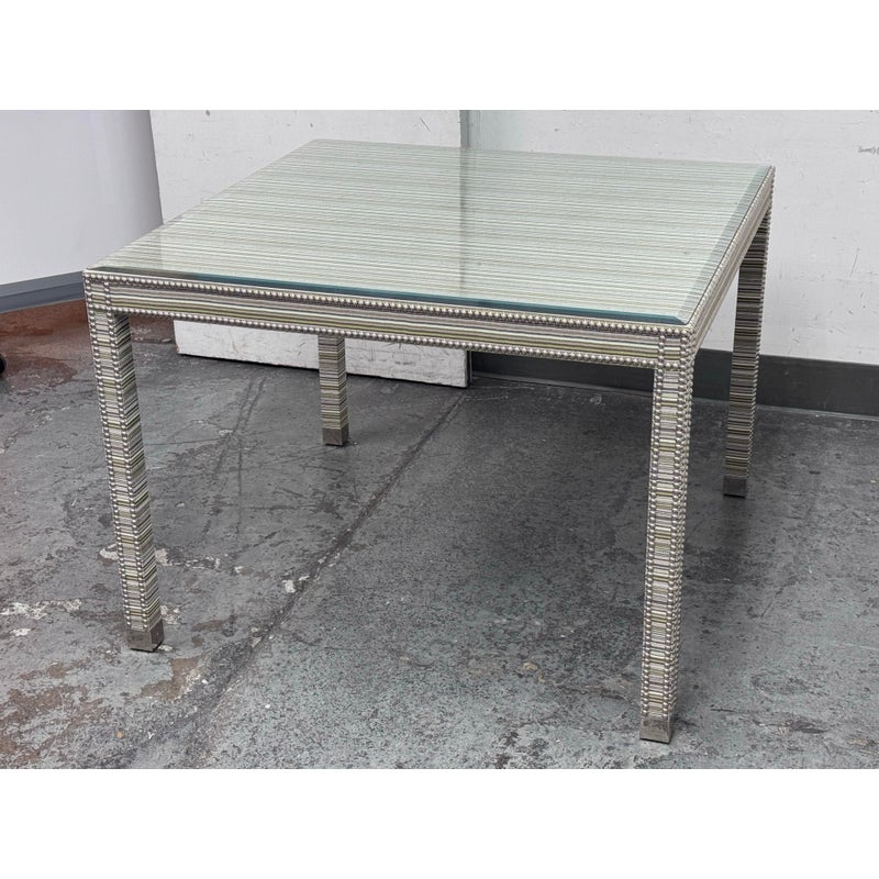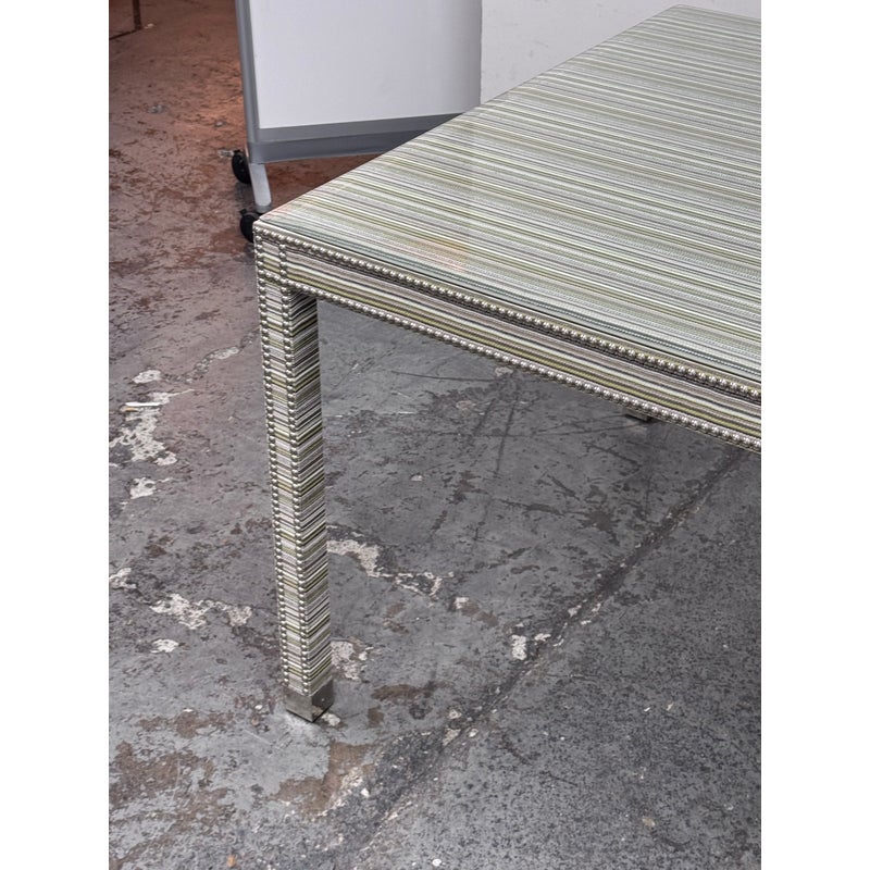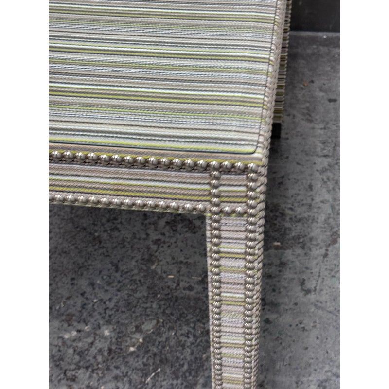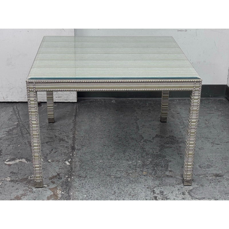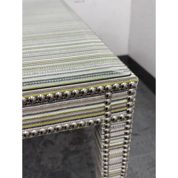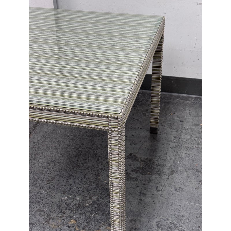 Design Plus Gallery presents the Tate Upholstered Game Table from Vanguard Furniture. The table has a woven, highly textured wrap around the steel frame table. Very similar to Missoni in fashion with its alternating striped colors/tones. There is nailhead around the seams to amp the look up as well as protect the seams from fraying. Glass table top to preserve the fibers. Is in good condition with minimal wear for its usage.