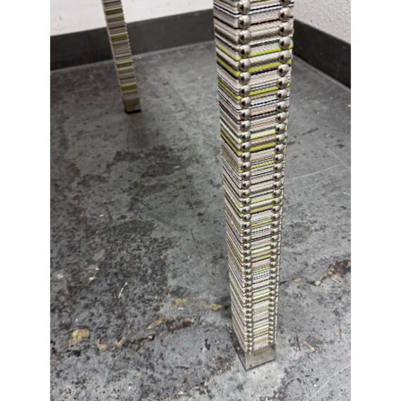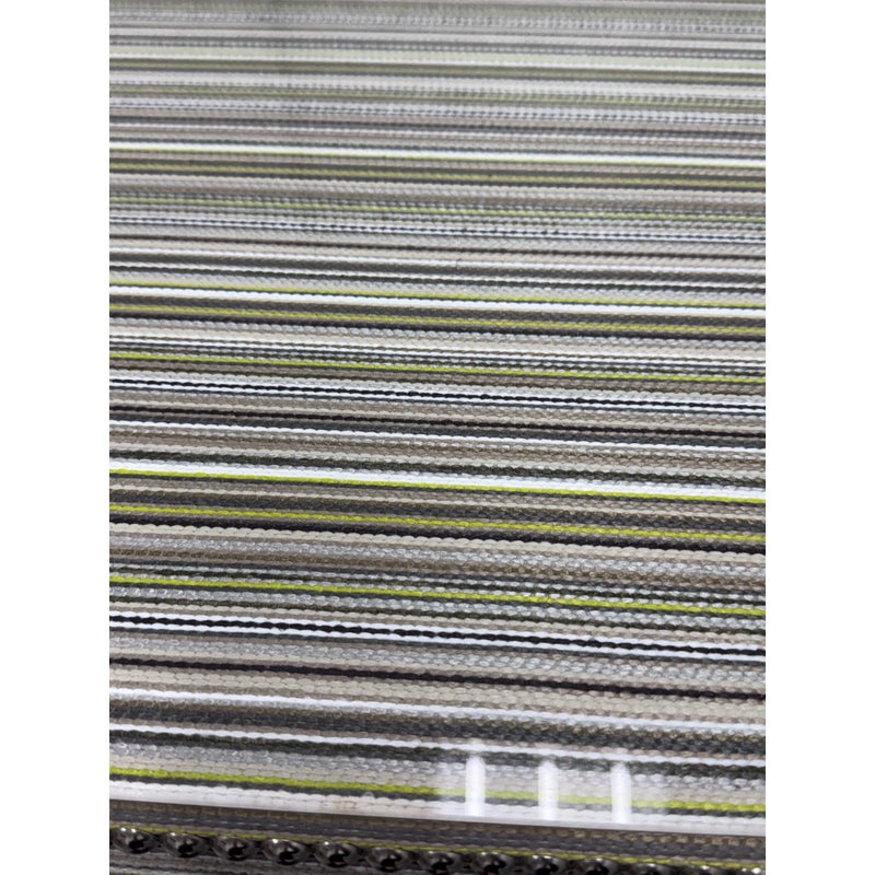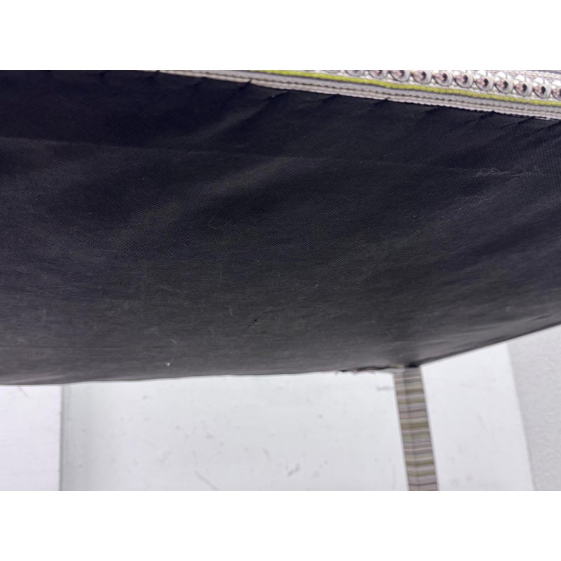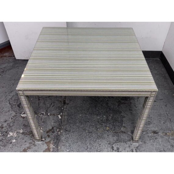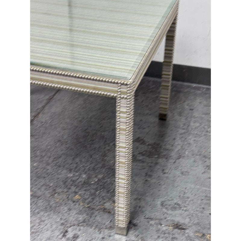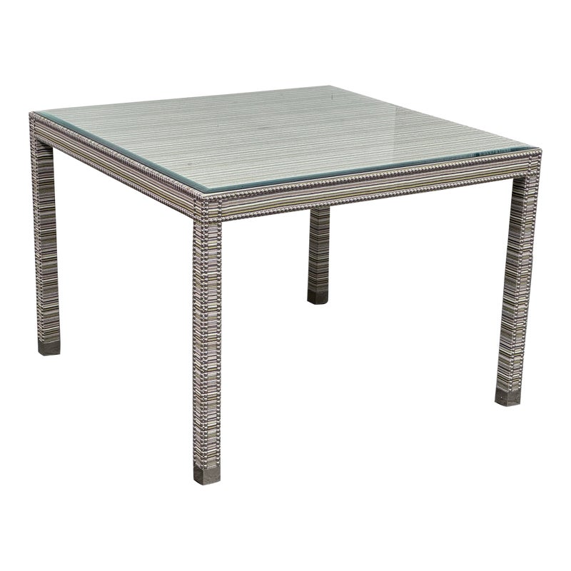 Design Plus Gallery presents the Tate Upholstered Game Table from Vanguard Furniture. The table has a woven, highly textured wrap around the steel frame table. Very similar to Missoni in fashion with its alternating striped colors/tones. There is nailhead around the seams to amp the look up as well as protect the seams from fraying. Glass table top to preserve the fibers. Is in good condition with minimal wear for its usage.