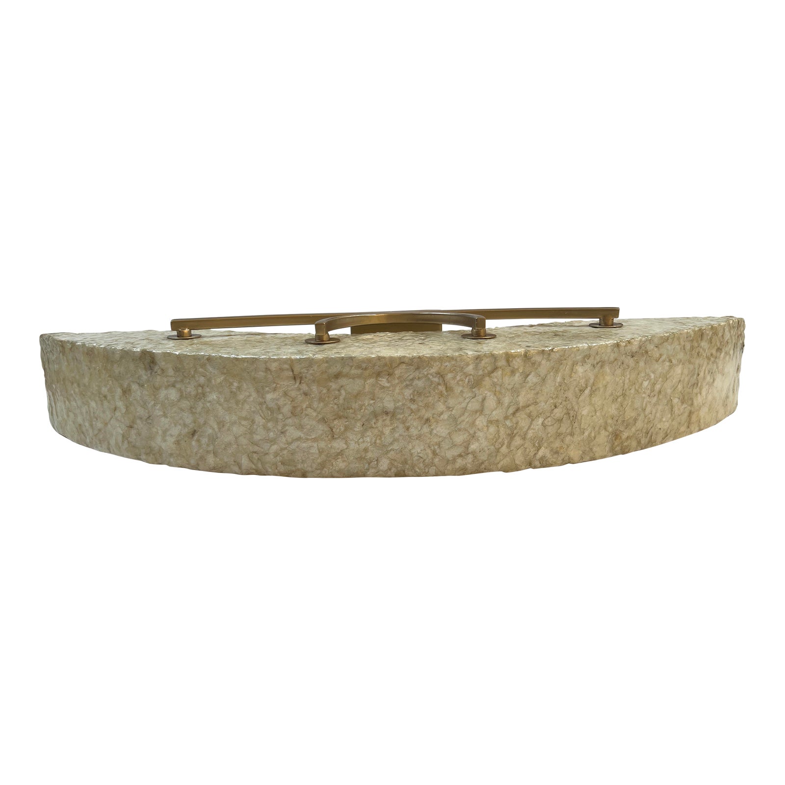 Design Plus Gallery presents the Radius Radius Sconce. The unique light combines a soft curving silhouette with natural materials. The clean curve of frosted acrylic diffuser has hand-applied sustainable capiz shell. The pearl-like luster of this shade is complemented by the warm Gold Dust finish on the steel base. Rated for dry environs. Uses 4 Soft White Halogen bulbs (not included) Weight 5lbs. Little evidence of wear; condition consistent with age and use.