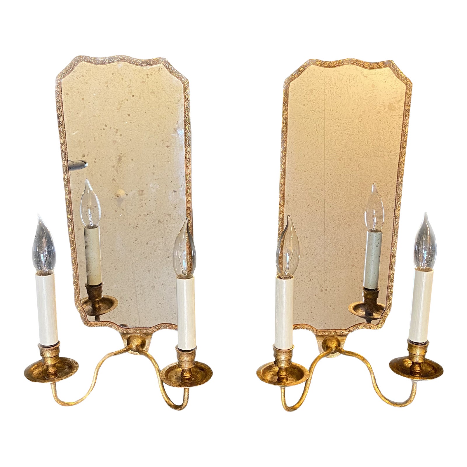 Design Plus Gallery presents the Vaughan Designs Pair of Swedish Giltwood Candlestick Wall Sconces. Based on a Swedish antique, each wall light has delicately applied gold decoration around the antiqued mirror’s edge in the style of Swedish neo-classicism. Sinous arms present a pair of “candlesticks” (bulbs not included.) Scaled for drama, the elegant antiqued sconces can brighten up any hallway or living room. Little evidence of wear; condition consistent with age and use.