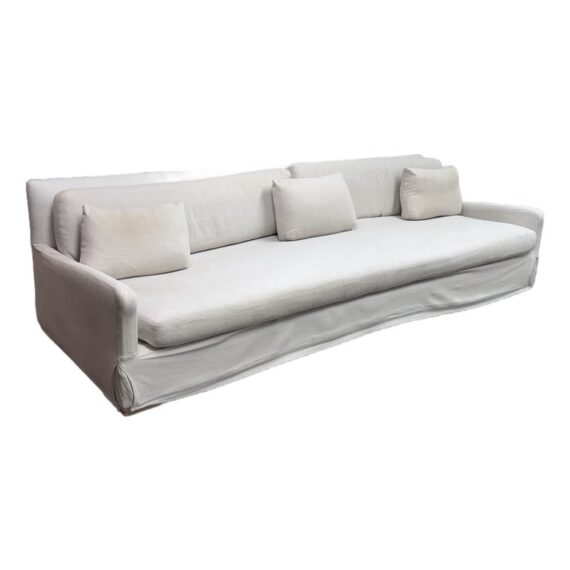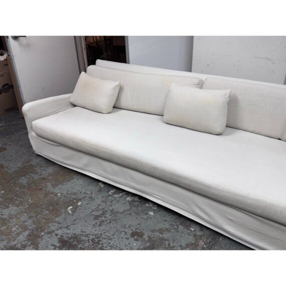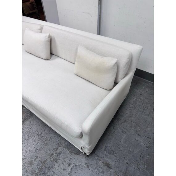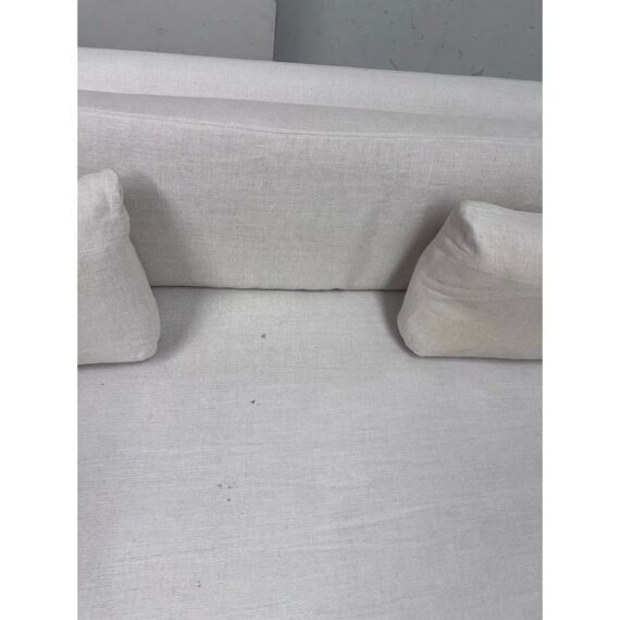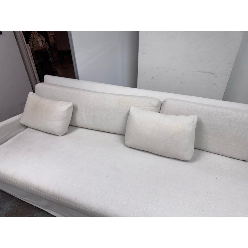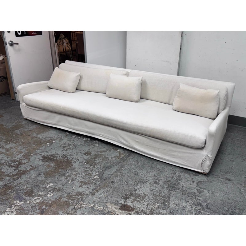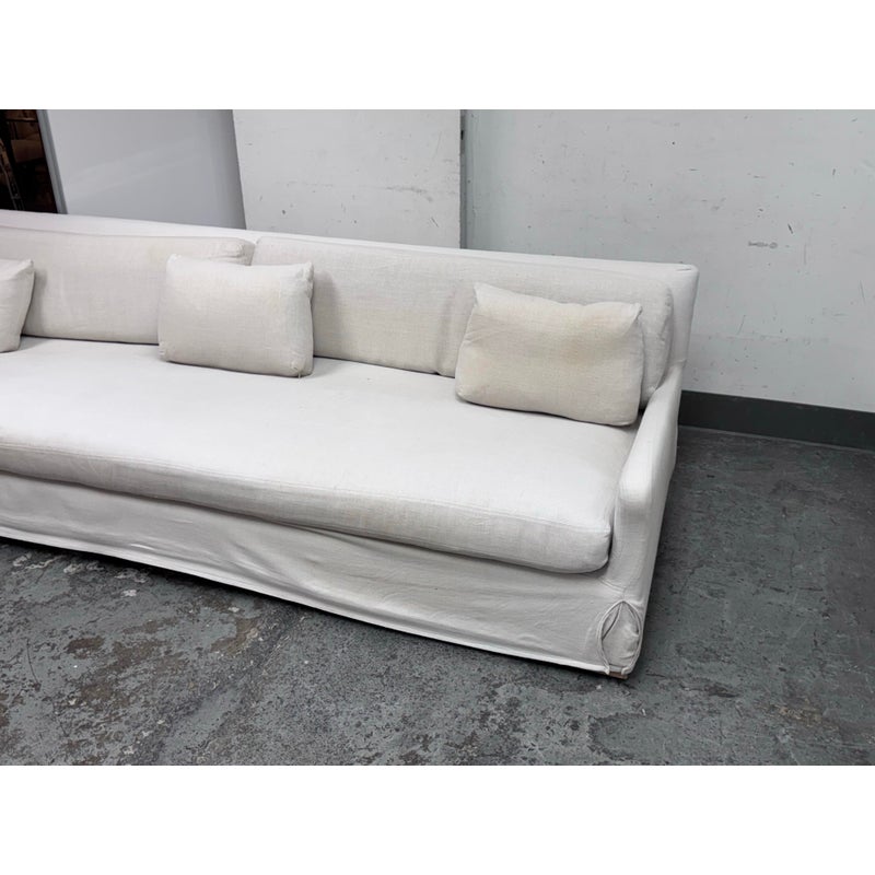 Design Plus Gallery presents the Millie Sofa by Verellen for Urban Natural. The Millie sofa has a sleek, modern design with clean lines, a low-profile silhouette, deep loose seating, and plush loose back cushions. Verellen offers the very best in luxurious comfort, original Belgian furniture design, and traditional American hand craftsmanship. Family-owned and operated in North Carolina, their heirloom-quality pieces are handmade with careful attention and thoughtful innovation that stands the test of time. The slipcovered sofa is wrapped entirely in Belgian Linen weave that has a singular bench seat cushion with a full width back cushion and three matching throw/lumbar pillows. Visible surface wear is present to the fabric and it is considered to be in fair condition. Would need a professional cleaning. Made in the USA.