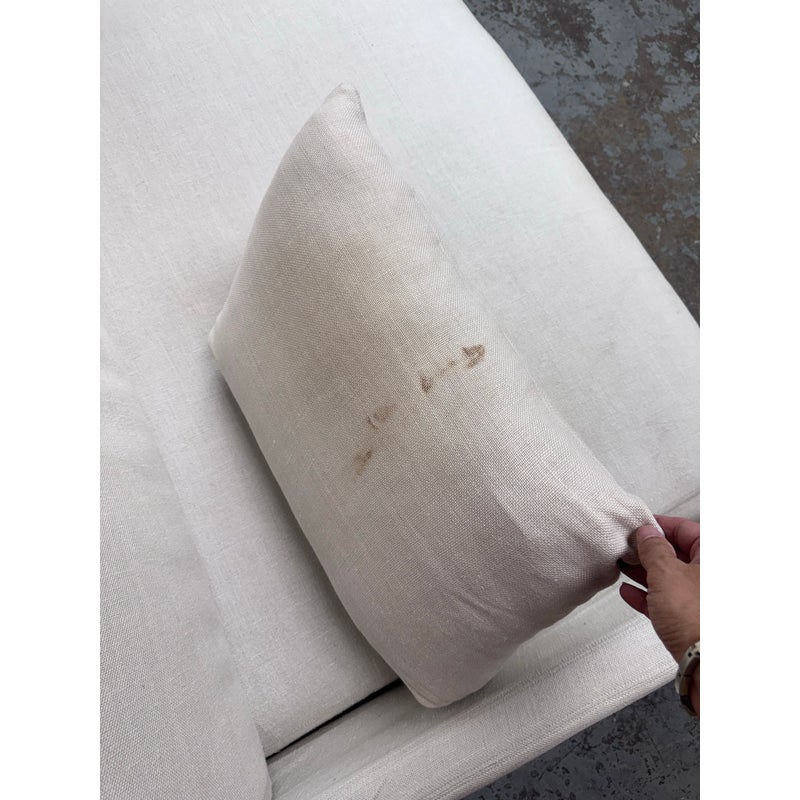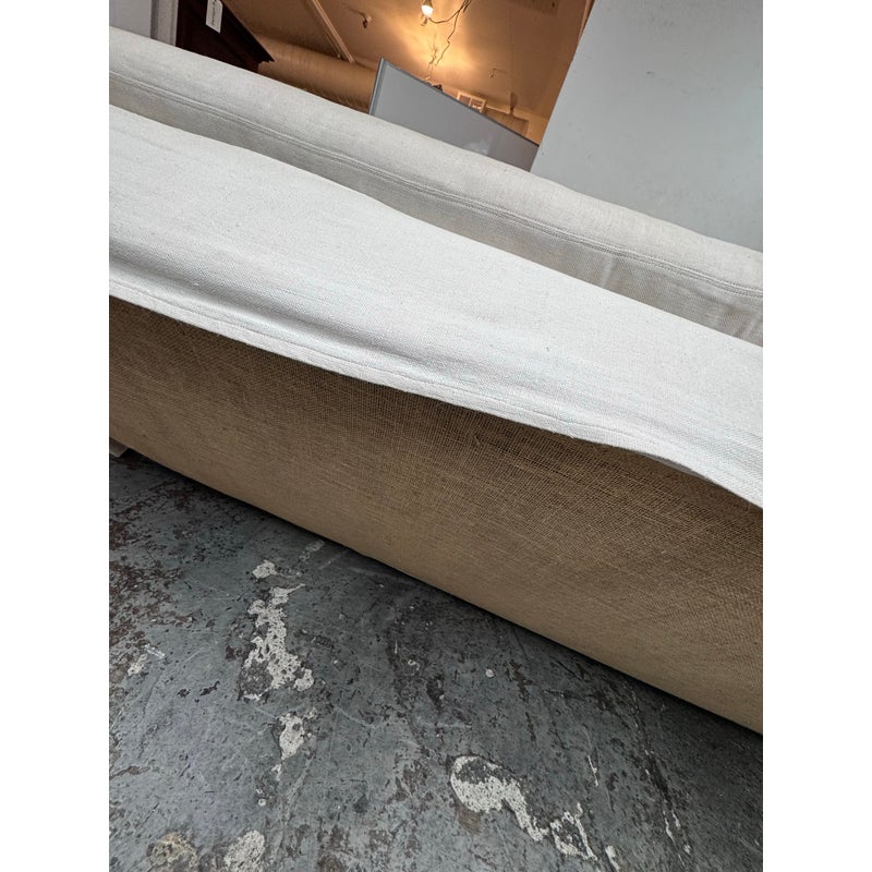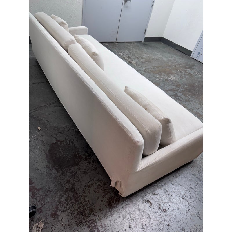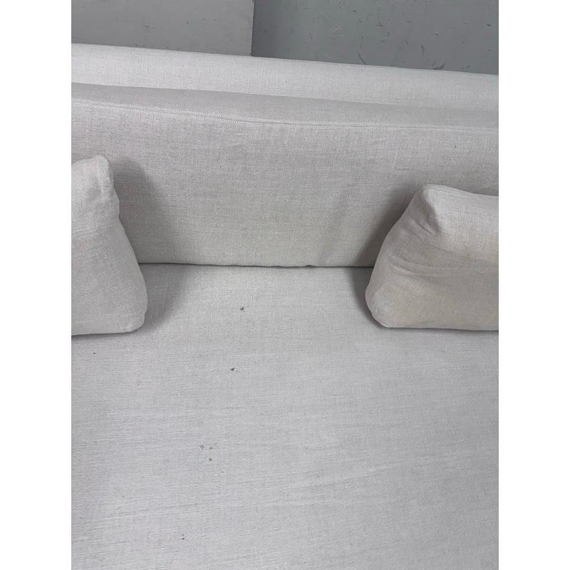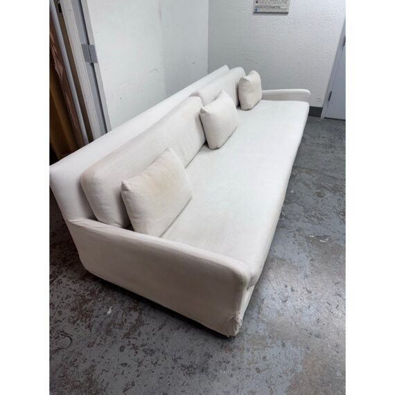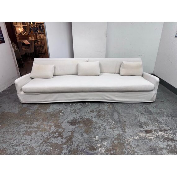 Design Plus Gallery presents the Millie Sofa by Verellen for Urban Natural. The Millie sofa has a sleek, modern design with clean lines, a low-profile silhouette, deep loose seating, and plush loose back cushions. Verellen offers the very best in luxurious comfort, original Belgian furniture design, and traditional American hand craftsmanship. Family-owned and operated in North Carolina, their heirloom-quality pieces are handmade with careful attention and thoughtful innovation that stands the test of time. The slipcovered sofa is wrapped entirely in Belgian Linen weave that has a singular bench seat cushion with a full width back cushion and three matching throw/lumbar pillows. Visible surface wear is present to the fabric and it is considered to be in fair condition. Would need a professional cleaning. Made in the USA.