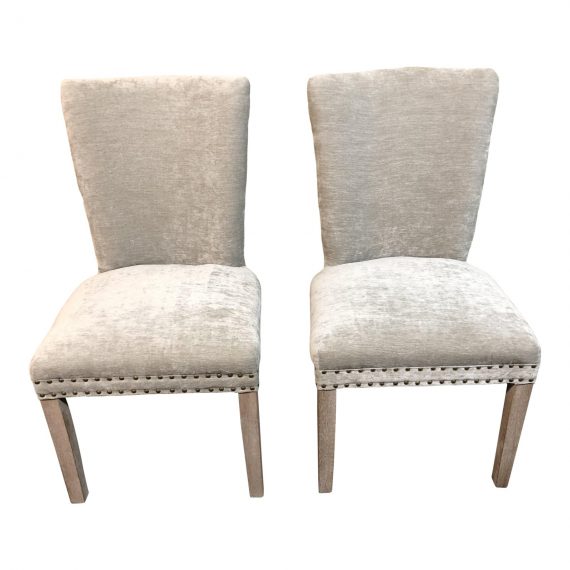 Design Plus Gallery presents a pair of Velvet Side Chairs. Simple lines are embellished with lush velvet and nail head trim. Great extra seating for dining room, parlor or guest rooms. Light wood legs