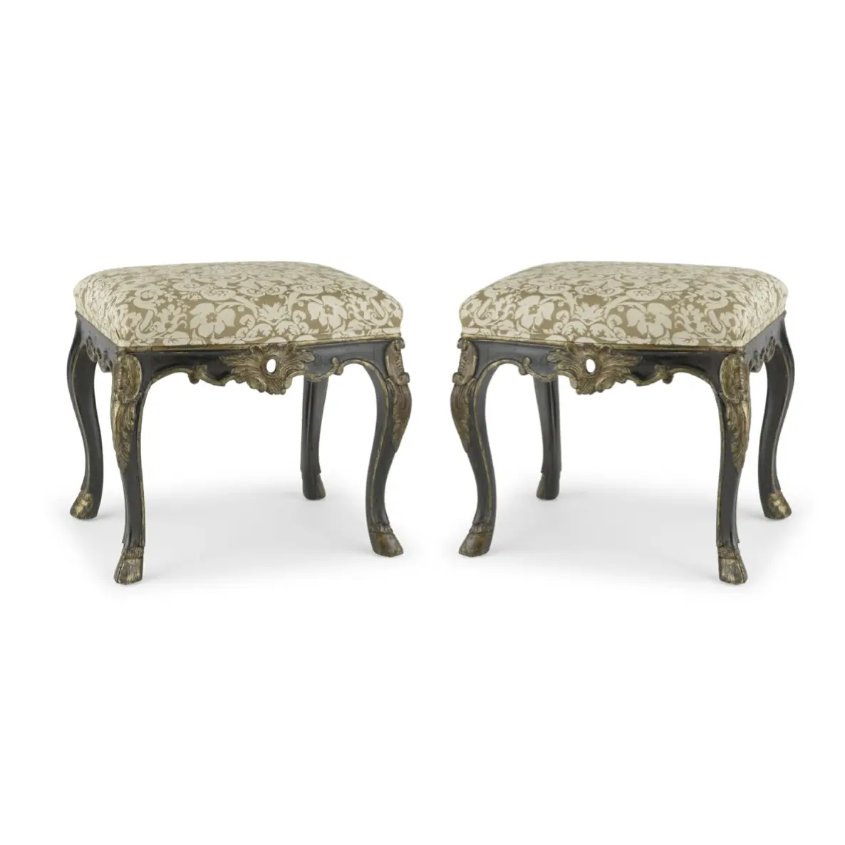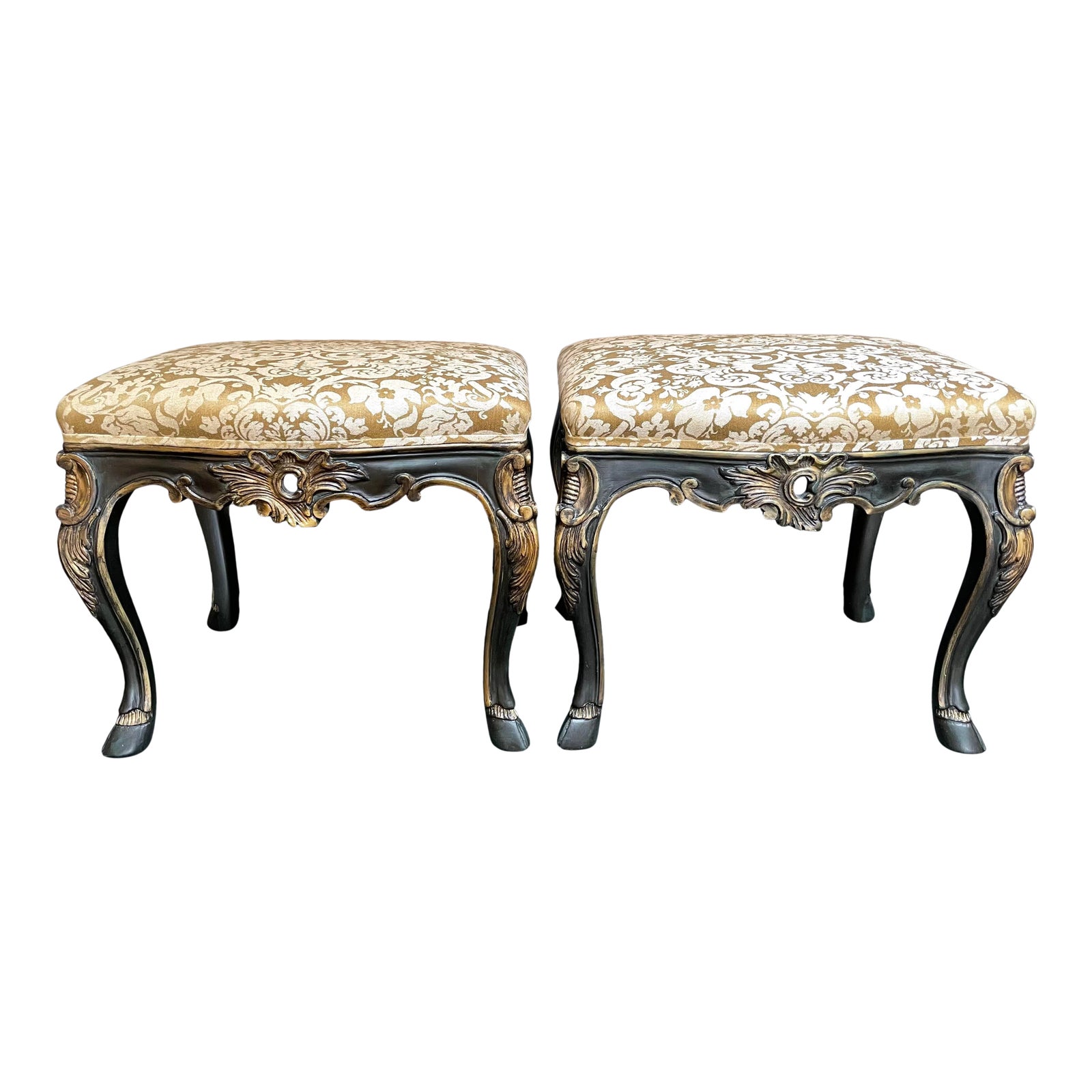 Design Plus Gallery presents a Pair of Michael S Smith for Jasper Furniture Venetian Painted Stools. Stools are carved with a centered cartouche with a Venetian bronze gilt and black paint application. Seats are upholstered with a Michael S. Smith Cornaro Damask Khaki which is 100% linen. Legs curve into hoofed feet for an added old world elegance. Minor wear on surfaces, stools are in good condition.